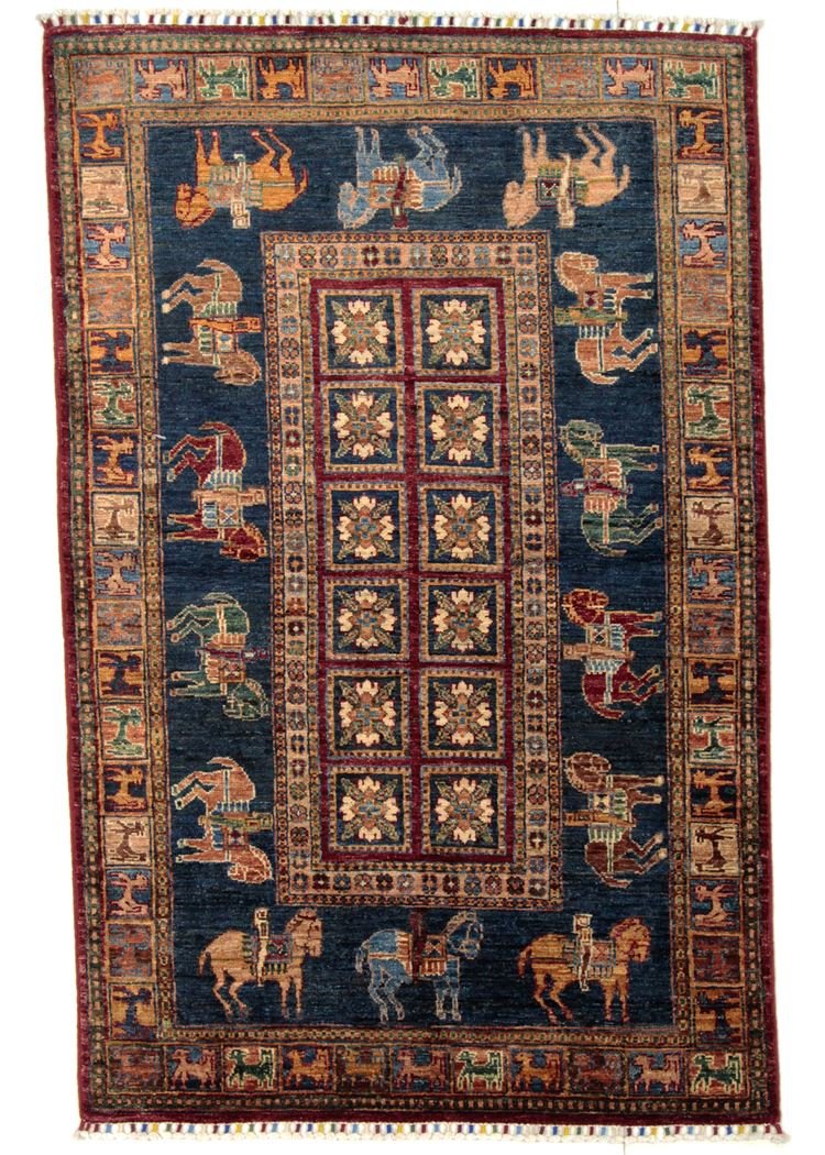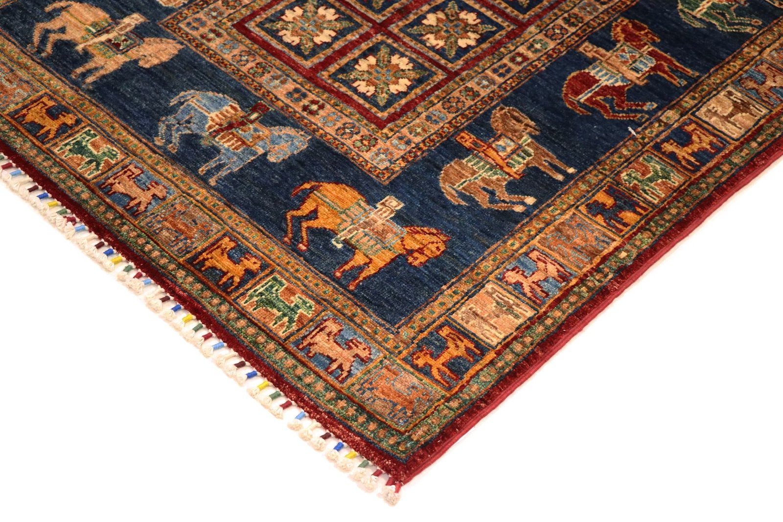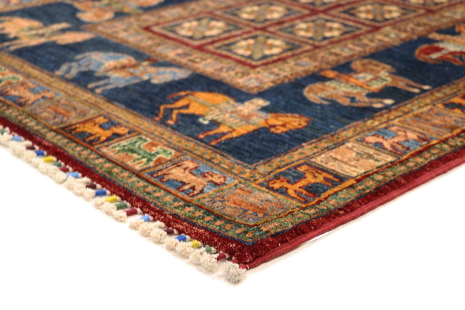 Khorjin carpets are made from hand-spun sheep’s wool of the highest quality, particularly in Iran, Afghanistan and Pakistan. Before the actual knotting process, the wool is spun by hand, which guarantees its exceptional quality. Wool is known for its natural, extremely durable properties such as dirt repellency and thermal insulation. In addition, wool is incredibly soft and gives the carpet a natural sheen. This traditional manufacturing method combines craftsmanship with the advantages of a material that has proven itself over centuries, both functionally and aesthetically. The Khorjin carpet thus embodies the craftsmanship and timeless beauty of handmade textiles made from natural raw materials.