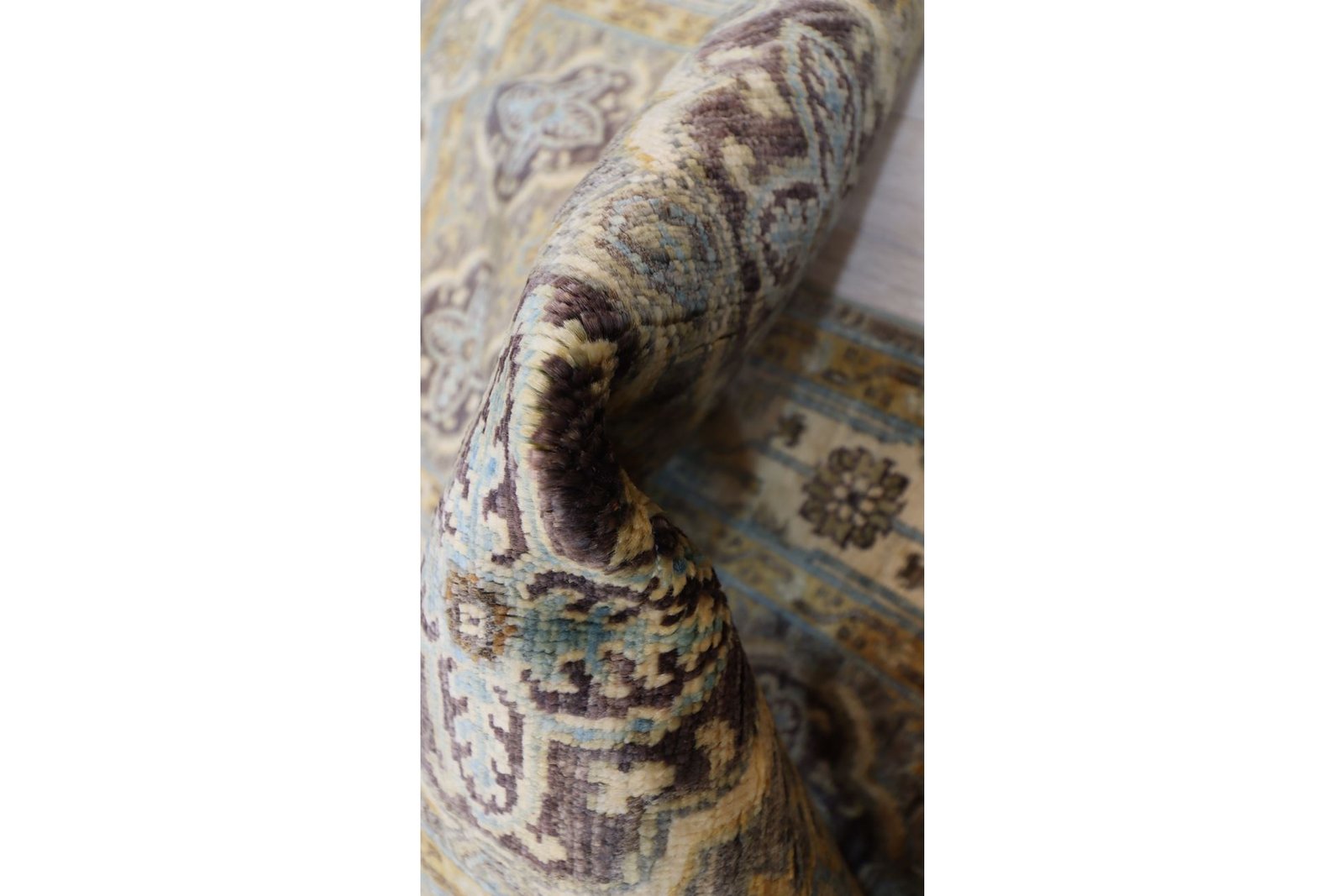 The Khorjin carpet, known for its high quality, is made from hand-spun sheep’s wool, mainly in Iran, Afghanistan and Pakistan. The wool is spun by hand before the actual knotting process, which requires traditional craftsmanship and the utmost care. Wool is a natural material that has proven itself over centuries, known for its durability, dirt-repellent properties and its ability to retain heat. In addition, wool is exceptionally soft and has a natural sheen that gives the carpet an elegant appearance. Khorjin carpets are often designed with traditional patterns and symbols that reflect stories and cultural meanings. These carpets are not only works of art, but also practical and durable floor coverings of special value.