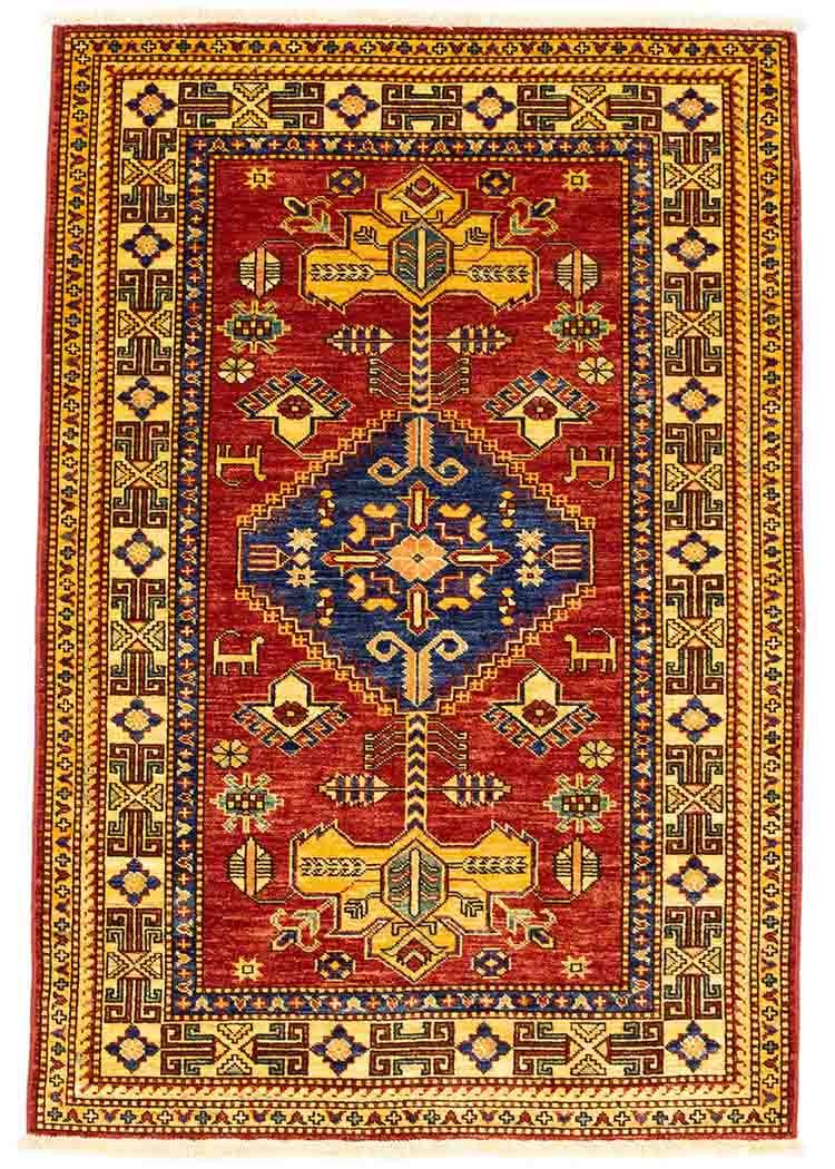 This hand-knotted Kazak carpet combines the traditional art of the Caucasus with impressive robustness and vibrant colours. Made in the style of historic Caucasian carpets, it reflects the cultural depth and craftsmanship of this region, which has been known for its carpet weaving for centuries. The simple but expressive patterns and intense colours make this carpet a sought-after gem in both the Orient and Europe. The careful workmanship and selected colour accents allow it to be easily integrated into modern interior design concepts. Its unique combination of traditional aesthetics and contemporary design makes this Kazak carpet an ideal addition to various living styles and interior design trends.
