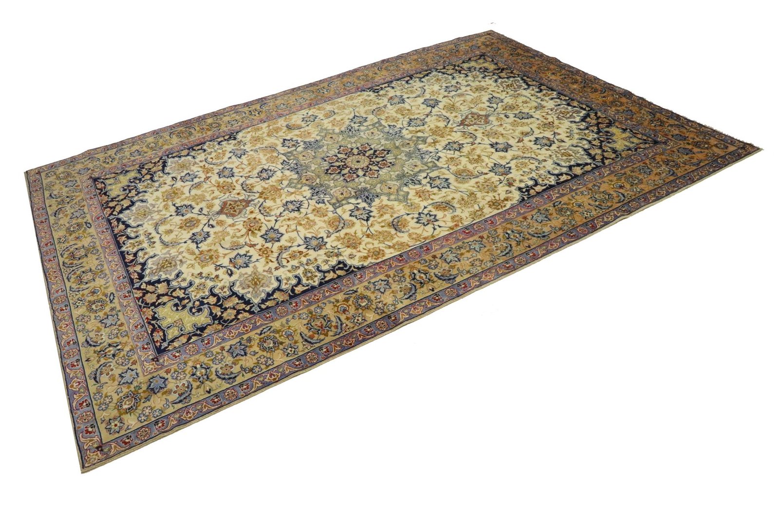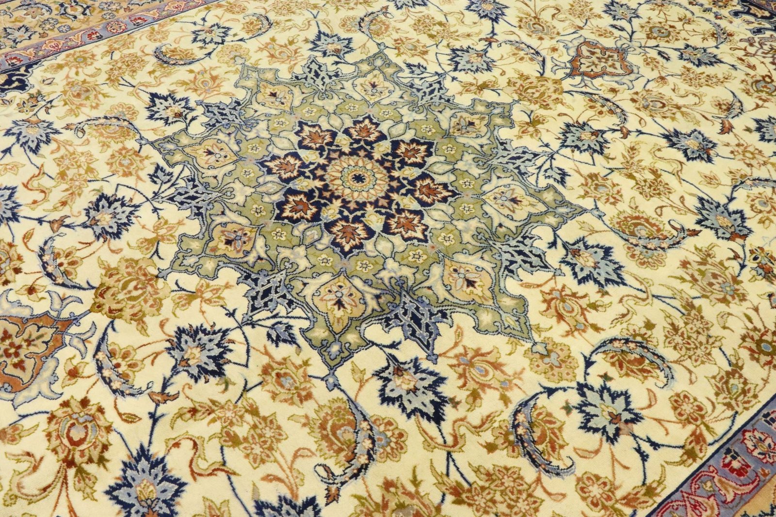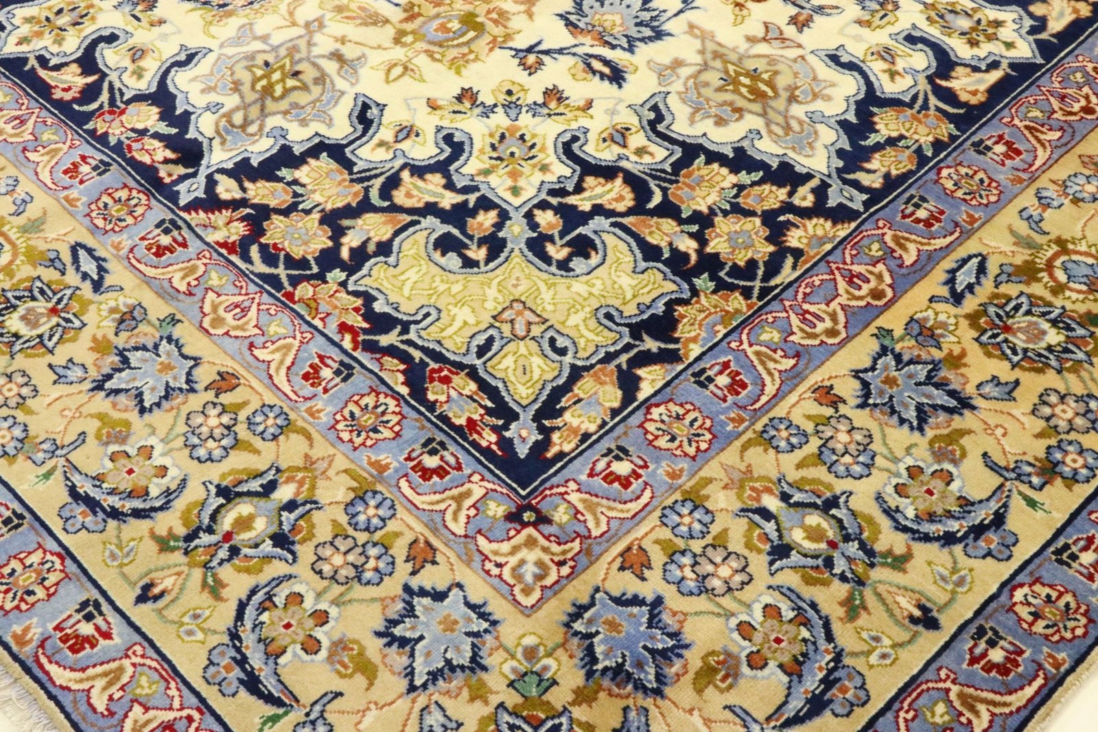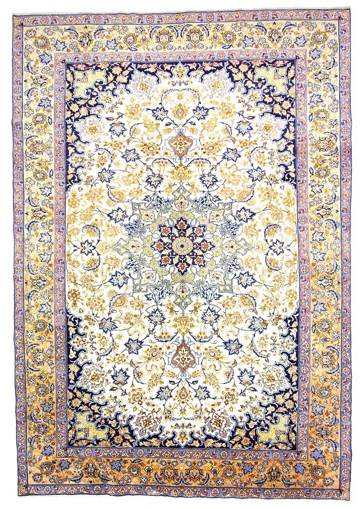 Carpets from Isfahan are among the most valuable hand-knotted Persian carpets in the world. The finest examples are made by renowned master weavers who achieve a knot density of over one million knots per square metre. An Isfahan carpet is a symbol of the highest artistry and tradition in carpet weaving. The designs of these carpets are often inspired by the magnificent mosques and squares of the city of the same name, giving each carpet a unique cultural significance. Owning an Isfahan carpet means owning a Persian carpet of incomparable quality and artistic beauty, which impresses with its fineness and historical connection to Isfahan.