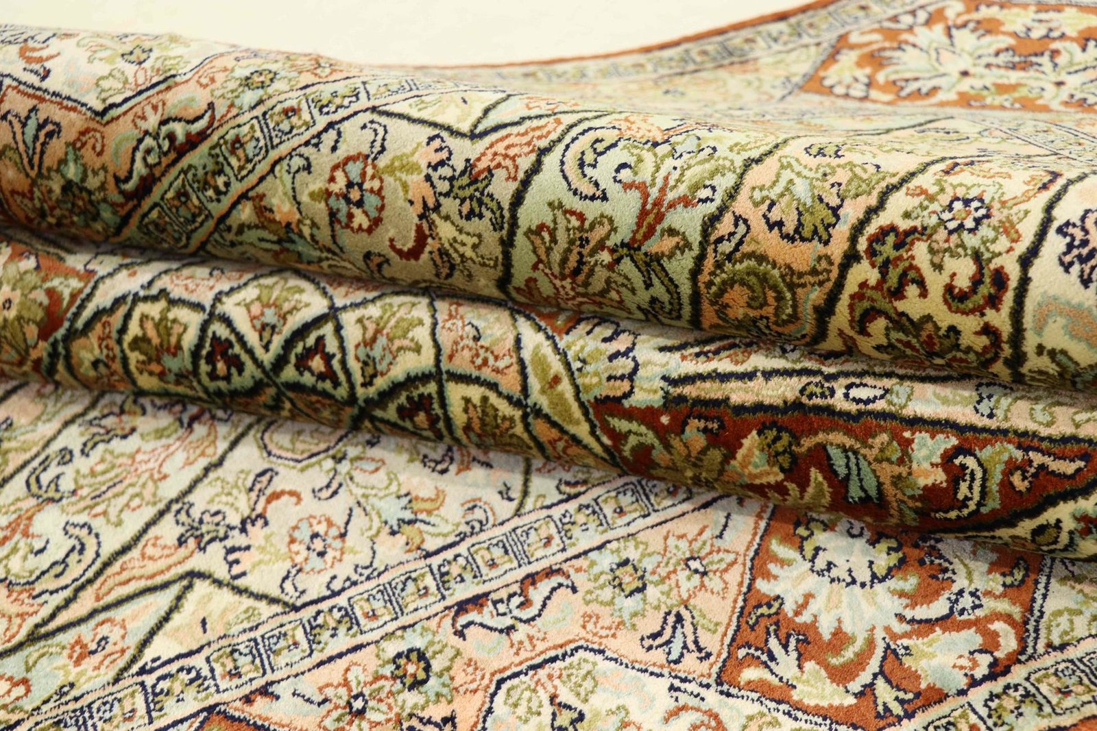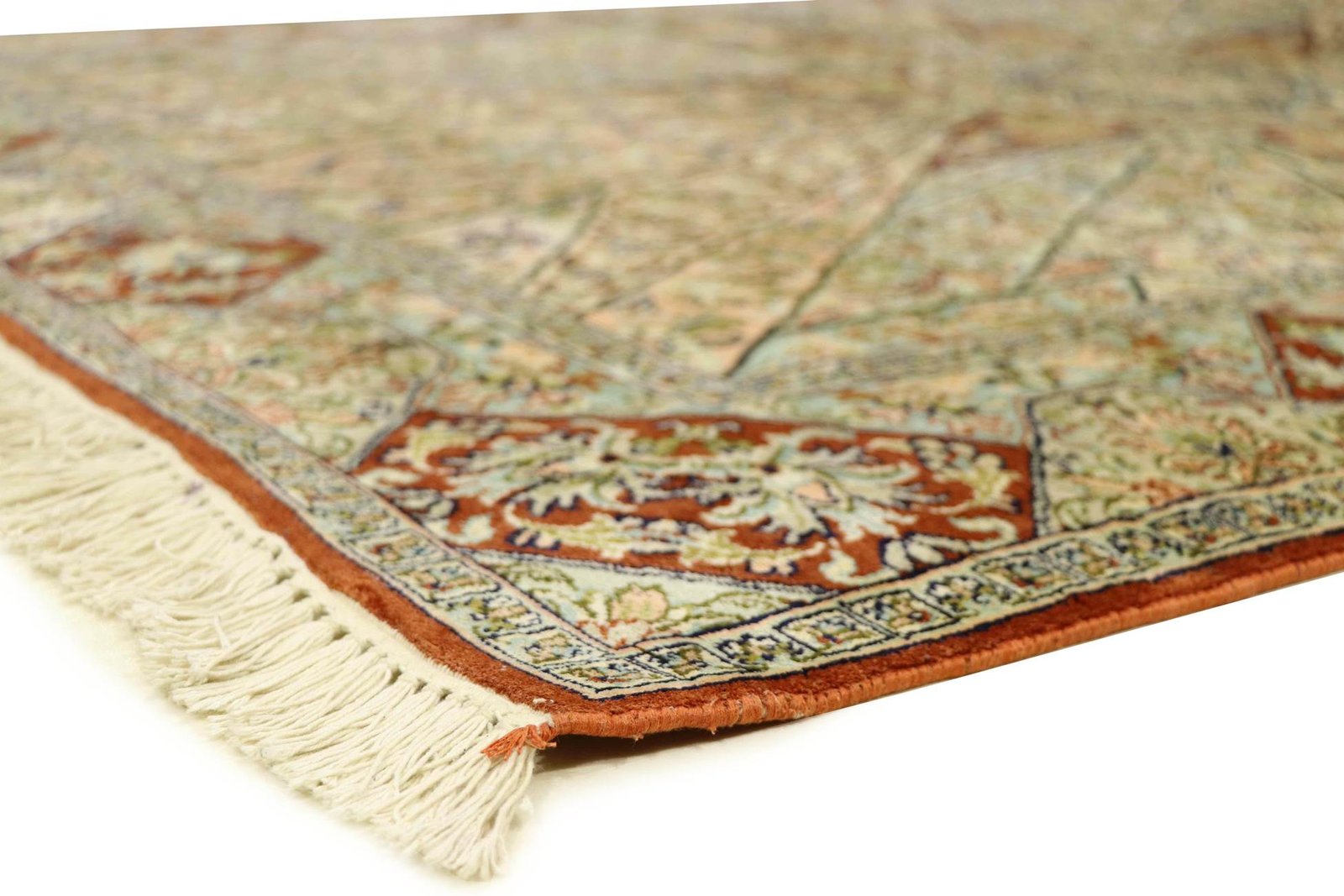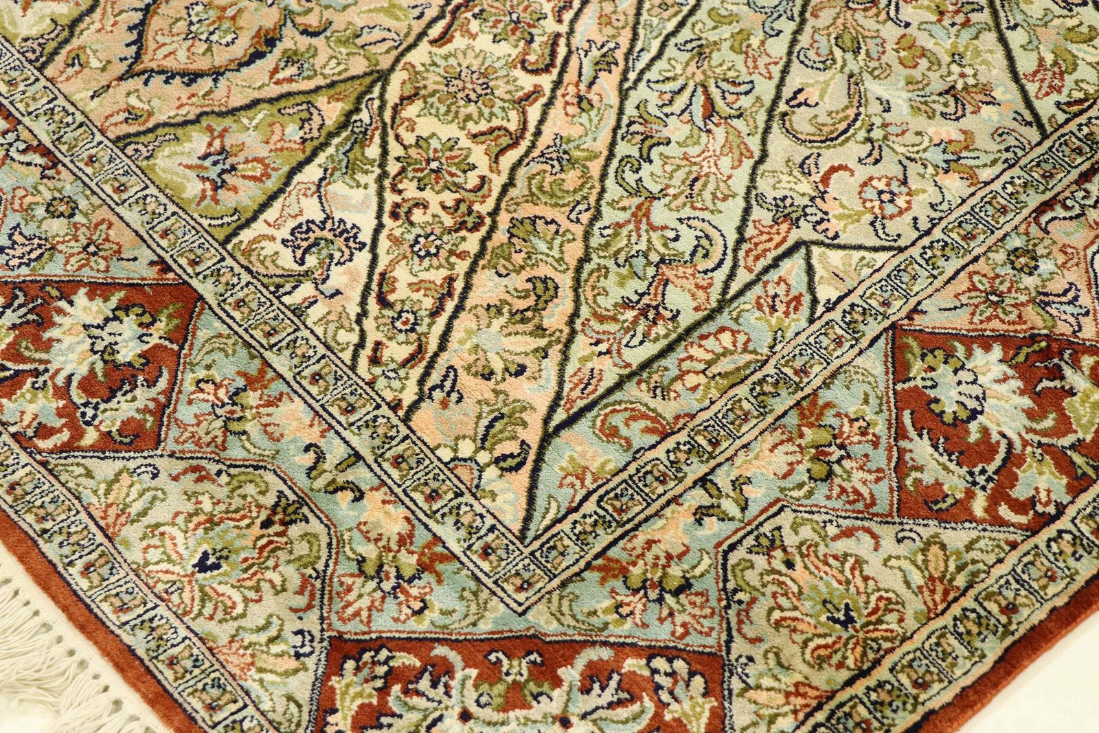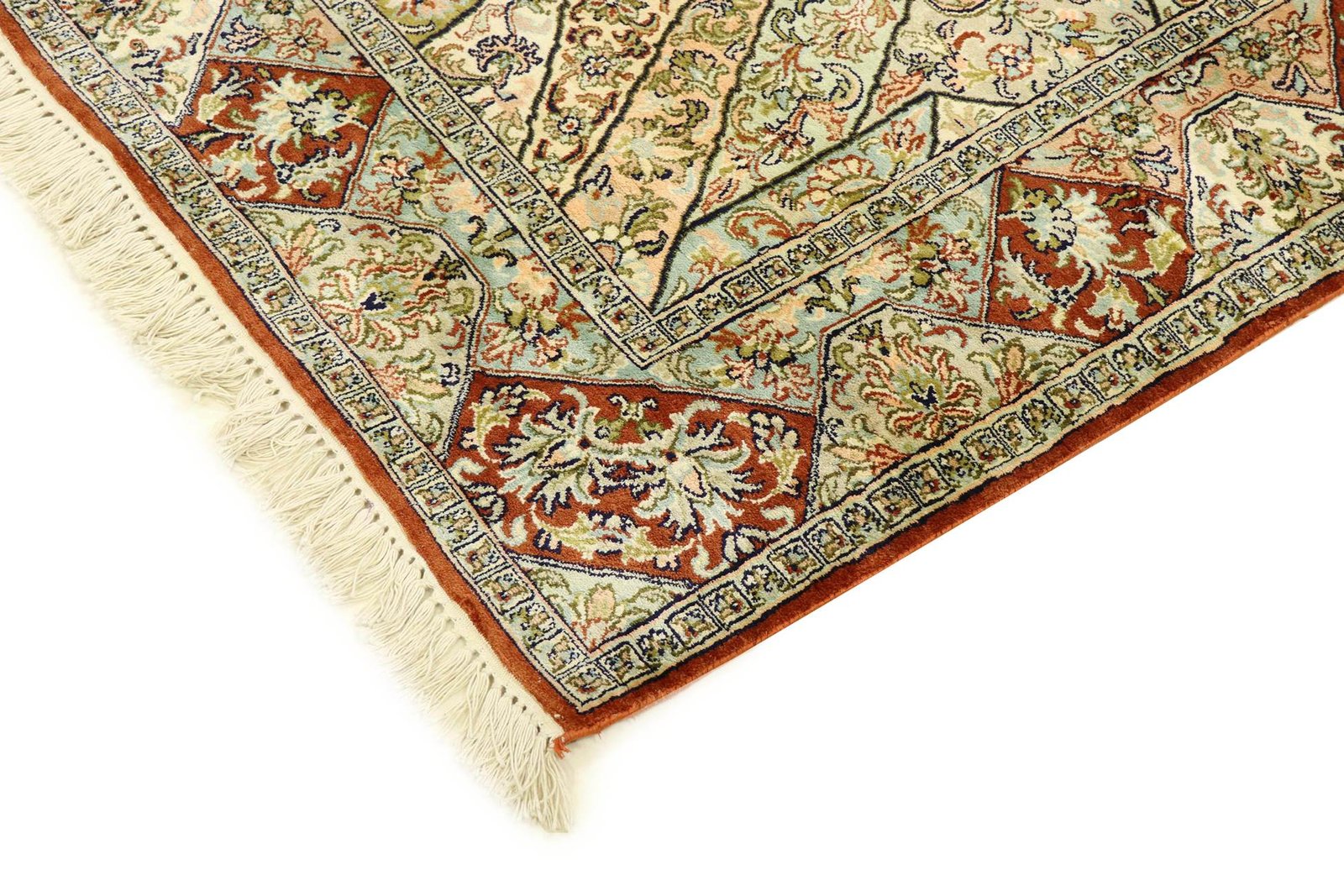 This hand-knotted silk carpet from Kashmir is a masterpiece of Indian carpet weaving. Made from pure silk with a fine knot density, its production requires outstanding skill. The soft natural silk is a fascinating highlight, its colours shimmering in a variety of facets depending on the incidence of light. Year after year, it impresses with new details and shades of colour. This carpet invites you to spend hours admiring it and offers an experience that cannot be captured in photographs.