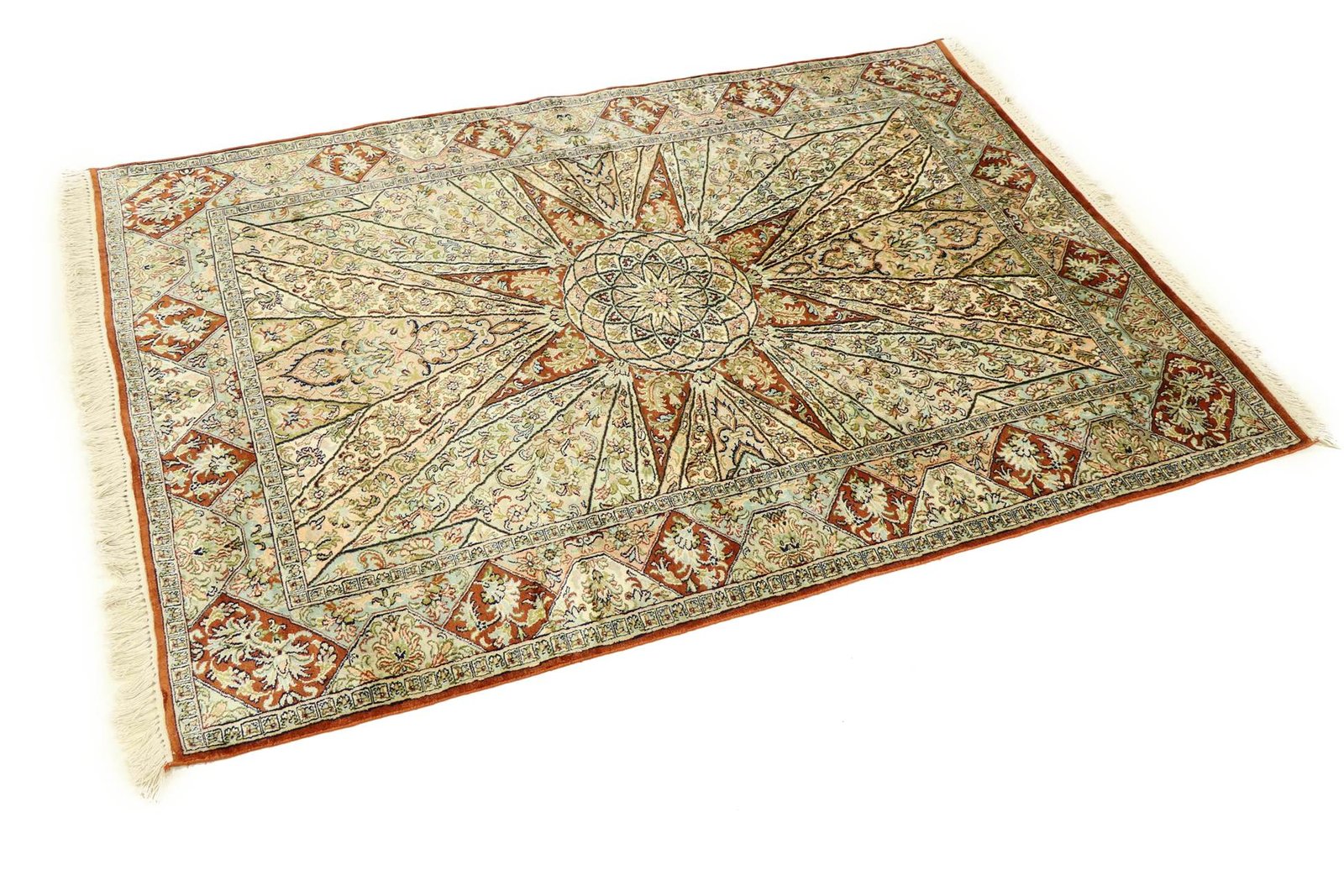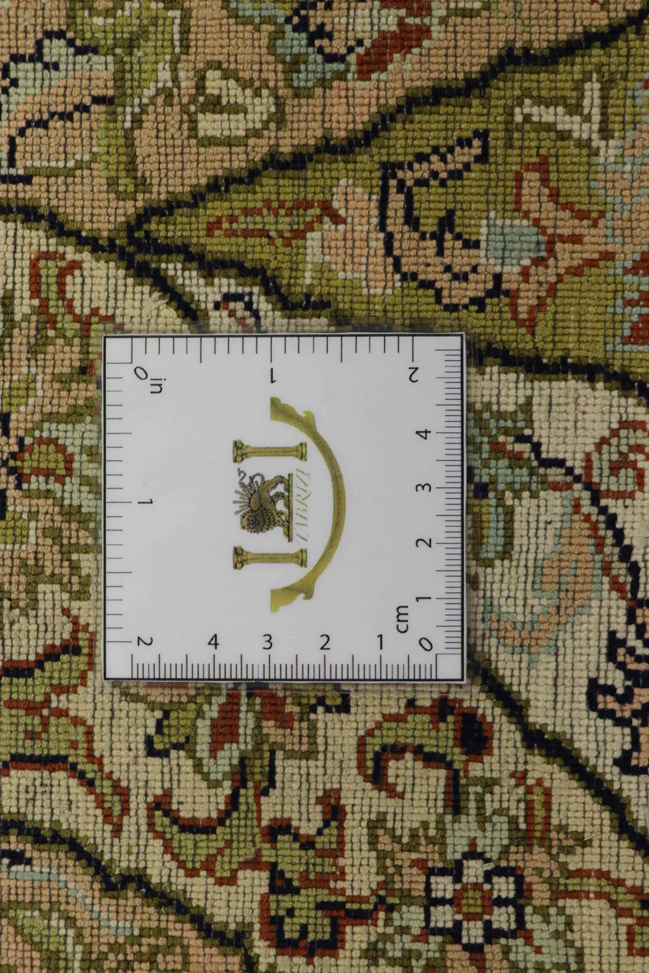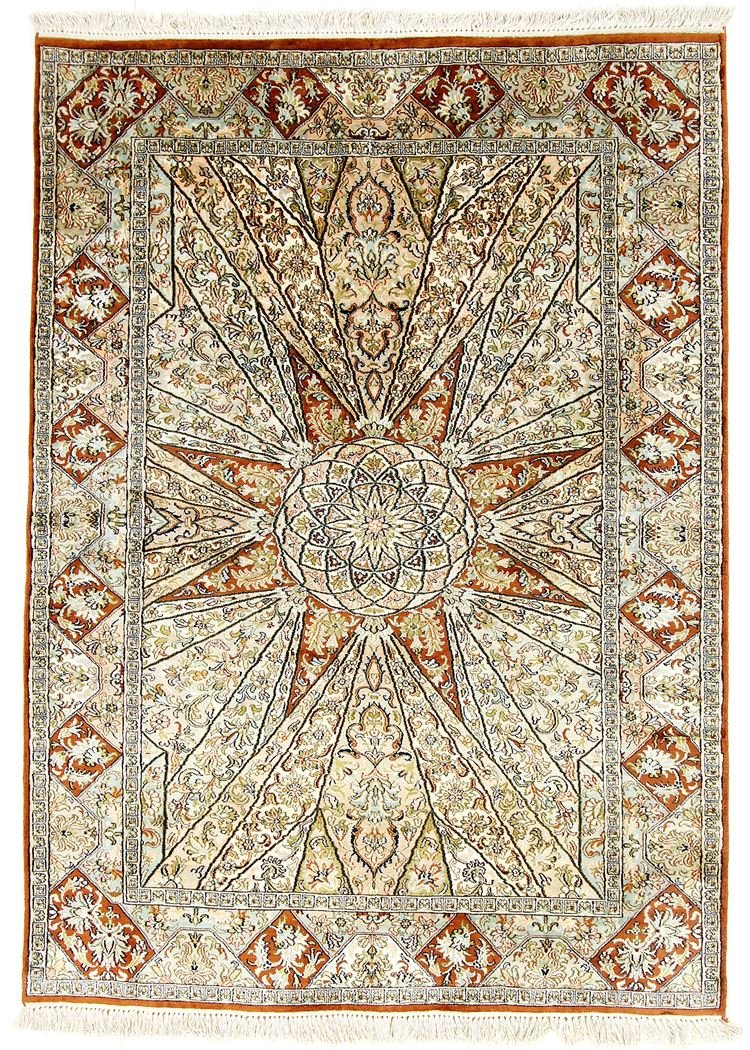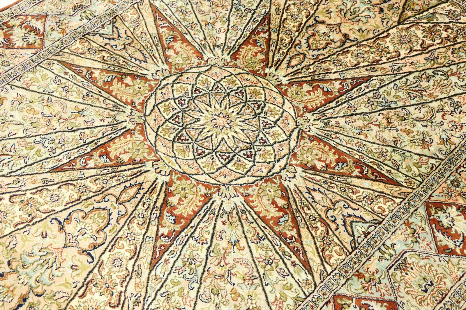 This hand-knotted silk carpet from Kashmir is a masterpiece of Indian carpet weaving. Made from pure silk with a fine knot density, its production requires outstanding skill. The soft natural silk is a fascinating highlight, its colours shimmering in a variety of facets depending on the incidence of light. Year after year, it impresses with new details and shades of colour. This carpet invites you to spend hours admiring it and offers an experience that cannot be captured in photographs.