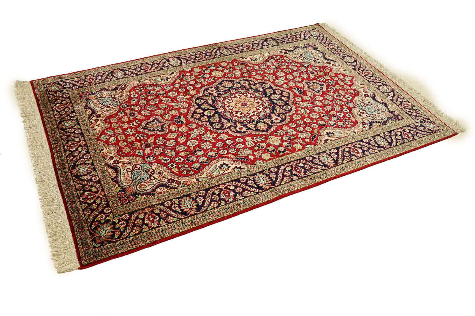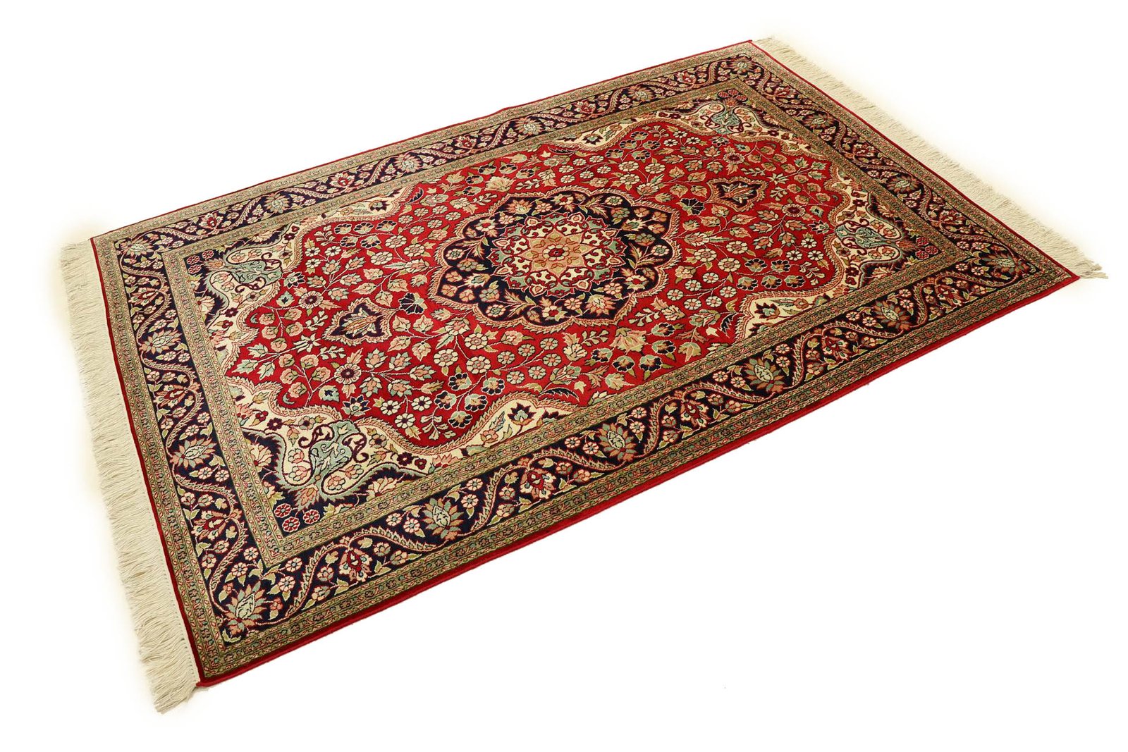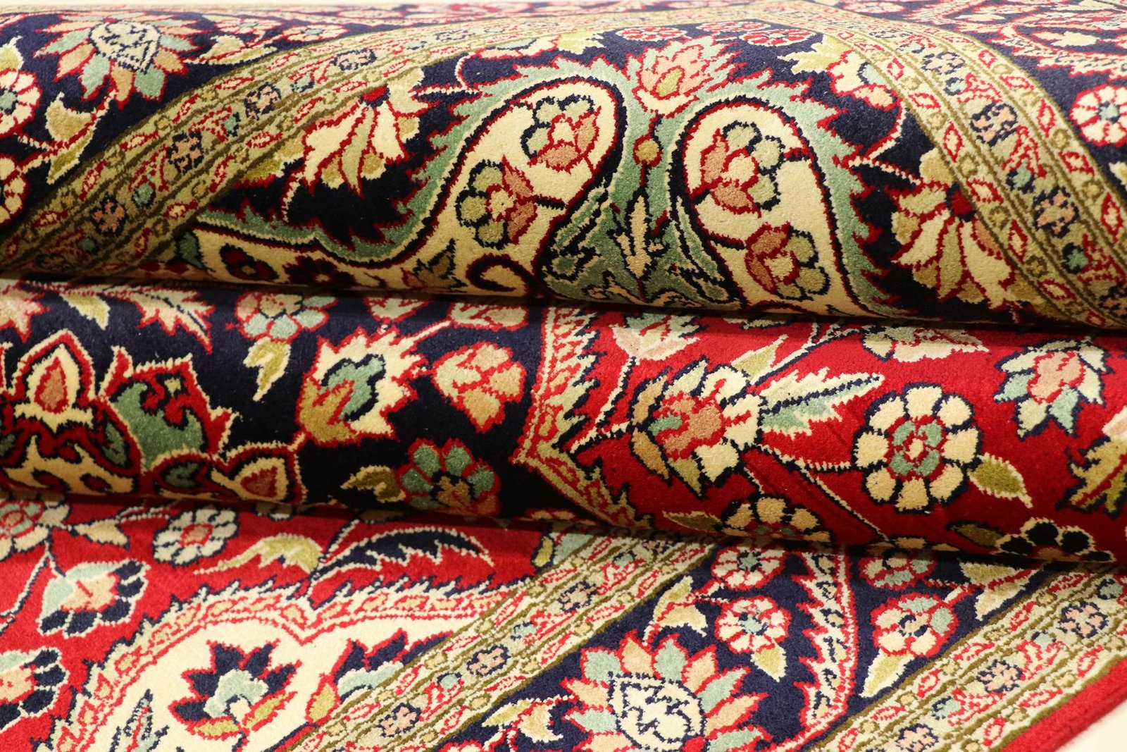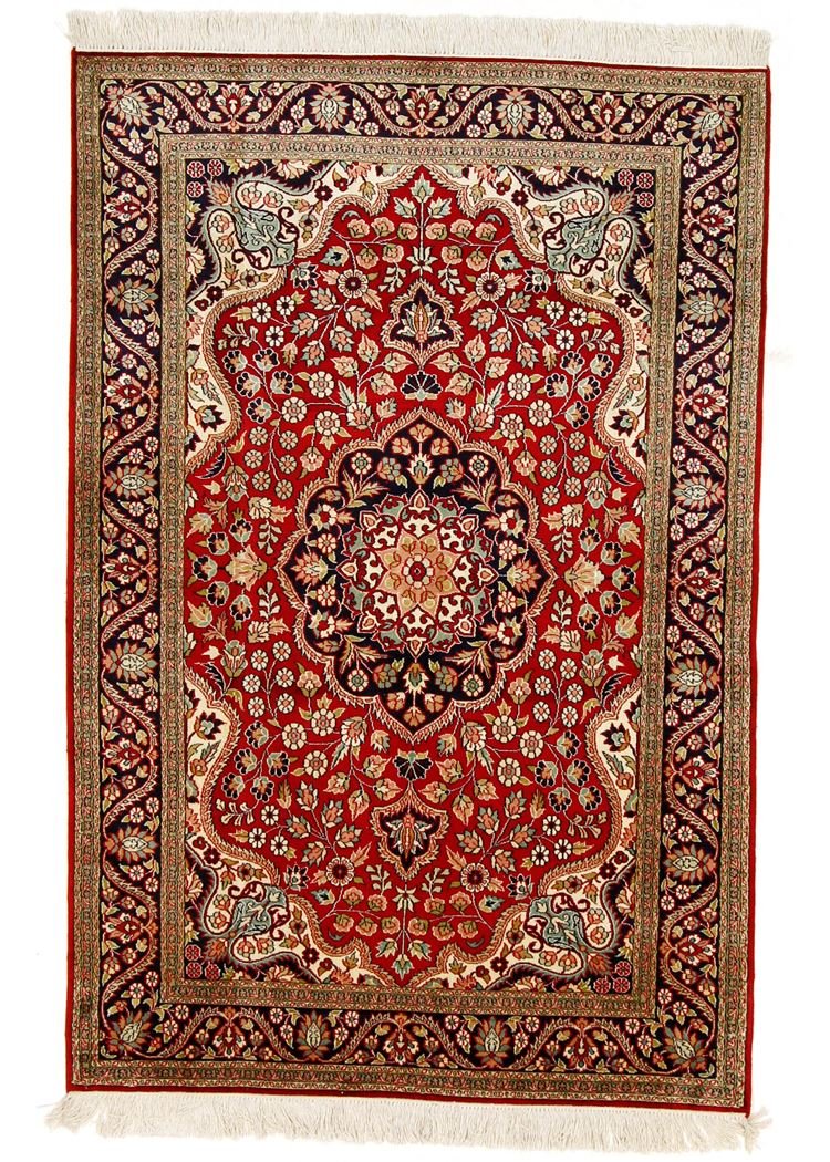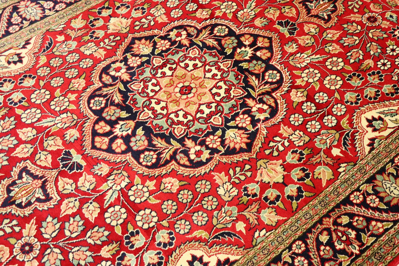 This hand-knotted silk carpet from Kashmir is a work of art that reflects the skills of Indian carpet weavers. Made of pure silk and featuring a particularly fine knot density, it is a masterpiece that only experienced craftsmen can create. The fine natural silk is not only exceptionally soft, but also allows the colours to shine in a variety of facets. Depending on the incidence of light, new details and shades appear that remain impressive even after years. This carpet invites you to spend hours admiring it and offers an experience that cannot be captured in a photograph.