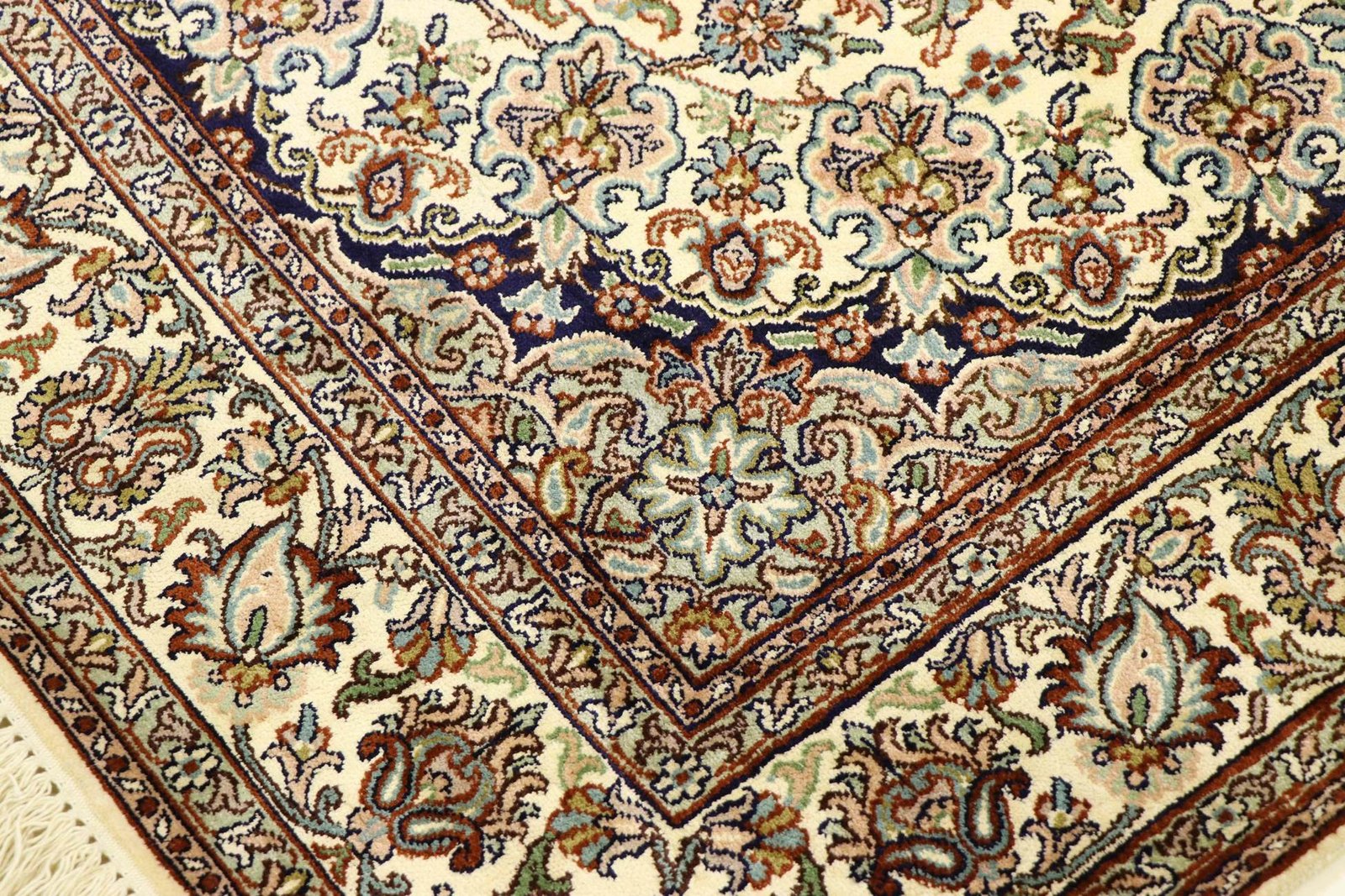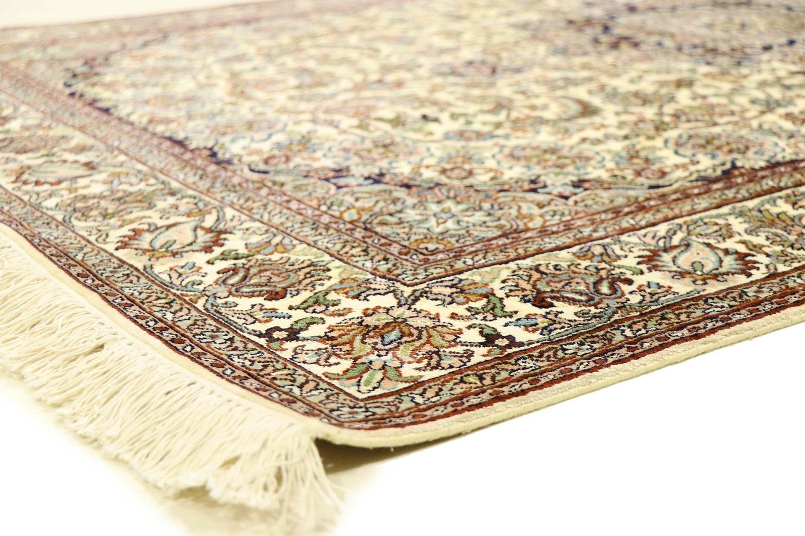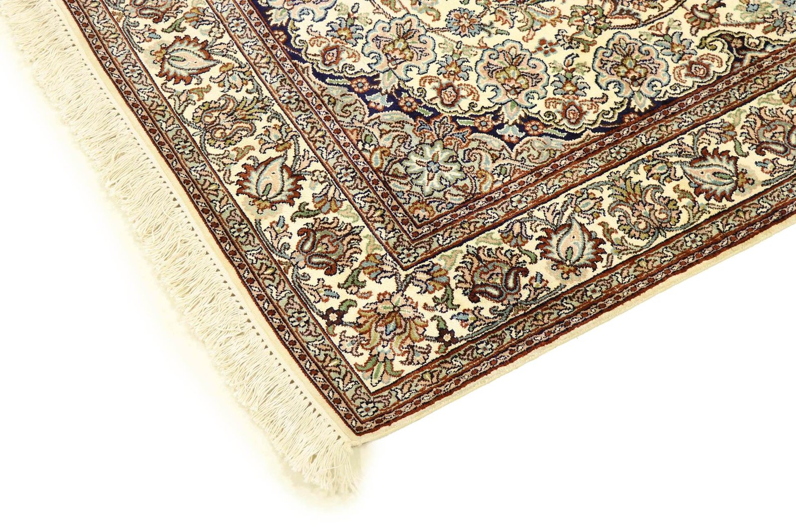 This hand-knotted silk carpet from Kashmir is an outstanding example of the art of Indian carpet weaving. Made from pure silk with an extremely fine knot density, it showcases the highest level of craftsmanship. The fine natural silk is not only exceptionally soft, but also allows its colours to shine in a multitude of facets. Changing light reveals new details and shades that remain fascinating even after years. This carpet invites you to spend hours admiring it and offers an experience that makes you forget the passage of time – a pleasure that cannot be captured in a photograph.