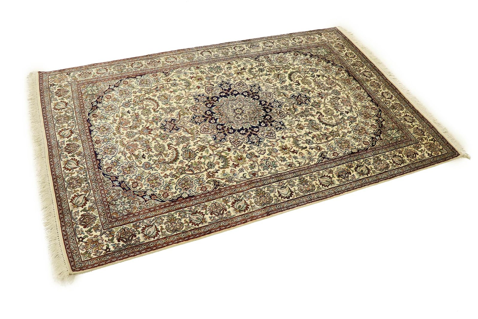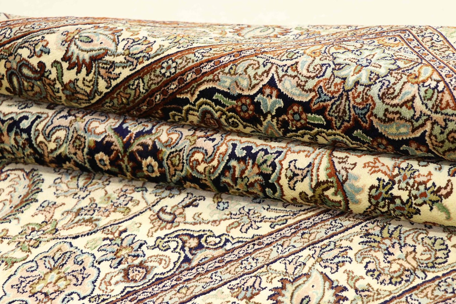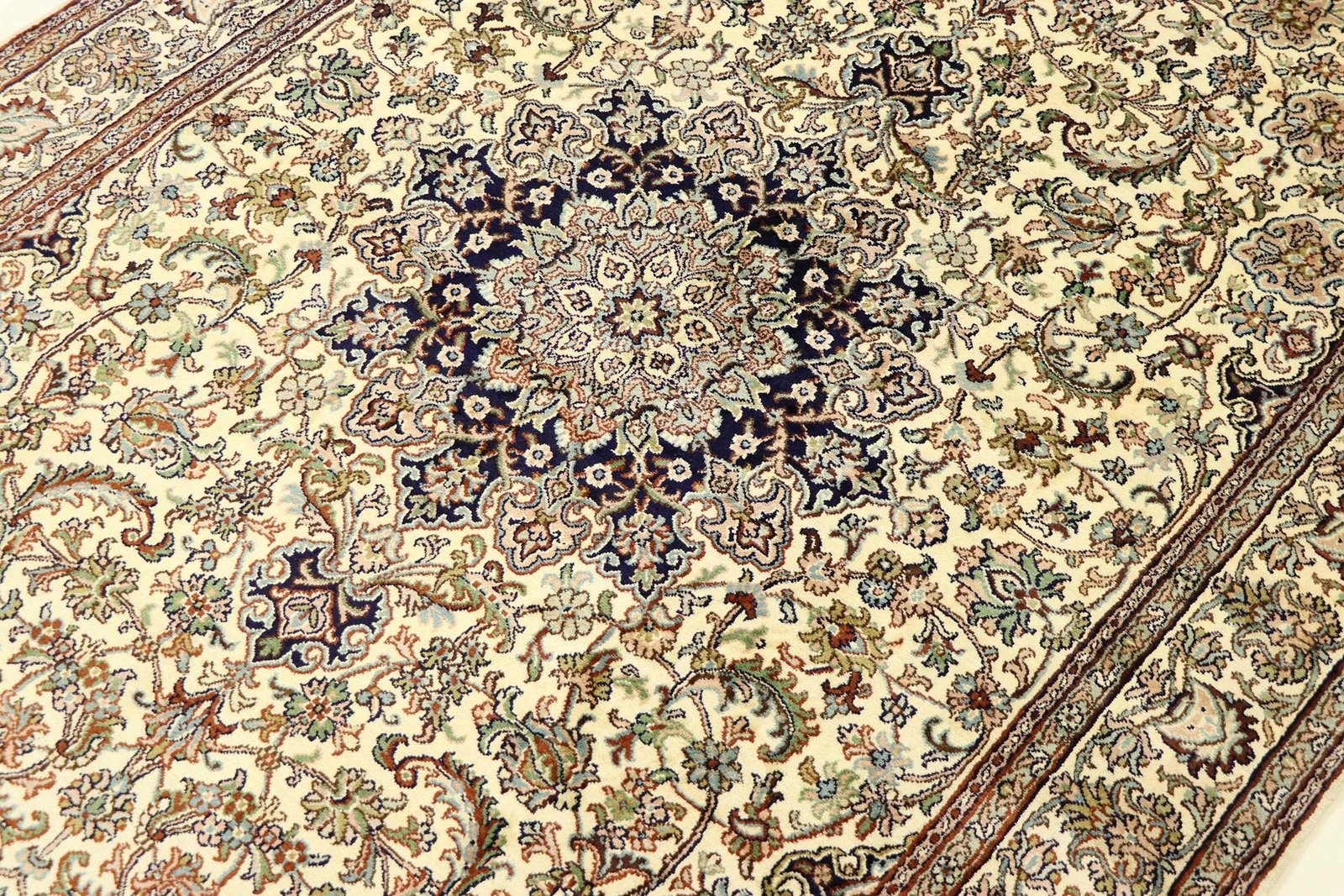 This hand-knotted silk carpet from Kashmir is an outstanding example of the art of Indian carpet weaving. Made from pure silk with an extremely fine knot density, it showcases the highest level of craftsmanship. The fine natural silk is not only exceptionally soft, but also allows its colours to shine in a multitude of facets. Changing light reveals new details and shades that remain fascinating even after years. This carpet invites you to spend hours admiring it and offers an experience that makes you forget the passage of time – a pleasure that cannot be captured in a photograph.