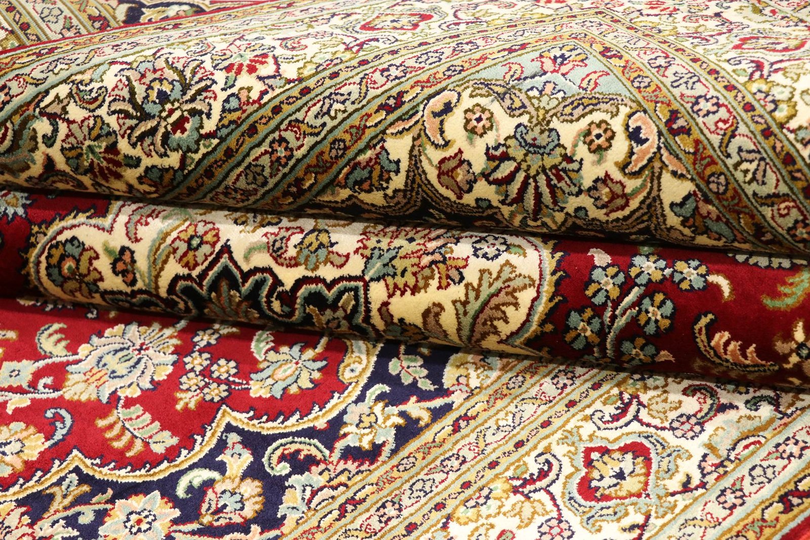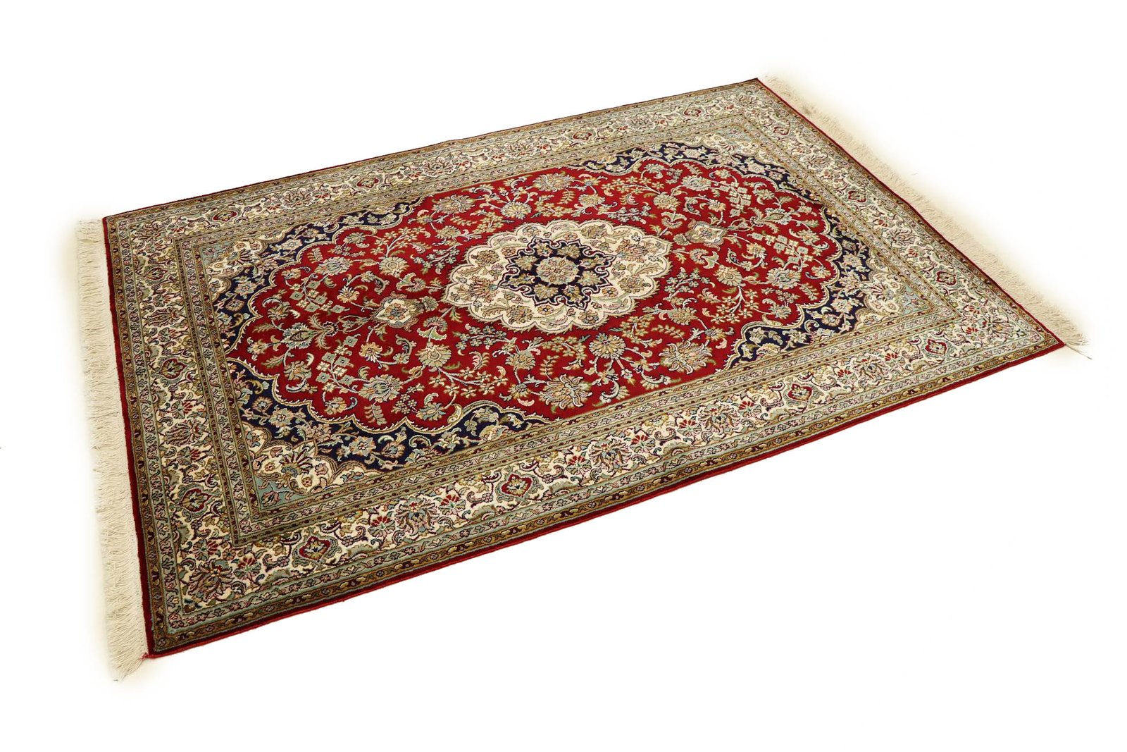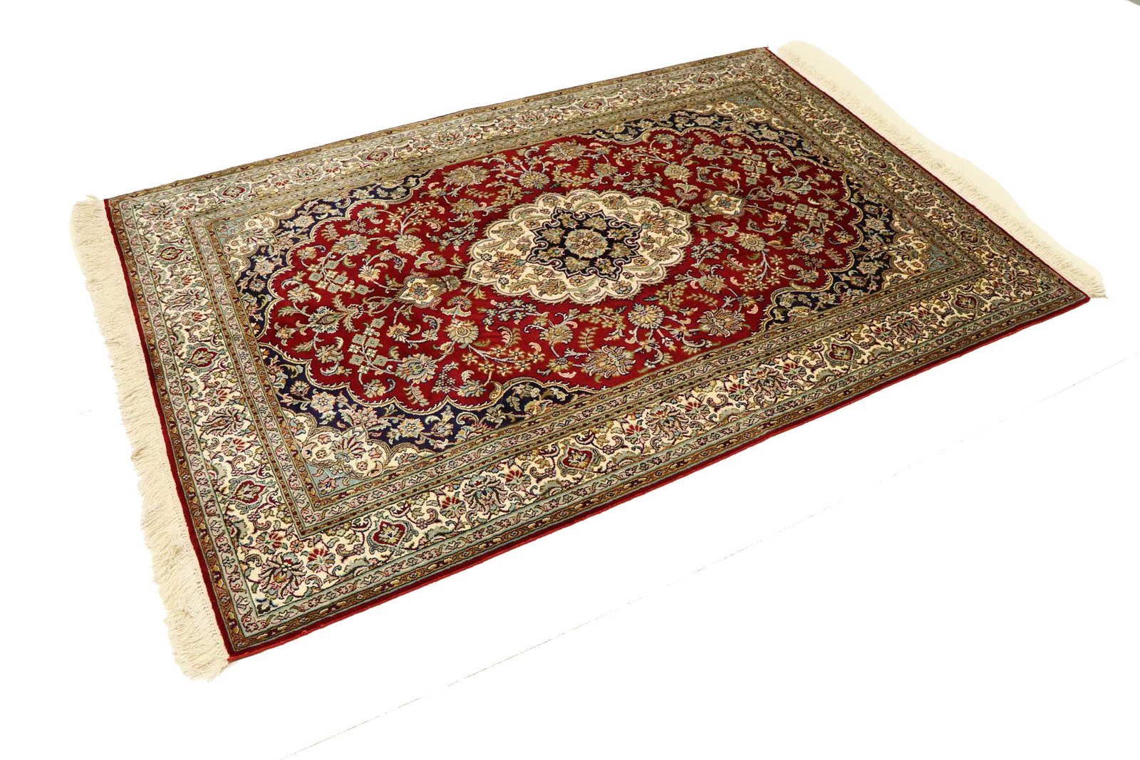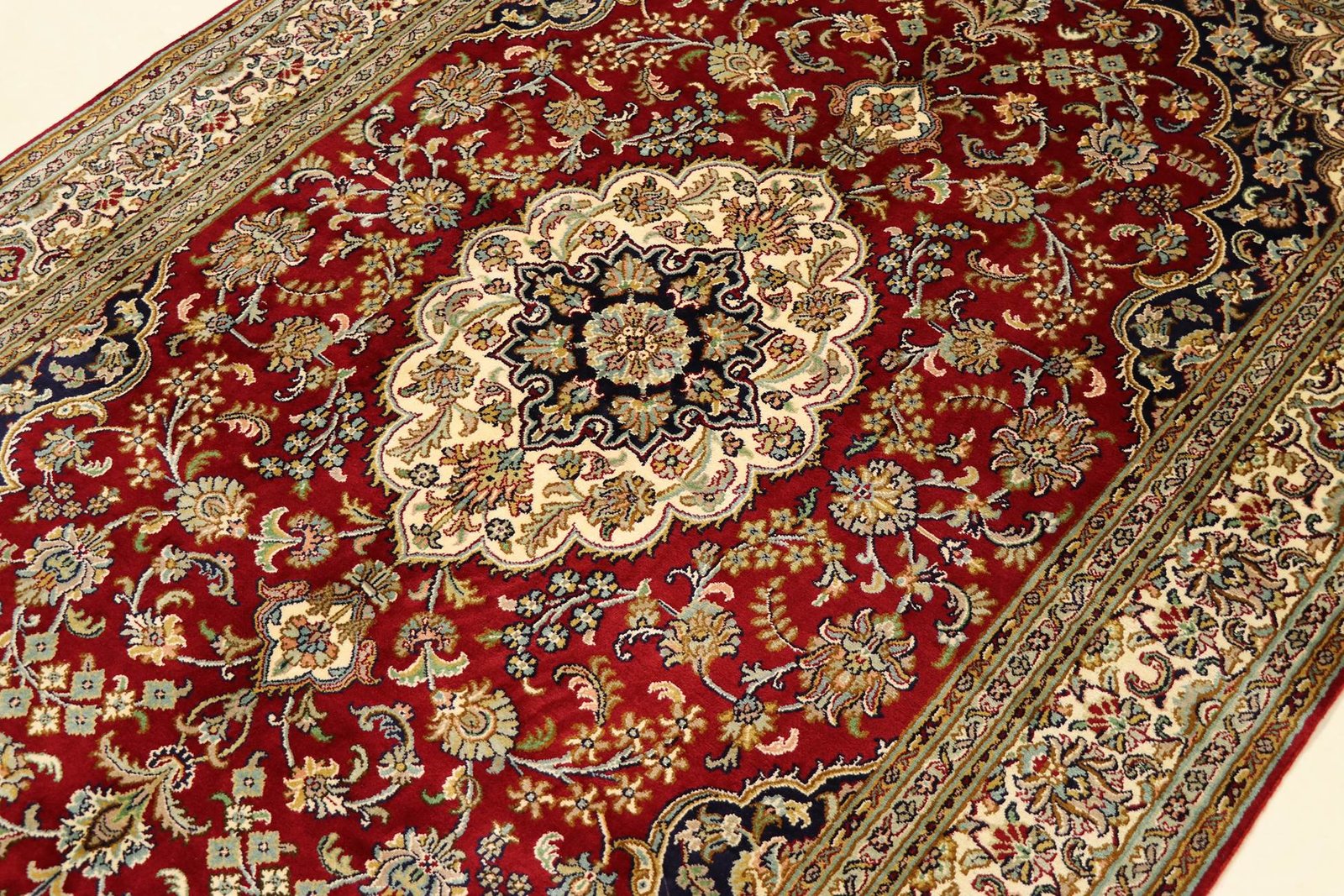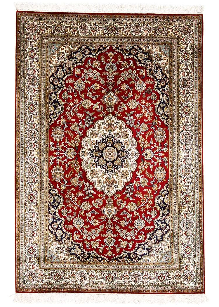 This hand-knotted silk carpet from Kashmir is an impressive example of the art of Indian carpet weaving. Made from pure silk with an exceptionally fine knot density, it requires the skill of experienced craftsmen. The delicate natural silk is not only pleasantly soft, but also allows its colours to shimmer in a variety of facets. Under different lighting conditions, new details and colour nuances are revealed that remain impressive even after years. This carpet invites you to spend hours admiring it and offers an experience that cannot be captured in a photograph – a moment of fascination and wonder at the mastery and beauty of craftsmanship.