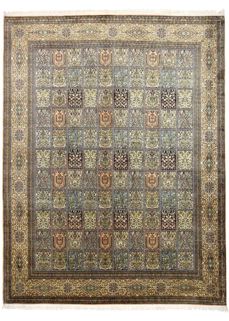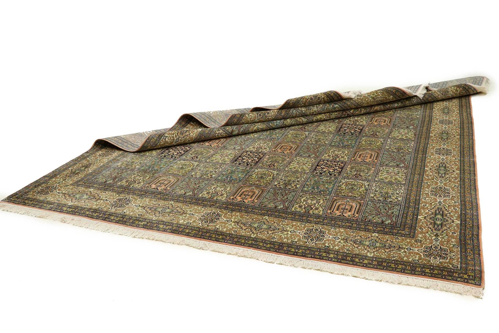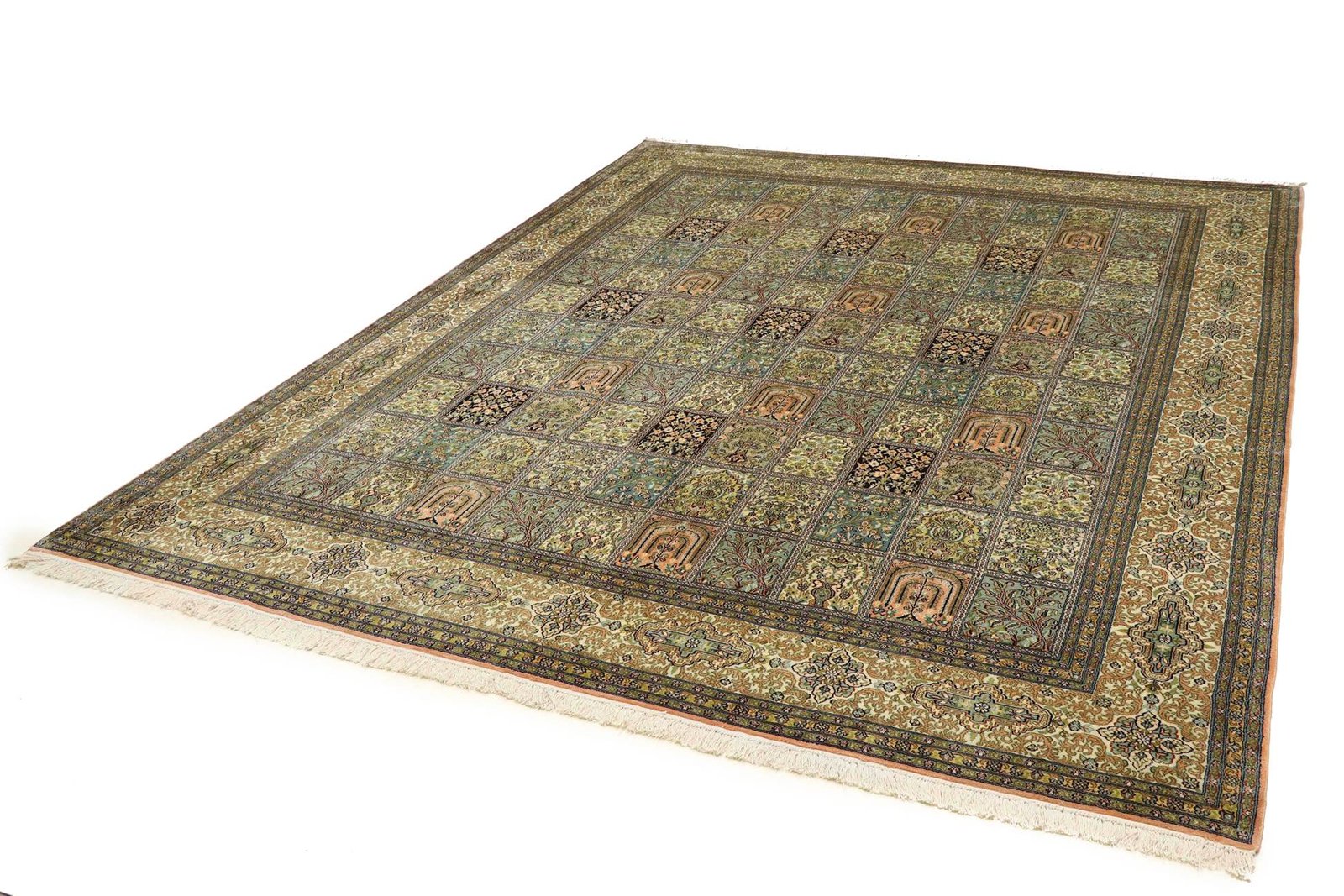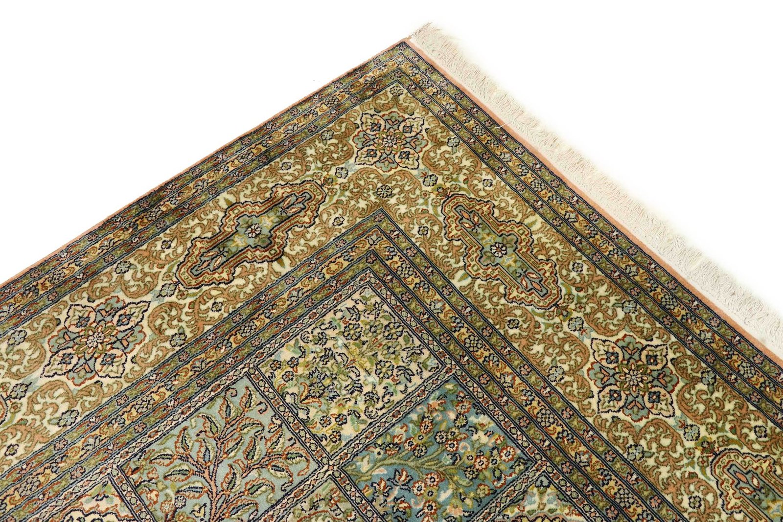 This hand-knotted silk carpet from Kashmir is an impressive example of the skill of Indian carpet weavers. Made from pure silk and with an exceptionally fine knot density, its production requires a great deal of experience. The fine natural silk is not only incredibly soft, but also allows its colours to shine in a multitude of facets. As the light changes, new details and shades are revealed that remain impressive even after years. This carpet invites you to spend hours admiring it and offers an experience that makes you forget the passage of time – a fascinating work of art that cannot be captured in a photograph.