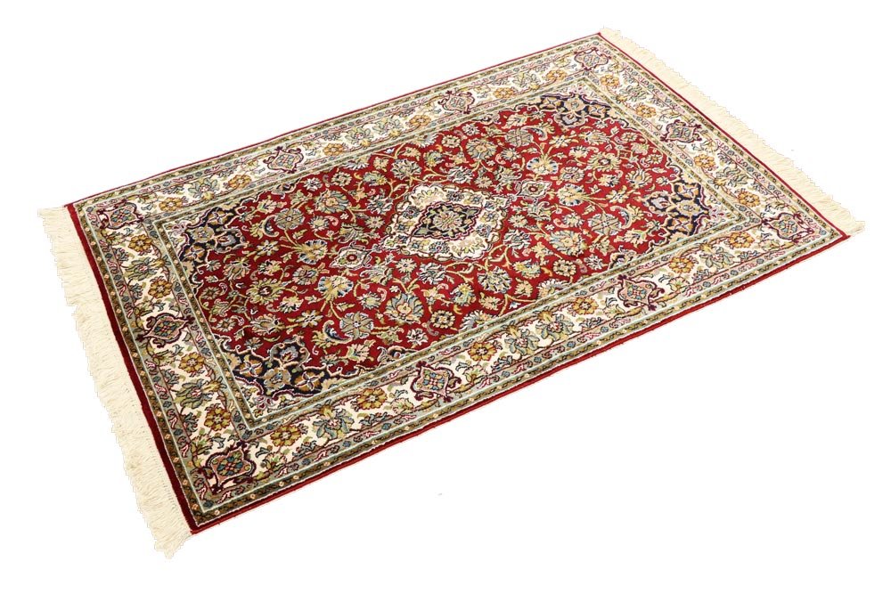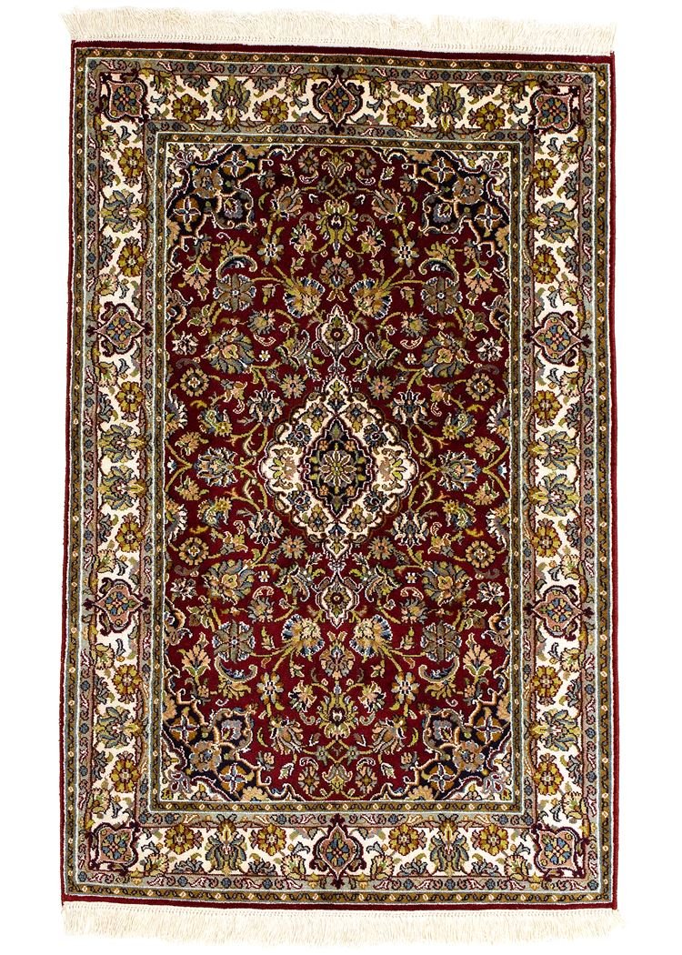 This hand-knotted silk carpet from Kashmir is a masterpiece of Indian carpet weaving. Made from pure silk with an exceptionally high knot density, it demonstrates the skill of experienced craftsmen. The fine natural silk emphasises its soft feel and allows its colours to shine in a variety of facets. Under different lighting conditions, new details and shades of colour are revealed that remain fascinating even after years. This carpet invites you to spend hours looking at it, forgetting the passage of time – an experience that cannot be fully captured by any photograph.