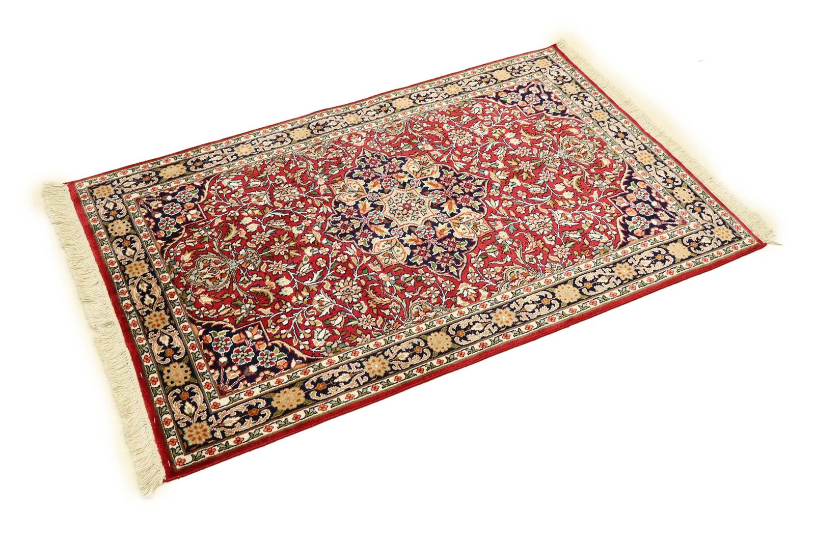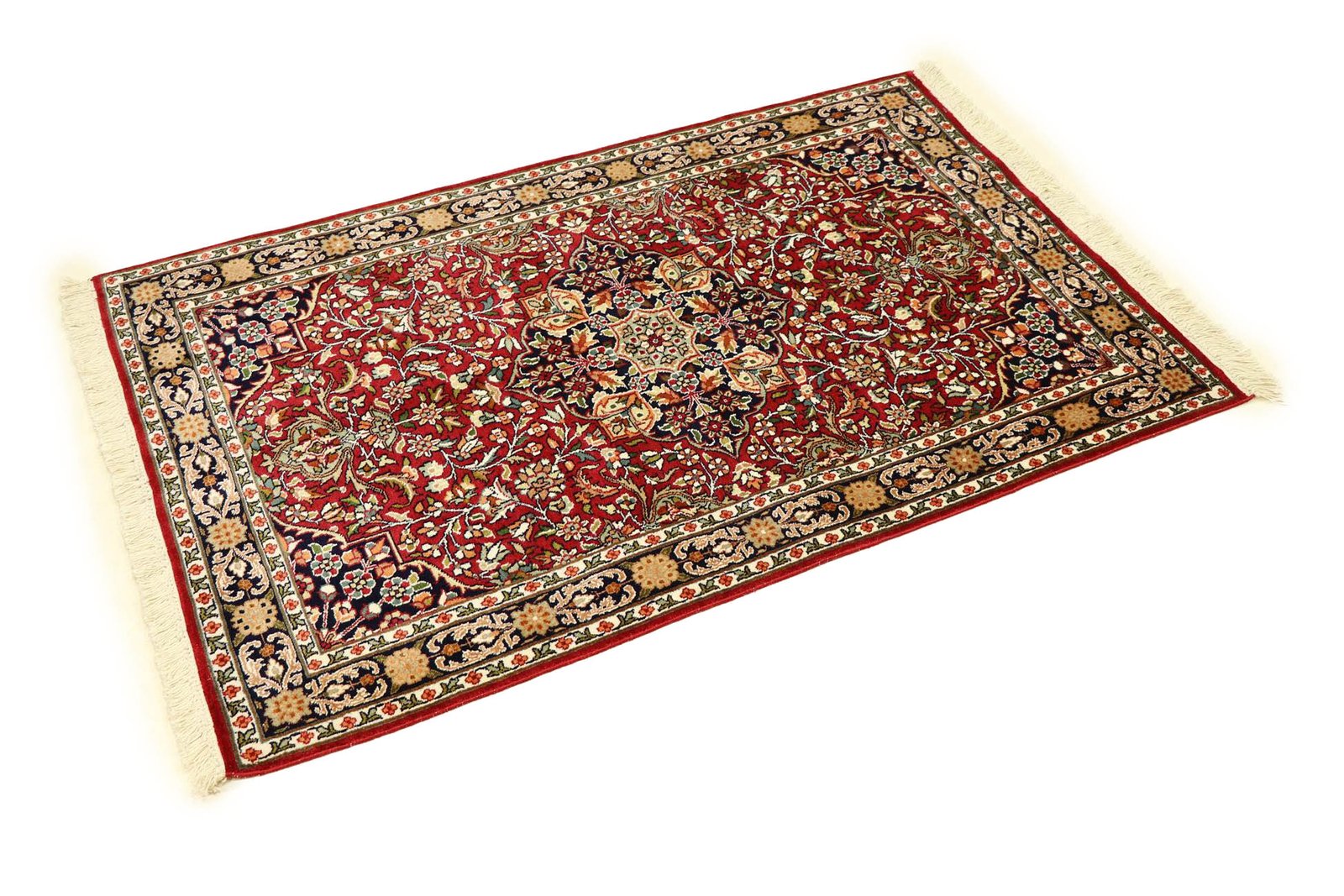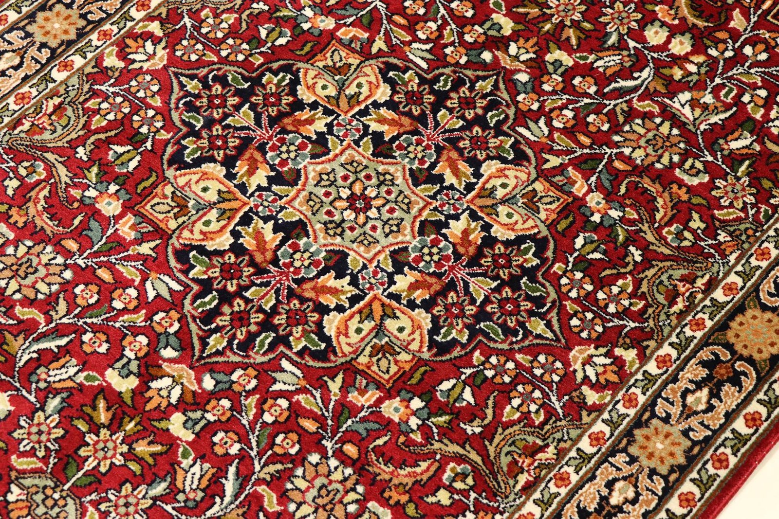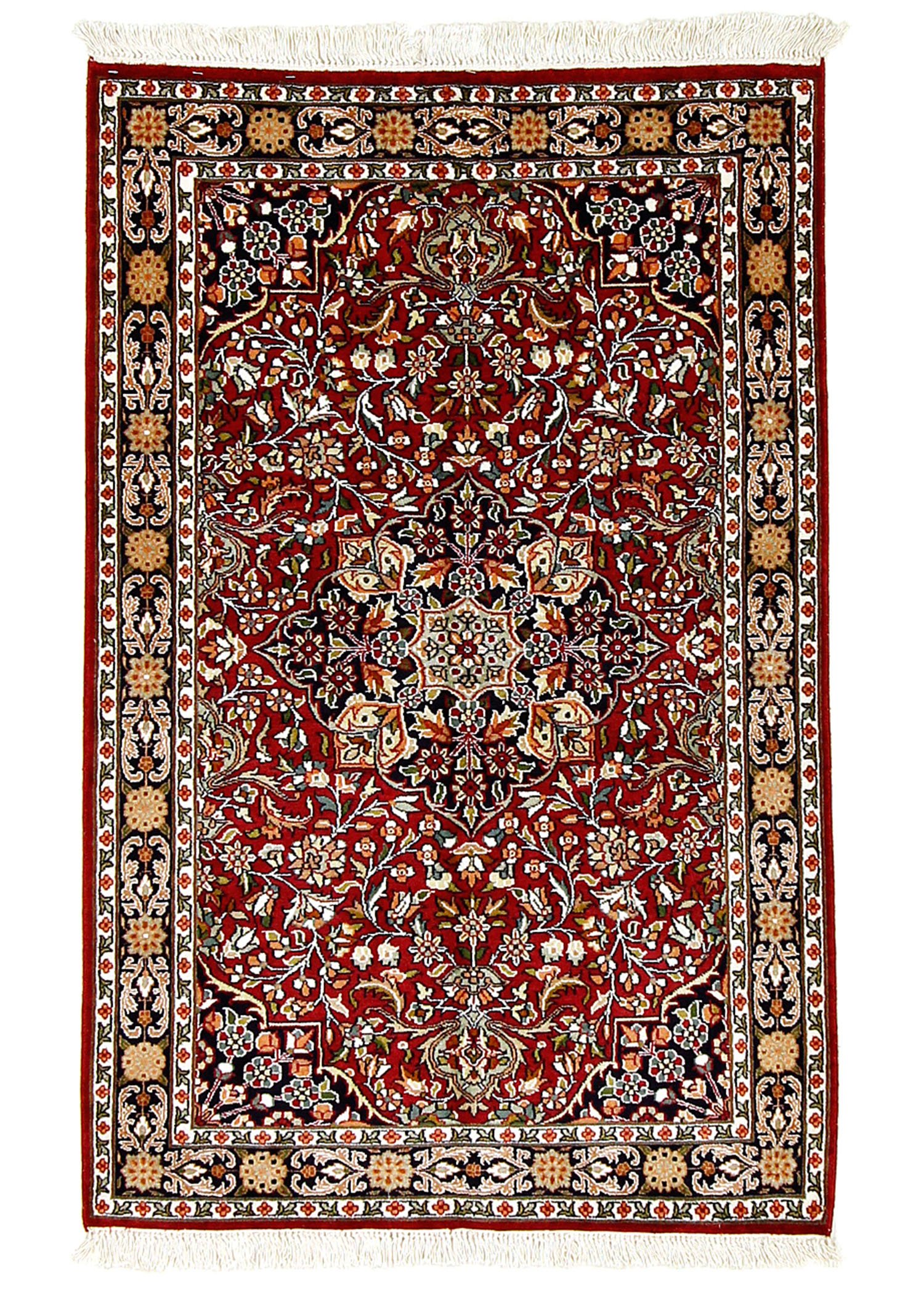 This hand-knotted silk carpet from Kashmir is a masterpiece of Indian carpet weaving, made from pure silk with an exceptionally high knot density that only experienced weavers can master. The fine natural silk offers a fascinating experience, feels incredibly soft and reflects colours in a variety of facets. Depending on the incidence of light, the carpet reveals new details and colour nuances that remain impressive even after years. Its beauty can only be experienced when viewed directly – an experience that makes you forget time and cannot be captured by photos alone.