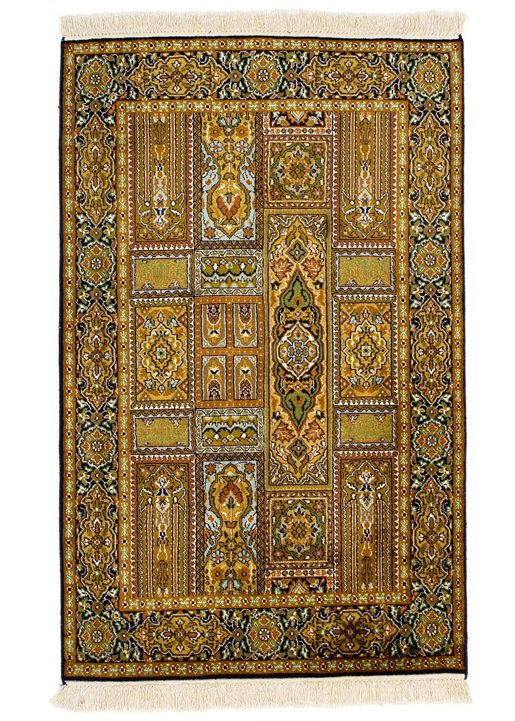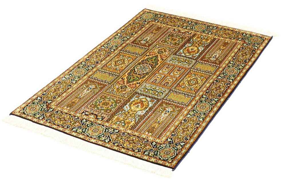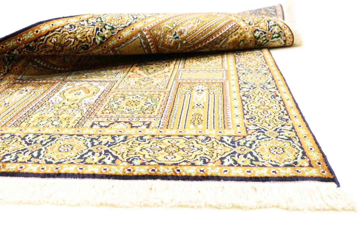 This hand-knotted silk carpet from Kashmir is a masterpiece of Indian carpet weaving. Made from pure silk and with an extremely fine knot density, it showcases the extraordinary skill of experienced craftsmen. The fine natural silk is particularly soft and gives the carpet vibrant colours that reveal new facets depending on the incidence of light. Even after years, it continues to impress with its beauty and variety of details, which can be admired for hours on end. Such a carpet cannot only be captured photographically, but also offers an experience that makes you forget time and reveals new impressions again and again.