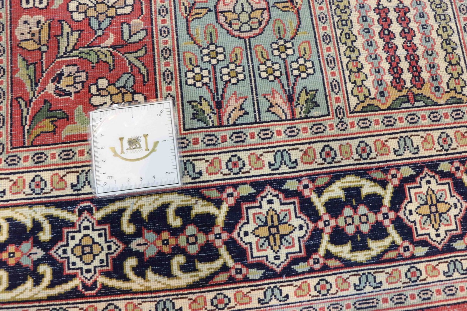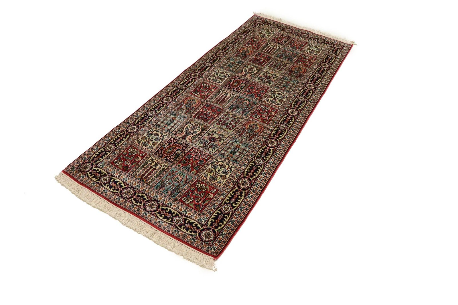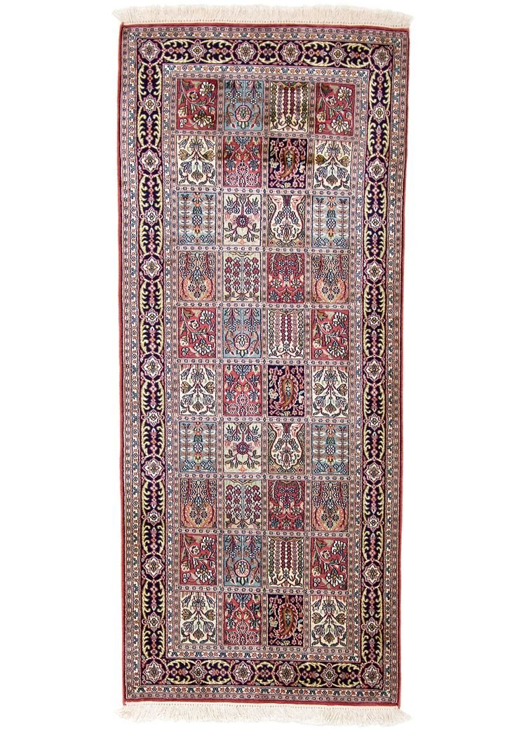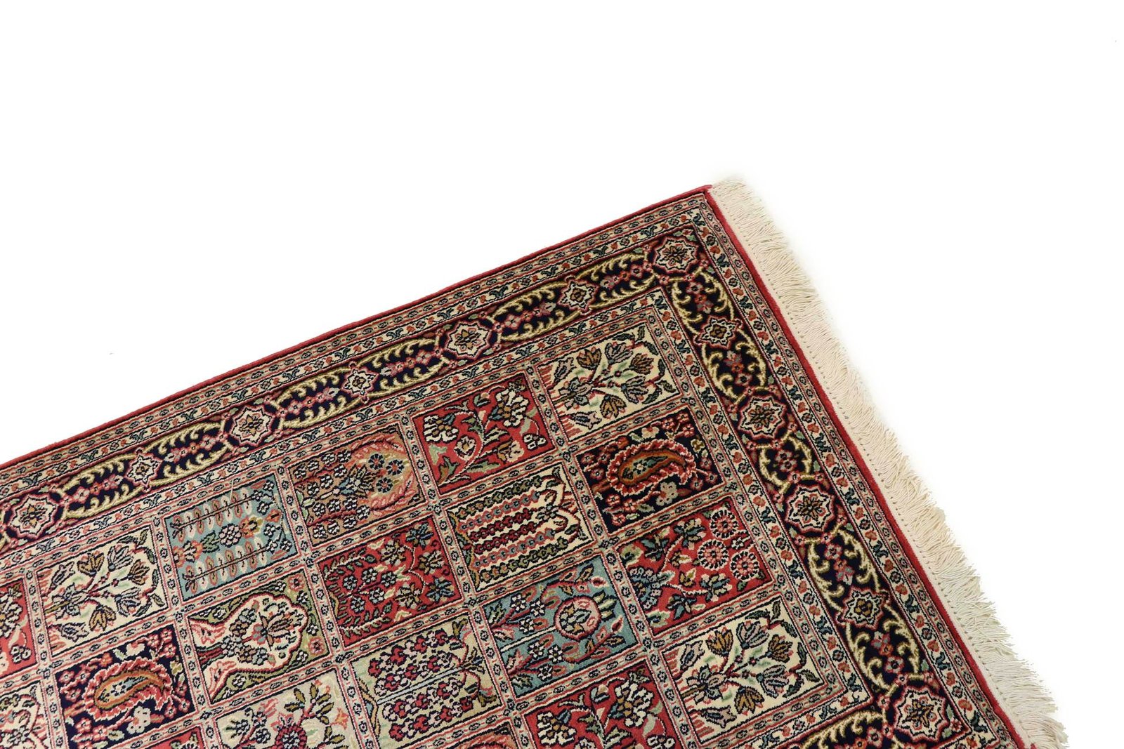 This hand-knotted silk carpet from Kashmir is a masterpiece of Indian carpet weaving. It is made of pure silk with an exceptionally fine knot density that only experienced craftsmen can master. The fine natural silk is particularly soft and allows the colours to shimmer in numerous facets. Under different lighting conditions, new details and colours are revealed that remain impressive even after many years. This carpet invites you to spend hours admiring it, transporting you into a world of craftsmanship and beauty that cannot be captured in a photograph. It is an experience that makes you forget the passage of time and awakens admiration for such masterful craftsmanship.