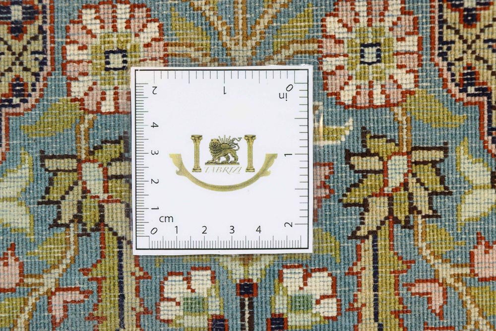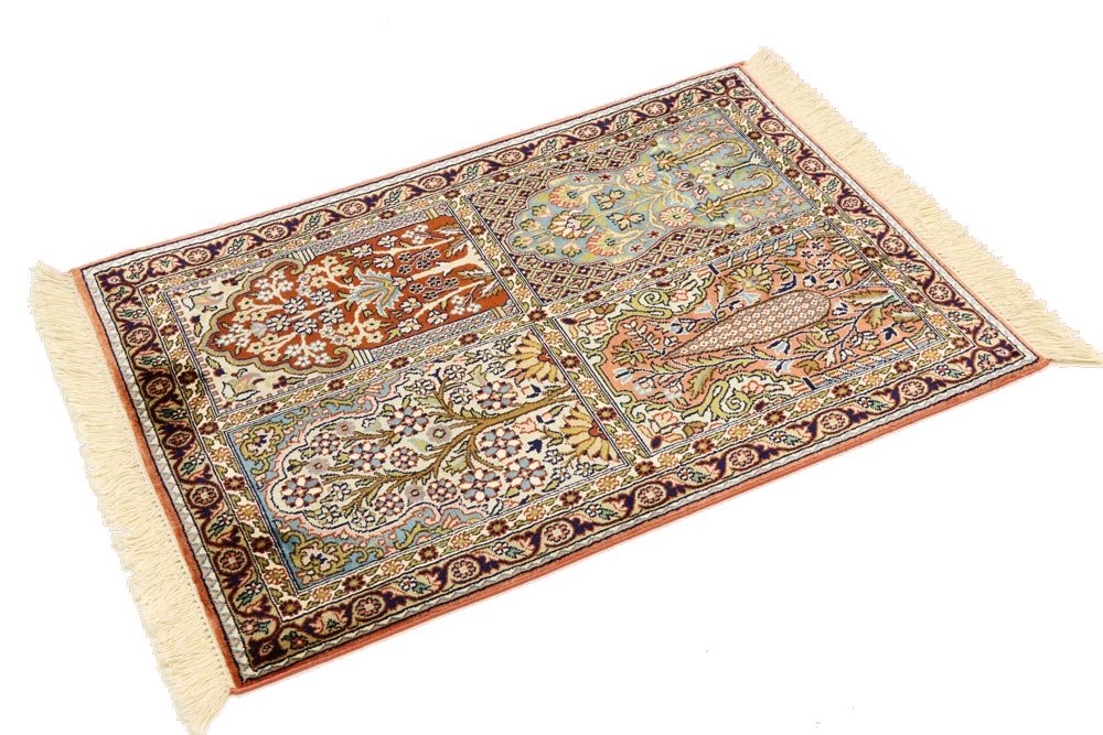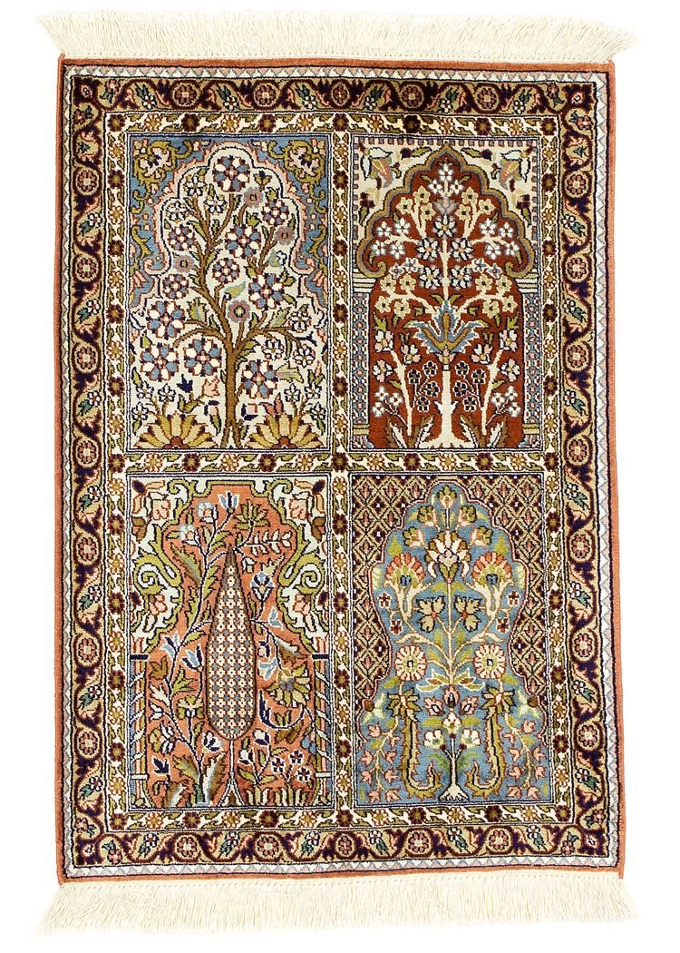 This hand-knotted Kashmir silk carpet showcases the masterful craftsmanship of Indian carpet weavers. Made from pure silk, it captivates with its exceptionally fine knot density, which only experienced craftsmen can master. The fine natural silk is not only incredibly soft, but also allows the colours to shine in a multitude of facets. Under different lighting conditions, the carpet reveals new details and colours that remain impressive even after years. Gazing at it can captivate you for hours and make you forget the passage of time – an experience that cannot be captured in photos.