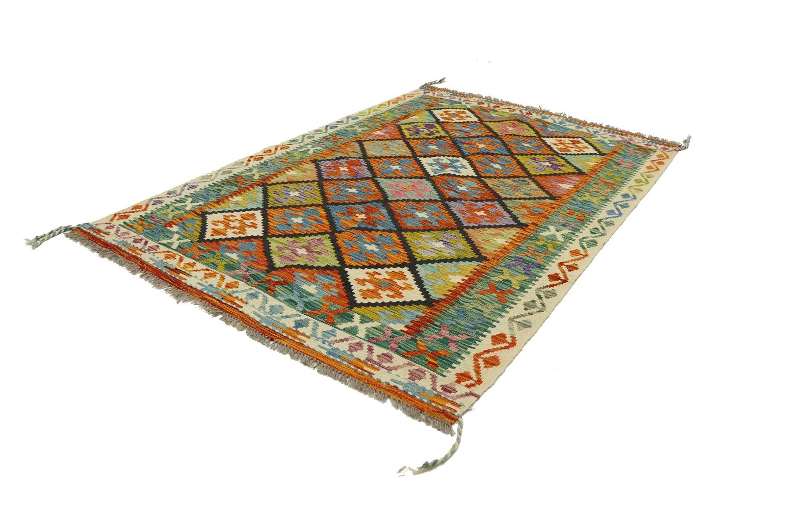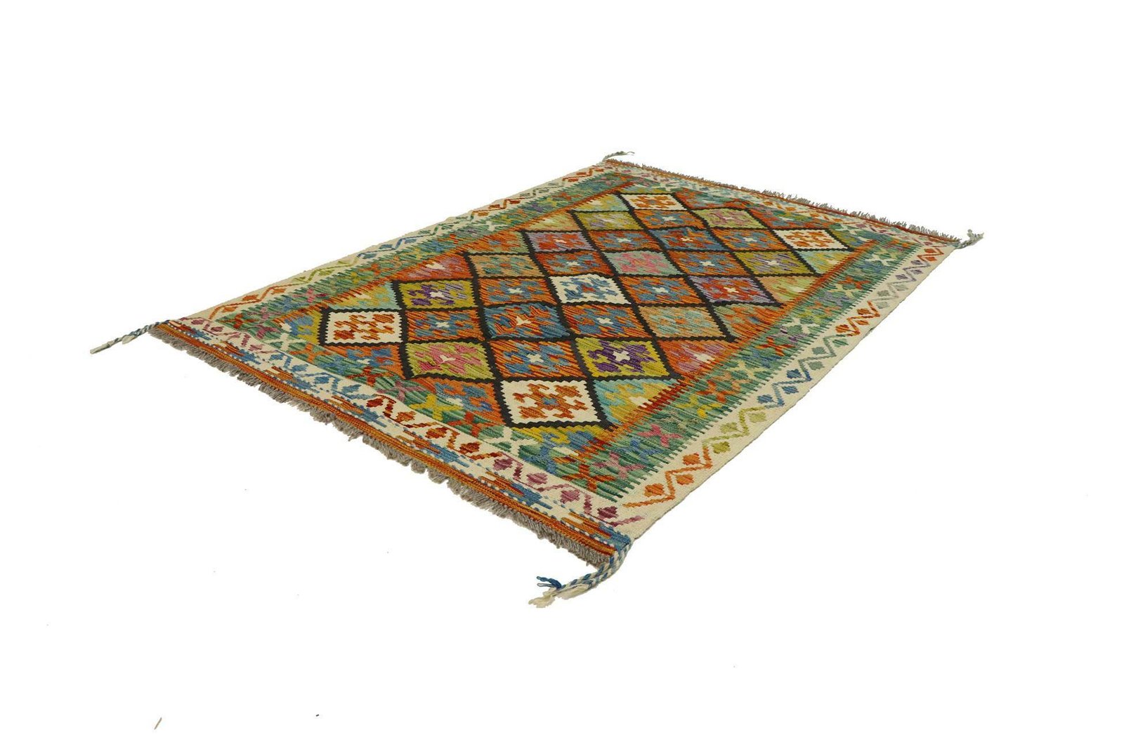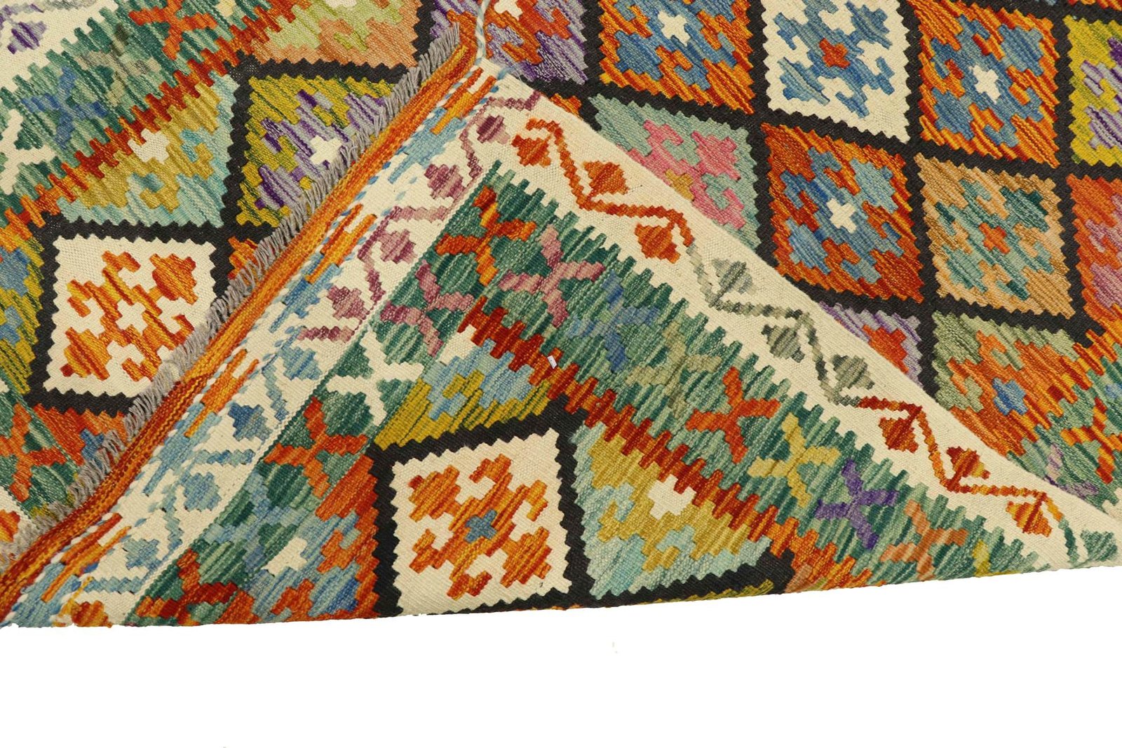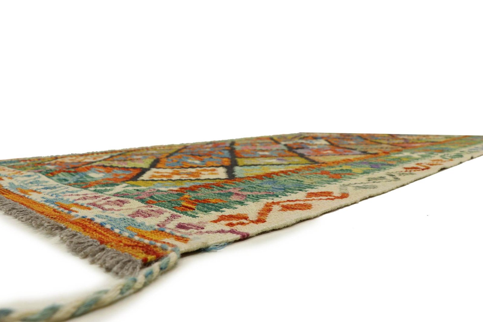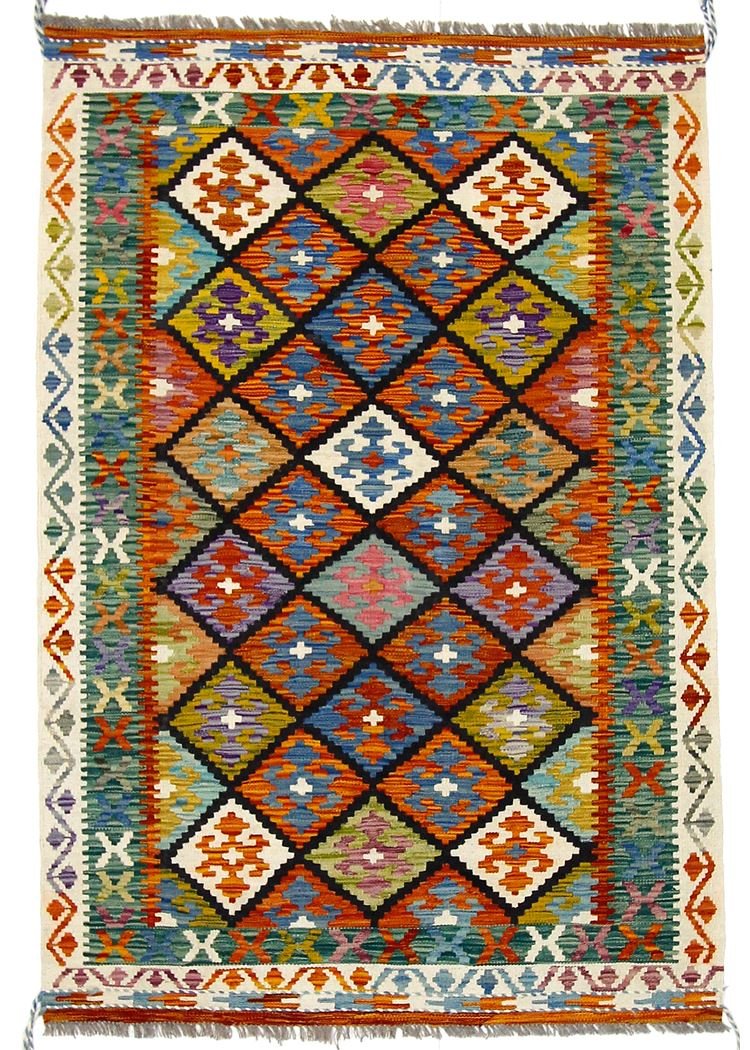 Kilim rugs differ significantly from hand-knotted varieties as they are woven by hand and do not have a high wool pile. This makes them flatter and rougher, which reduces their production costs. These characteristics make them lighter and allow them to be used on both sides. Originally from Persia, they are now also produced in Afghanistan. Their simple, linear patterns are characteristic of their special weaving technique.