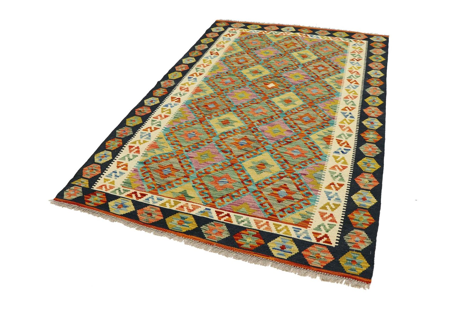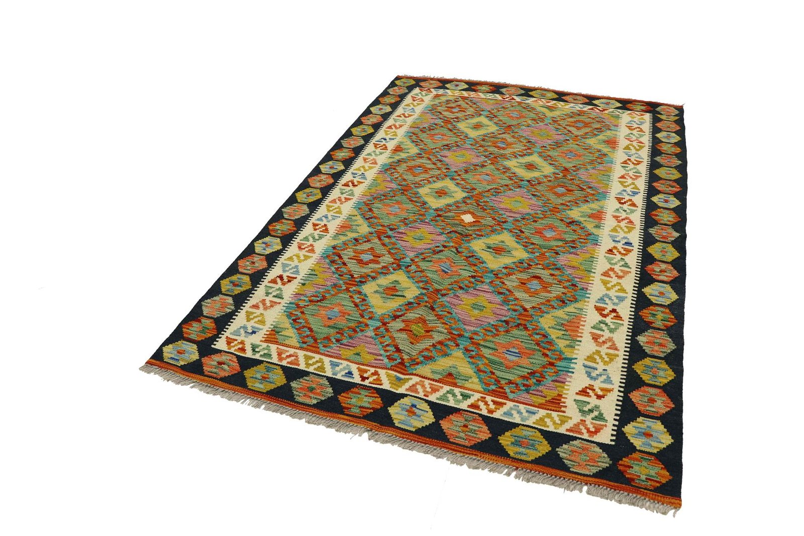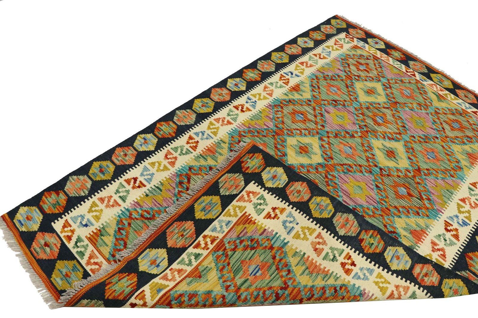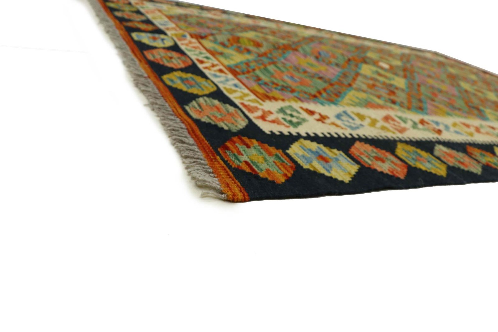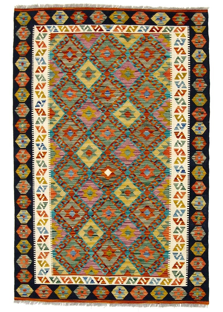 Kilim rugs differ significantly from hand-knotted rugs in that they are woven by hand and do not have a raised wool pile. This makes them flatter and rougher than knotted wool rugs and often less expensive. Another advantage is their lower weight and the fact that they can be used on both sides. Originally from Persia, hand-woven kilims are now also widely produced in Afghanistan. They are characterised by their simple, linear patterns, which are created by the special weaving technique.
