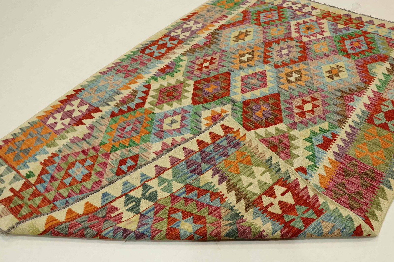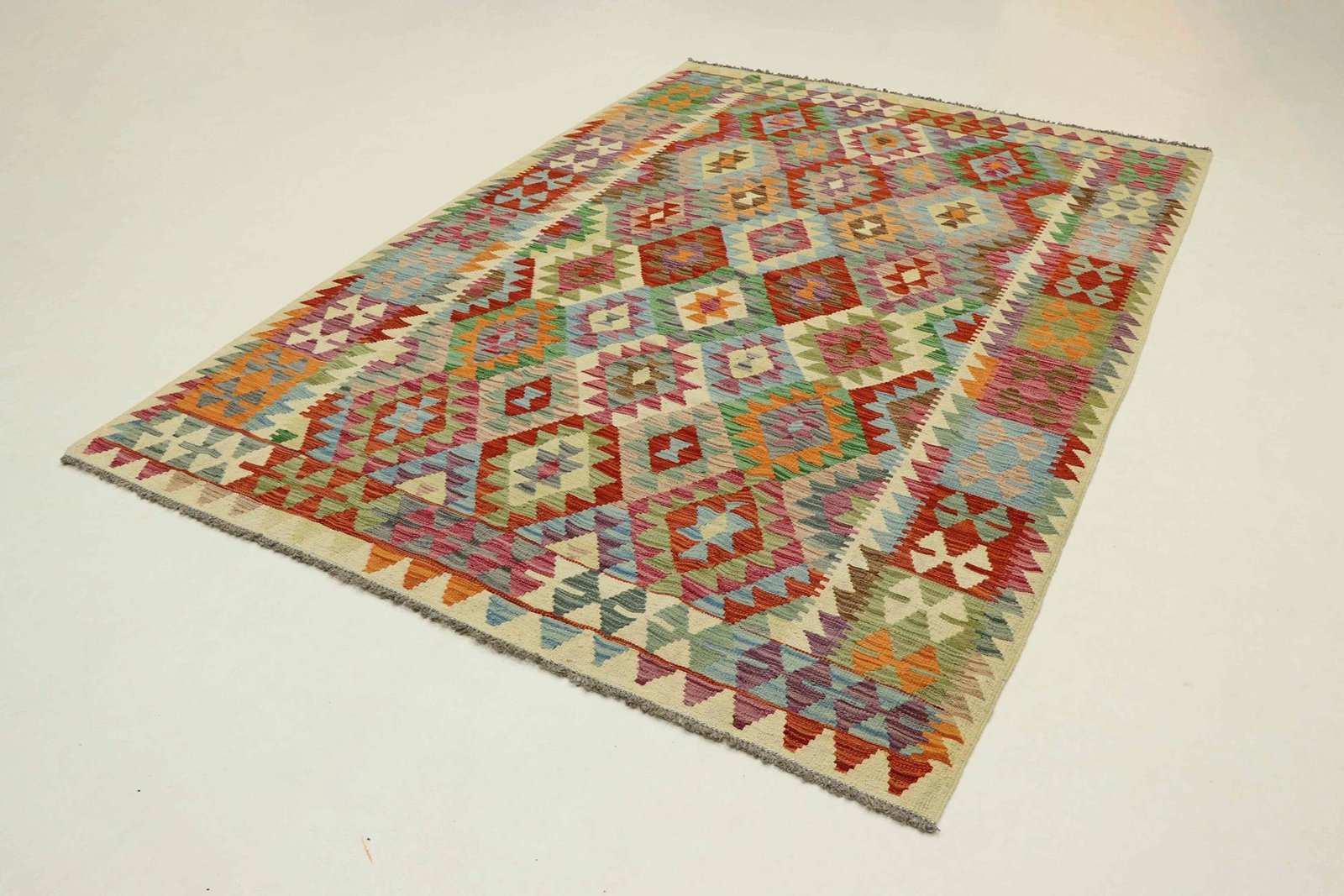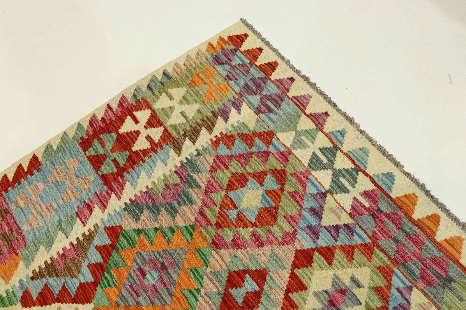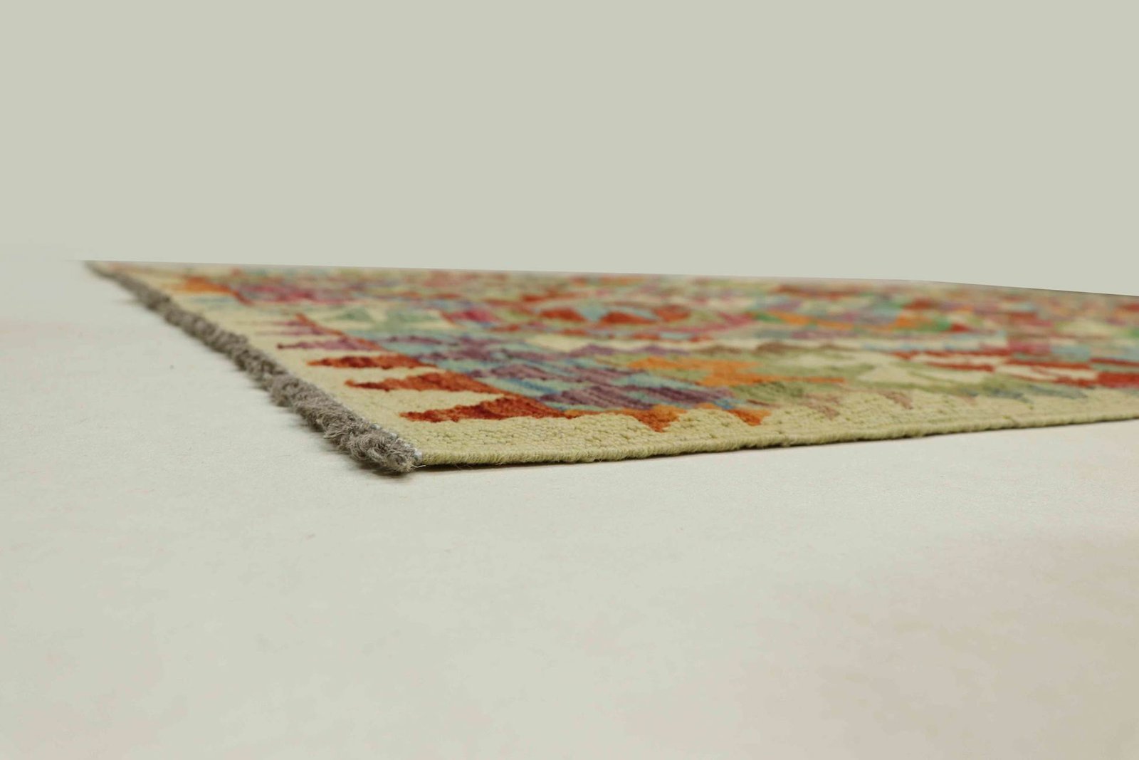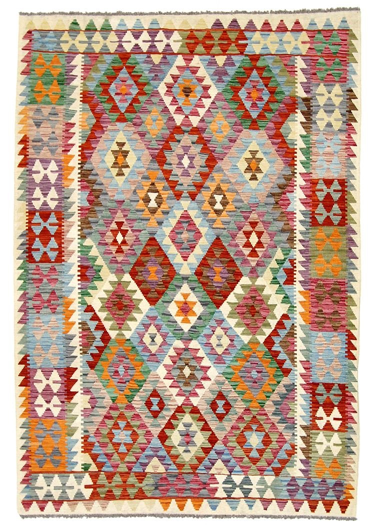 Kilim rugs differ significantly from hand-knotted rugs in that they are woven by hand. They do not have a high wool pile and are often flatter and rougher. This makes them cheaper to produce. Another advantage is their lower weight and the fact that they can be used on both sides. Originally from Persia, kilims are now also widely produced in Afghanistan. They are known for their simple, linear patterns, which are created using a special weaving technique.