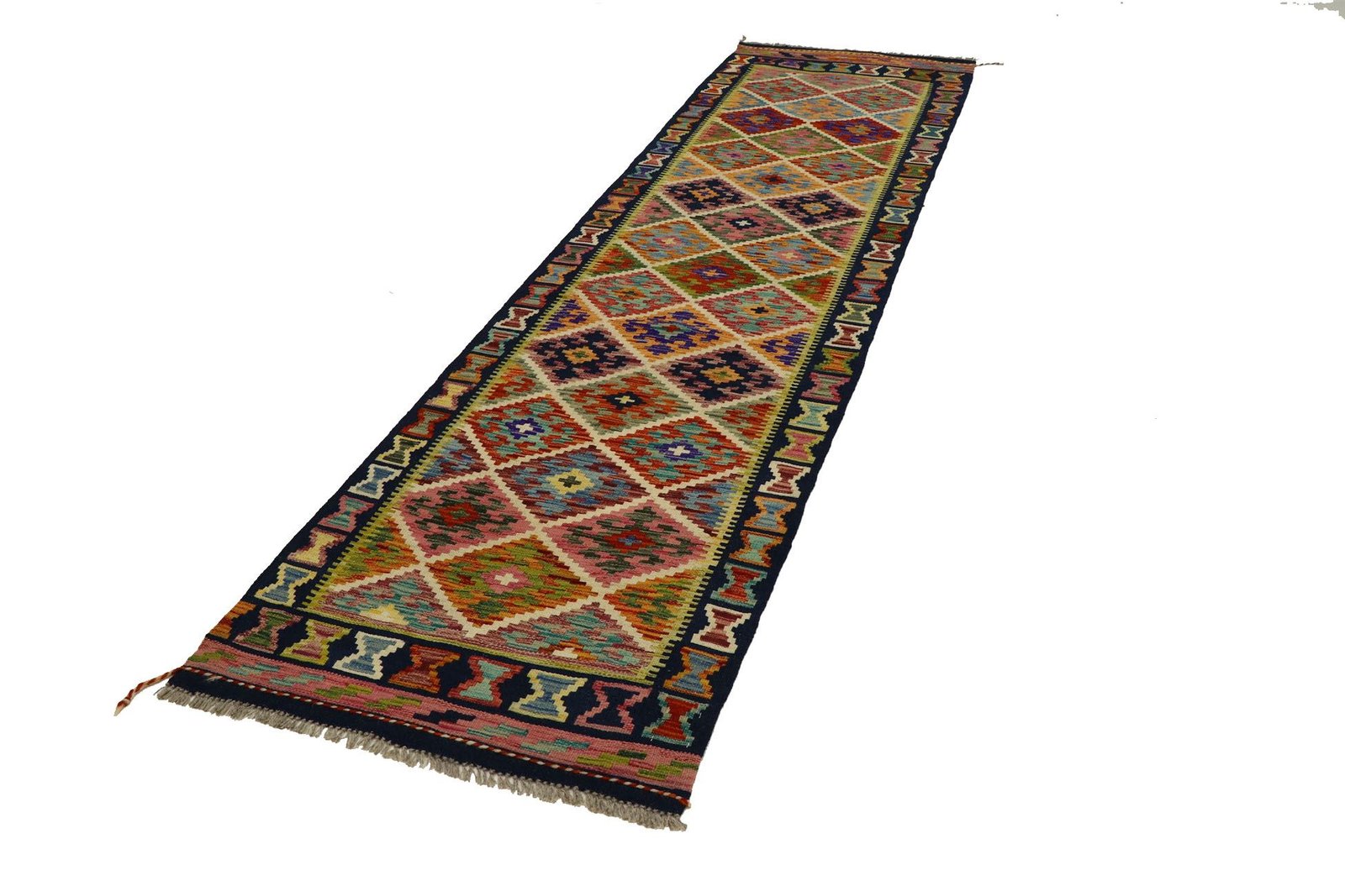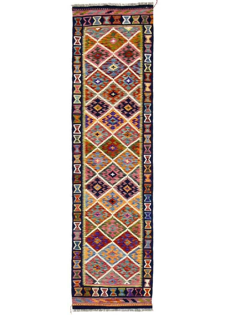 Kilim rugs differ fundamentally from hand-knotted rugs in that they are hand-woven, do not have a high wool pile and are often flatter and rougher. This makes them cheaper to produce. Another advantage is their lower weight and the fact that they can be used on both sides. Originally from Persia, kilims are now also widely produced in Afghanistan. They are characterised by simple, linear patterns created by their special weaving technique.