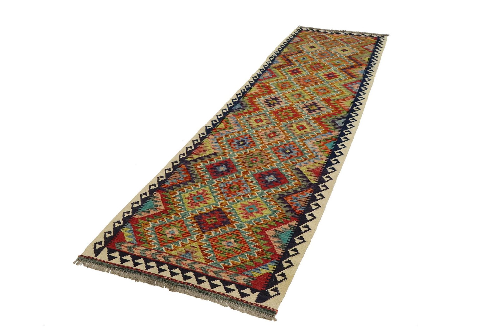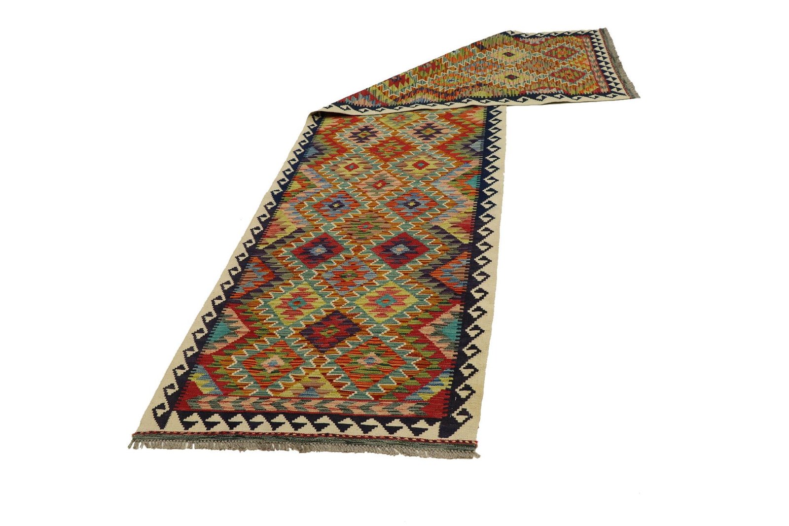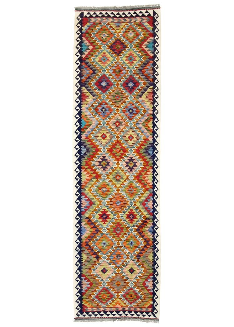 Kilim rugs differ fundamentally from hand-knotted rugs in that they are woven by hand and do not have a high wool pile, which makes them flatter and rougher. This results in lower production costs. They are lighter and can be used on both sides, which increases their flexibility. Originally from Persia, kilims are now also widely produced in Afghanistan. Their patterns are typically simple and straightforward, due to their special weaving technique.