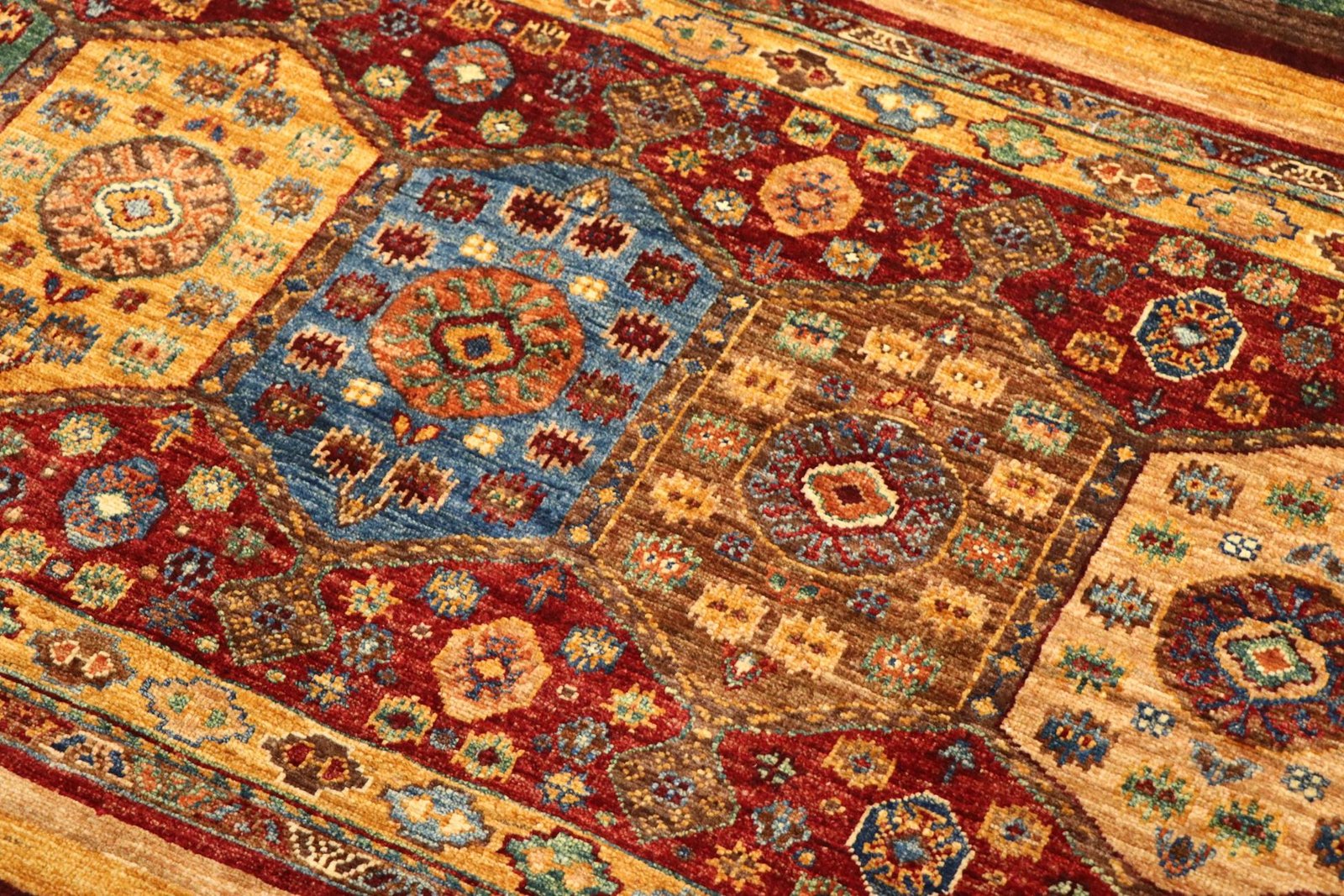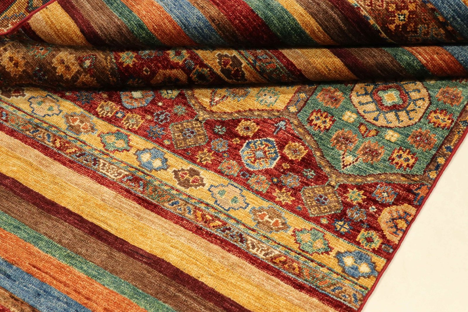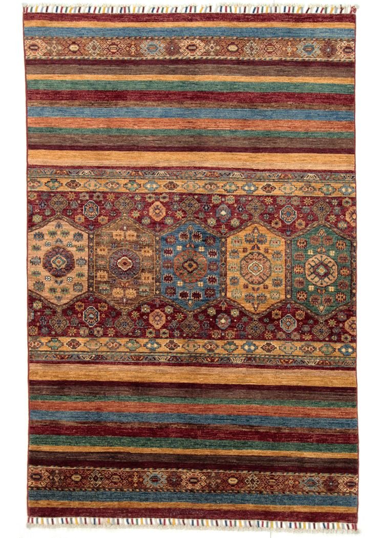 The Khorjin carpet, a masterpiece made from hand-spun sheep’s wool of the highest quality, is mainly produced in Iran, Afghanistan and Pakistan. The wool is spun by hand before the knotting begins, which gives the carpet its unique texture. Wool is known for its natural and extremely durable properties, which have proven themselves over centuries. It is dirt-repellent and heat-insulating, ideal for a wide range of climates. In addition, wool is exceptionally soft and has a natural sheen that gives the Khorjin carpet a special elegance. These carpets are not only works of art in terms of craftsmanship, but also functional works of art that bring comfort and beauty to any room.