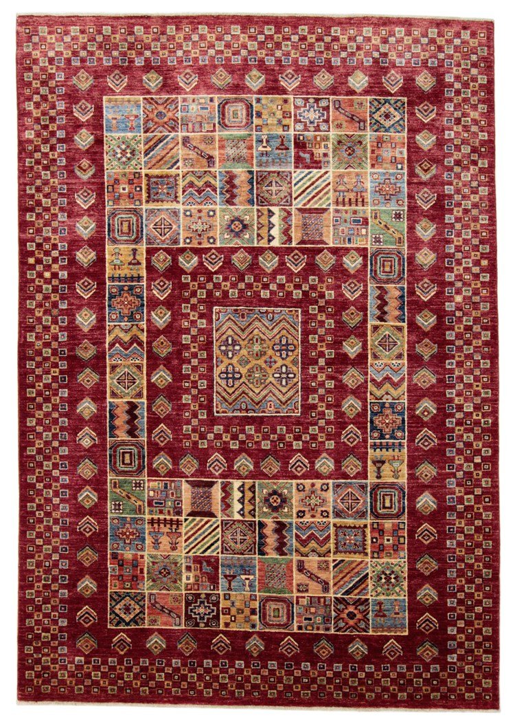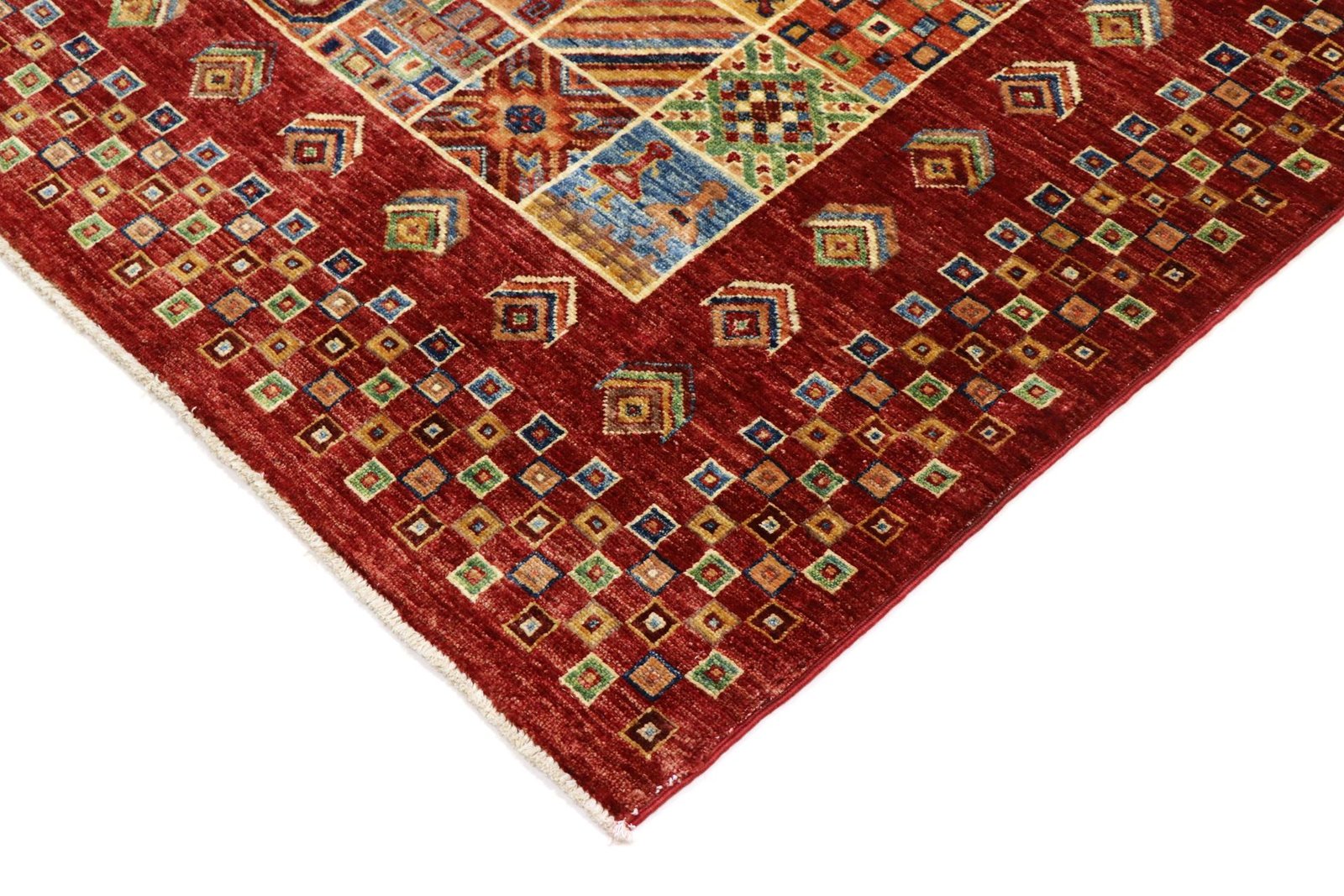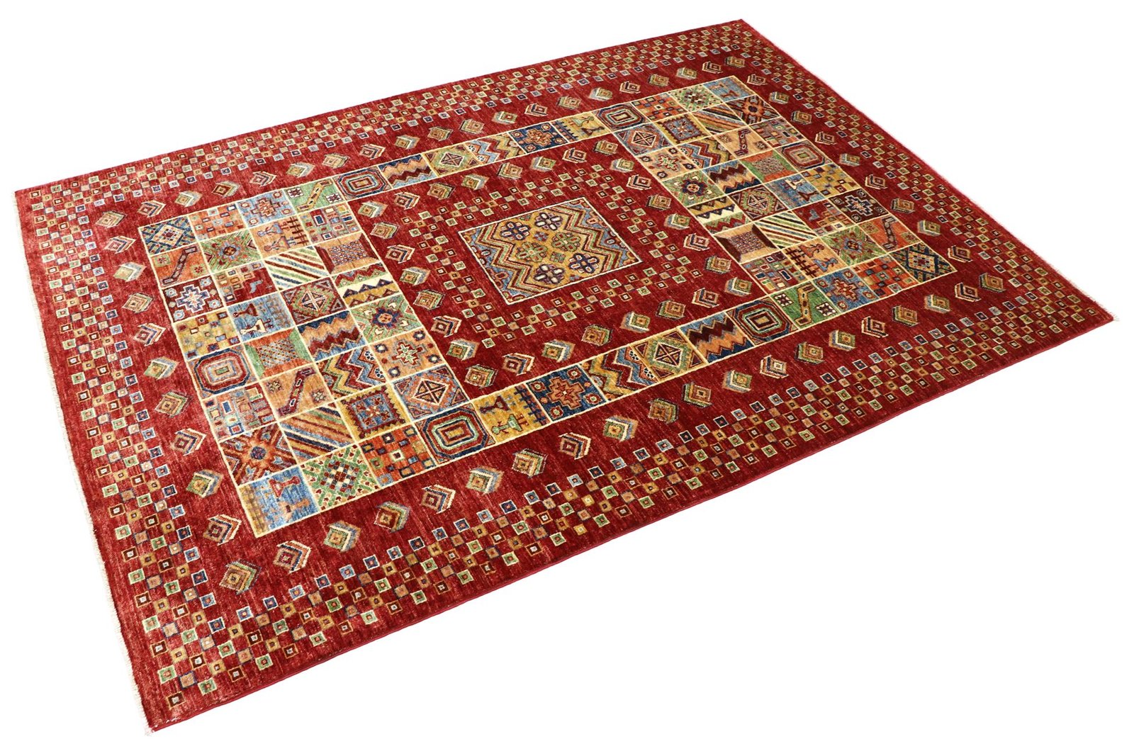 The Khorjin carpet is made from hand-spun sheep’s wool of the highest quality. In Iran, Afghanistan and Pakistan in particular, the wool is still spun by hand using traditional methods before being knotted. This natural material has proven itself to be extremely durable over centuries. Sheep’s wool is characterised by its dirt-repellent and heat-insulating properties, making it an ideal raw material for carpets. It also offers unparalleled softness and a natural sheen. The combination of these properties gives the Khorjin carpet its special quality and durability, making it not only practical but also aesthetically appealing.