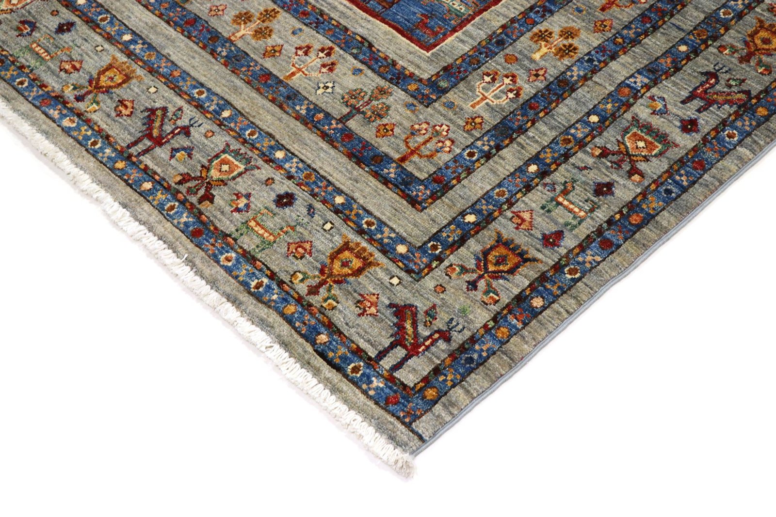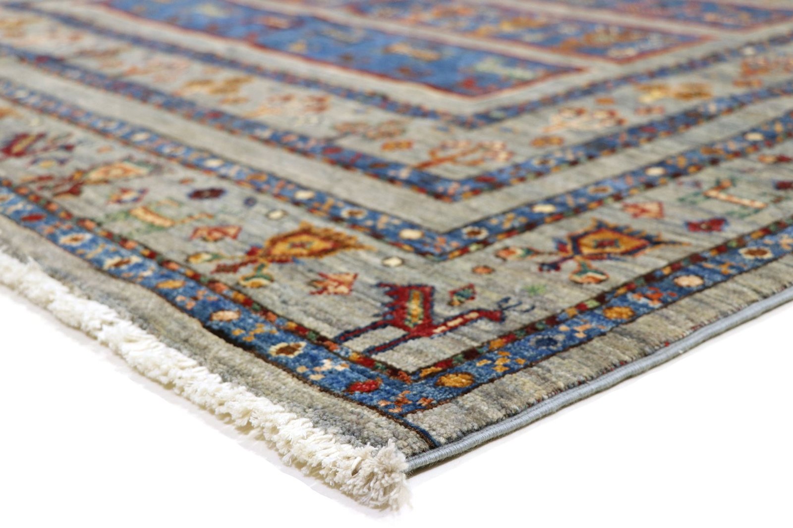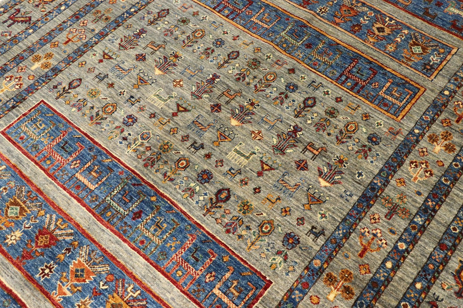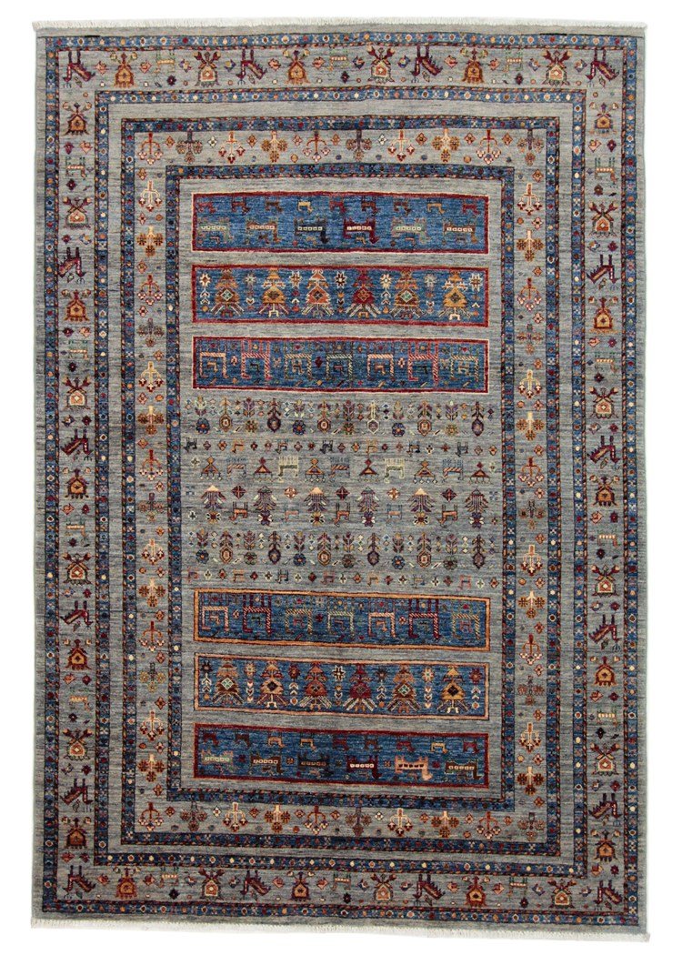 The Khorjin carpet, made from hand-spun sheep’s wool of the highest quality, is particularly well known in Iran, Afghanistan and Pakistan. The wool is traditionally spun by hand before the carpet is knotted. Thanks to its natural properties, wool is extremely durable, dirt-repellent and heat-insulating. At the same time, it offers an incomparably soft feel and brings out a natural sheen. These carpets are not only testimonials to traditional craftsmanship, but also symbols of the durability and beauty of natural materials. The careful selection and processing of the wool by experienced craftsmen characterise the high quality and durability of Khorjin carpets, which are valued both for their aesthetic appeal and their functional properties.