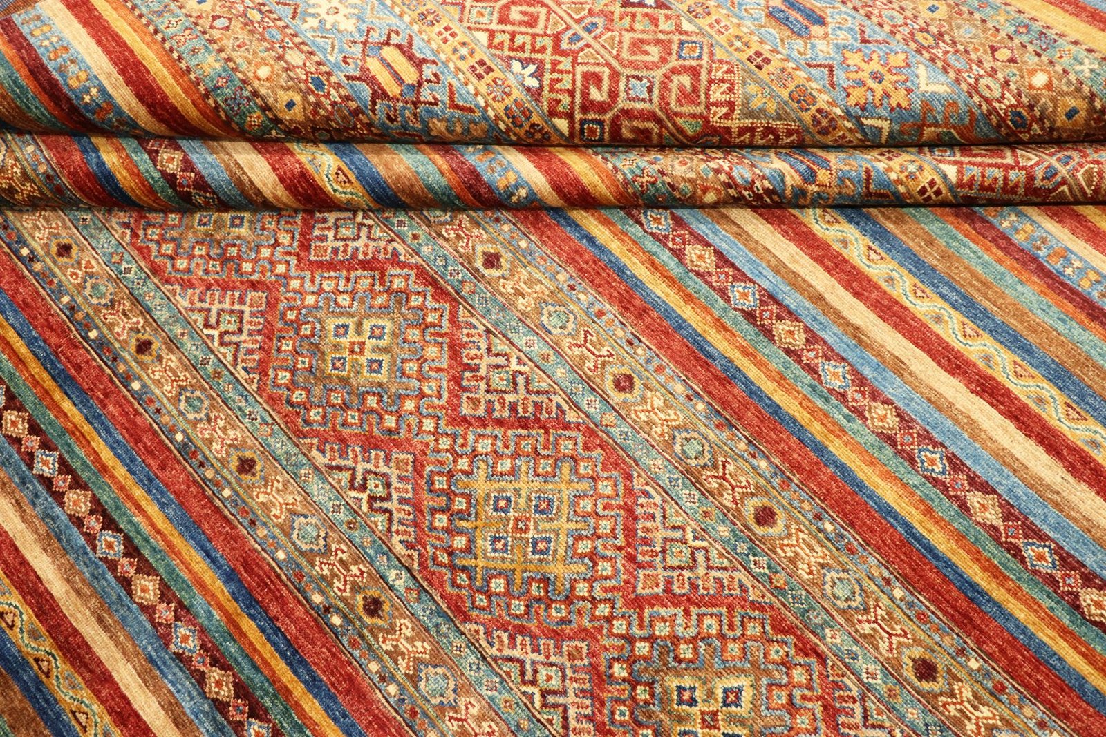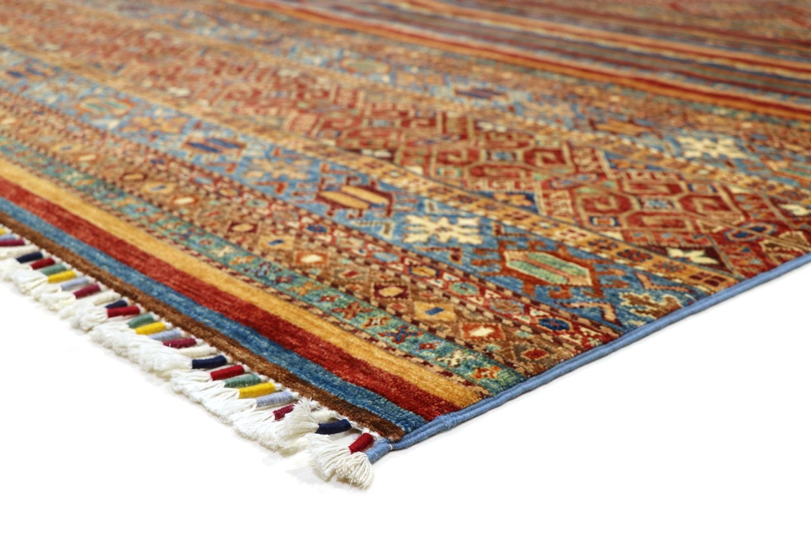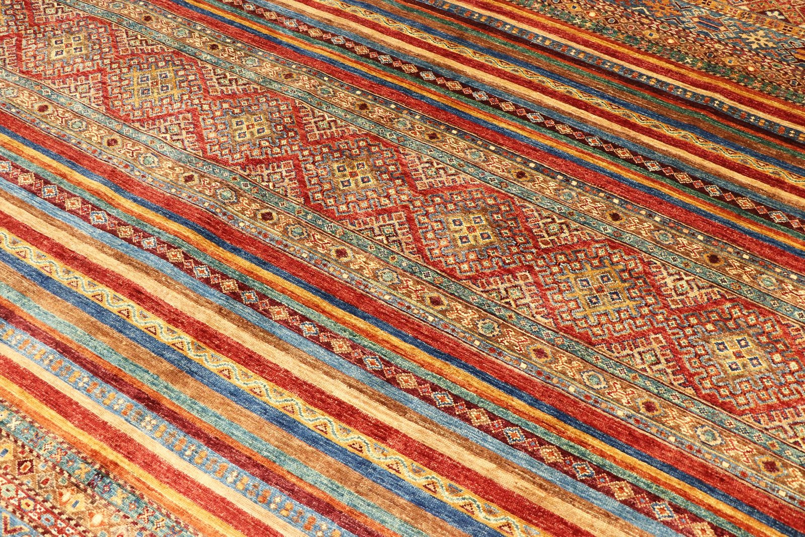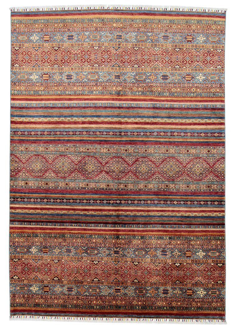 The Khorjin carpet is characterised by its use of the highest quality hand-spun sheep’s wool, particularly in regions such as Iran, Afghanistan and Pakistan. The wool is spun by hand before the carpet is knotted, a process that preserves the robustness and natural properties of the material. Wool is known for its dirt repellency, thermal insulation and exceptional softness. In addition, it has a natural sheen that is enhanced by the skilful handiwork of the carpet weavers. These carpets are not only a symbol of traditional craftsmanship, but also of the timeless beauty and durability of natural materials, shaped by their centuries-old history of carpet making.