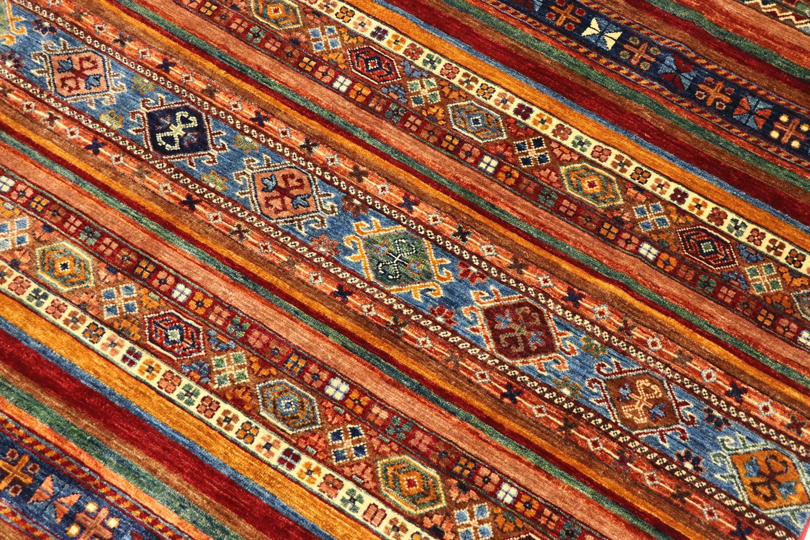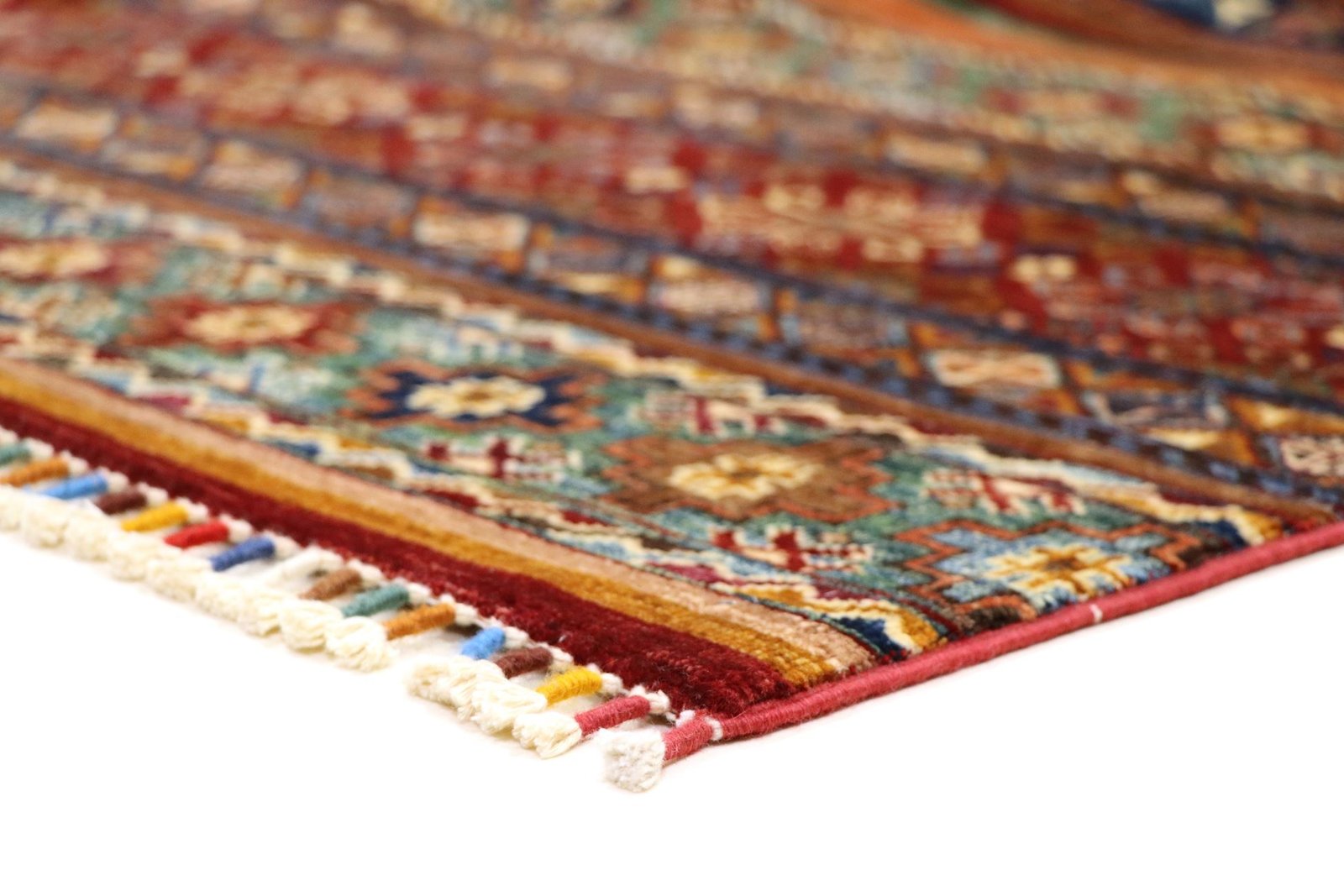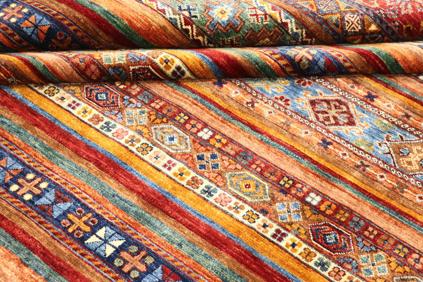 The Khorjin carpet, known for its exceptional quality, is made from hand-spun sheep’s wool. This process begins in regions such as Iran, Afghanistan and Pakistan, where the wool is spun by hand before the actual knotting begins. Sheep’s wool has been a preferred material for centuries due to its natural properties: it is extremely durable, dirt-repellent and has excellent heat-insulating properties. In addition, it gives the carpet a natural sheen and an incomparably soft texture. The craftsmanship with which each Khorjin carpet is made is reflected in its durability and beauty. Each carpet is a unique work of art that is not only functional but also embodies aesthetic and cultural values deeply rooted in the tradition and craftsmanship of the region.