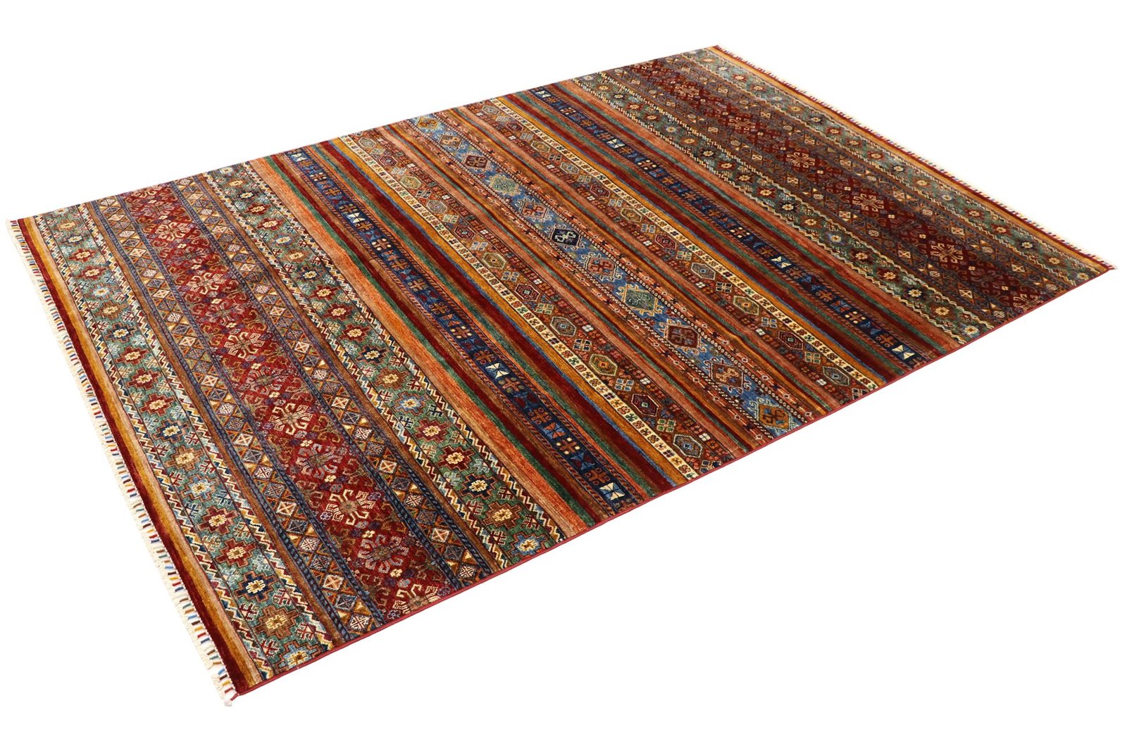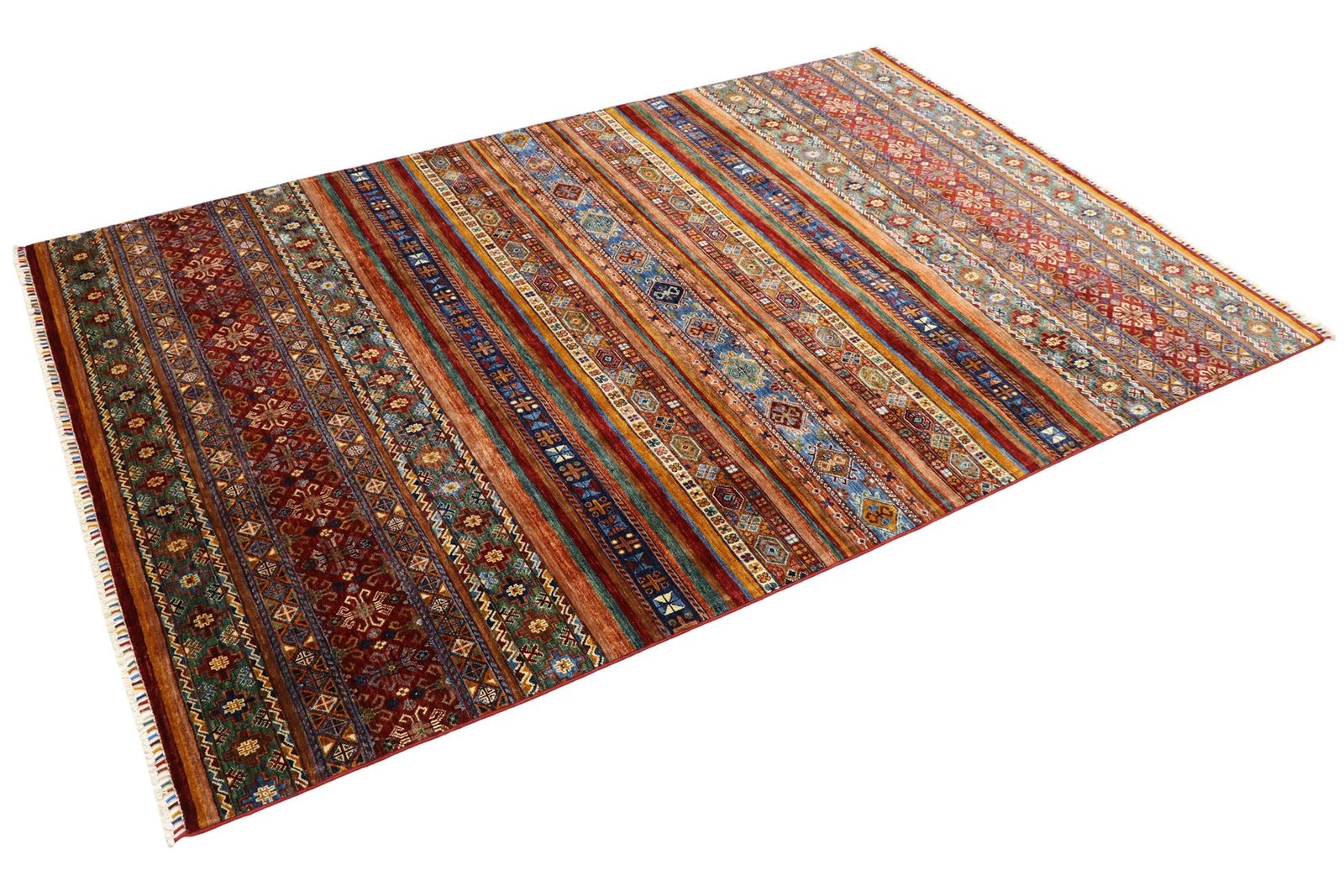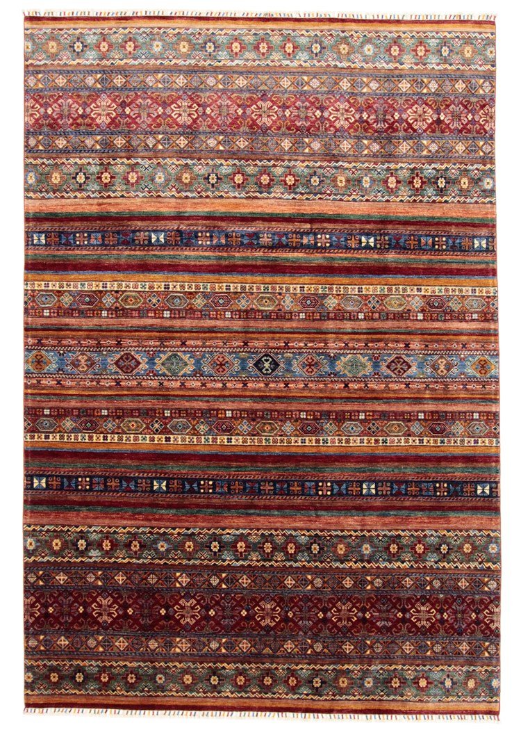 The Khorjin carpet, known for its exceptional quality, is made from hand-spun sheep’s wool. This process begins in regions such as Iran, Afghanistan and Pakistan, where the wool is spun by hand before the actual knotting begins. Sheep’s wool has been a preferred material for centuries due to its natural properties: it is extremely durable, dirt-repellent and has excellent heat-insulating properties. In addition, it gives the carpet a natural sheen and an incomparably soft texture. The craftsmanship with which each Khorjin carpet is made is reflected in its durability and beauty. Each carpet is a unique work of art that is not only functional but also embodies aesthetic and cultural values deeply rooted in the tradition and craftsmanship of the region.