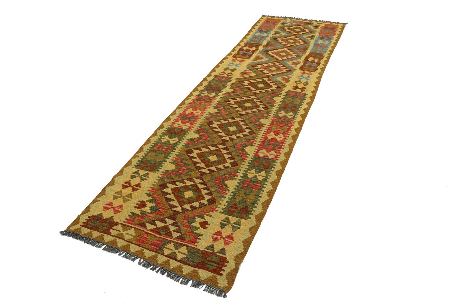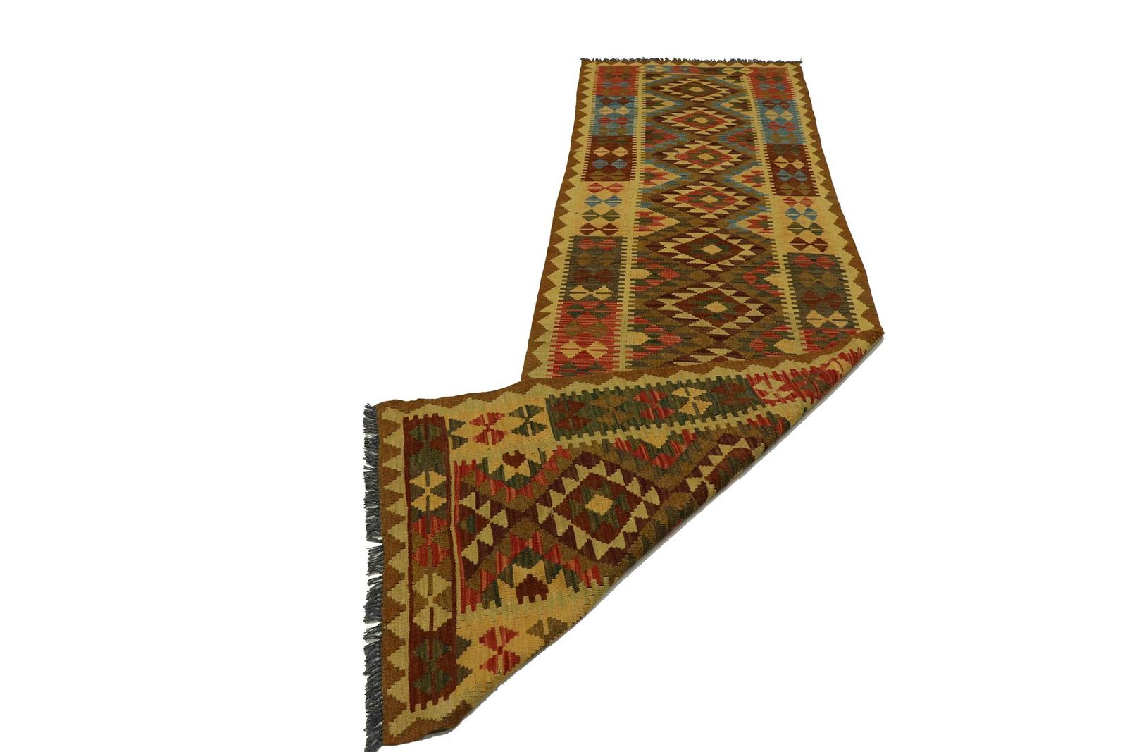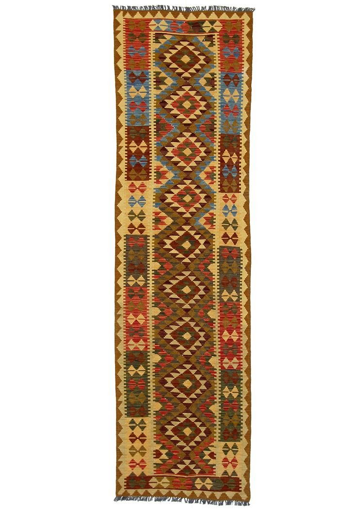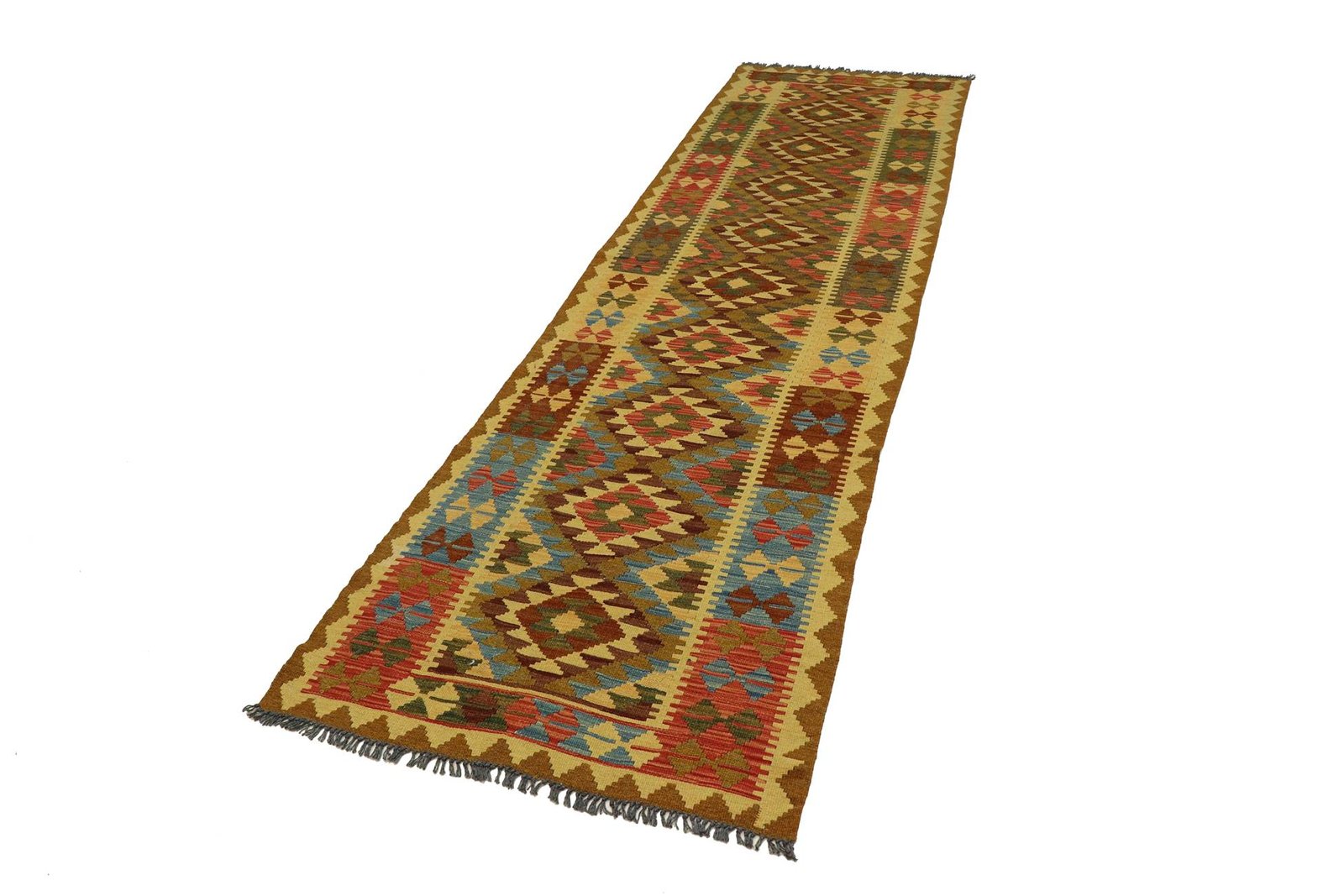 Kilim rugs differ significantly from hand-knotted varieties in that they are woven by hand and do not have a high wool pile, which makes them flatter and rougher. These simpler manufacturing methods result in a lower price. One advantage is their lightness and the fact that they can be used on both sides. Originally from Persia, they are now also produced in Afghanistan. They are characterised by their simple, linear patterns, which are created by the weaving technique.