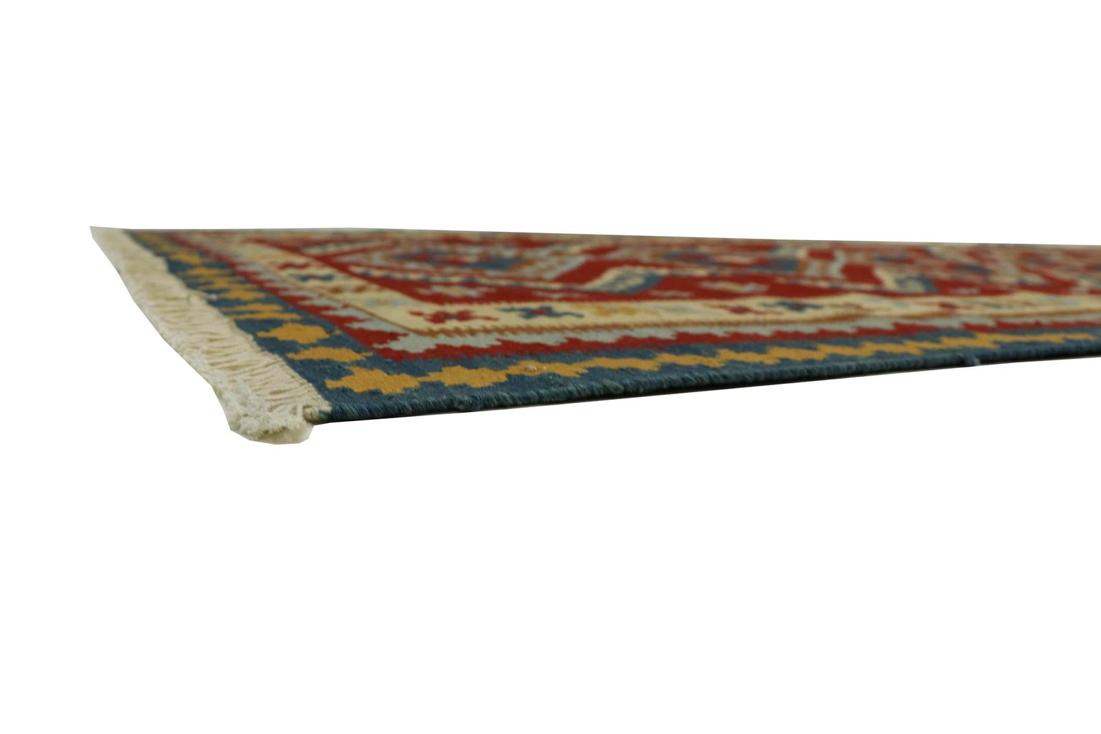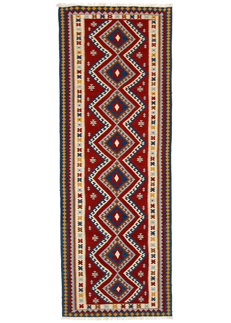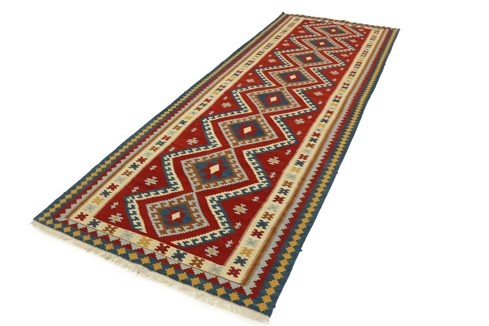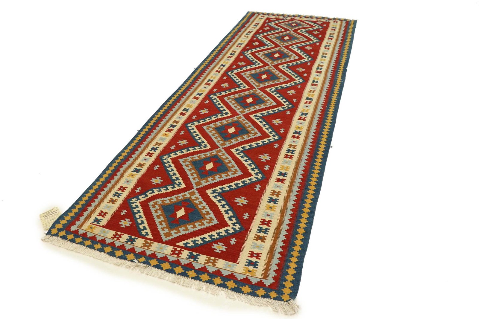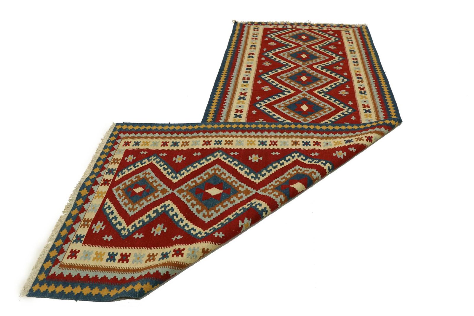 Unlike hand-knotted carpets, kilim carpets are woven by hand without a thick wool pile, making them flatter and rougher. This makes them cheaper to produce. They are lighter and can be used on both sides, which increases their flexibility. Originally from Persia, kilims are now also widely produced in Afghanistan. They are typically characterised by simple, linear patterns created by a special weaving technique.