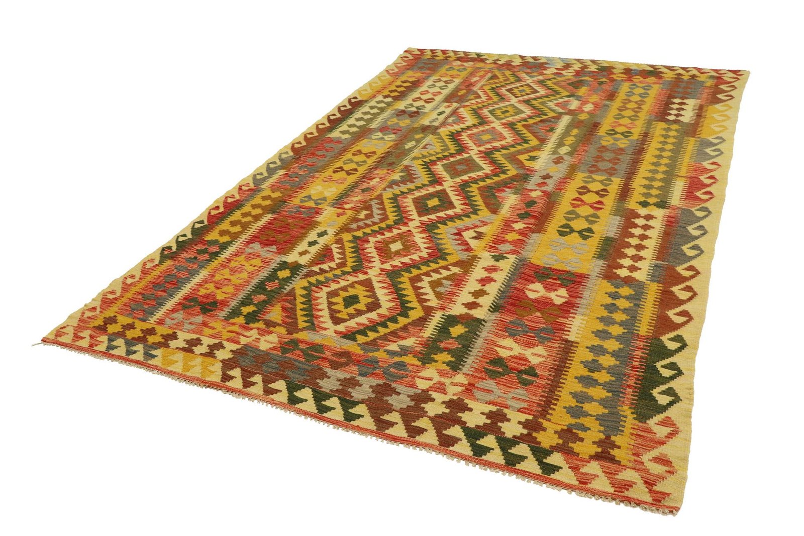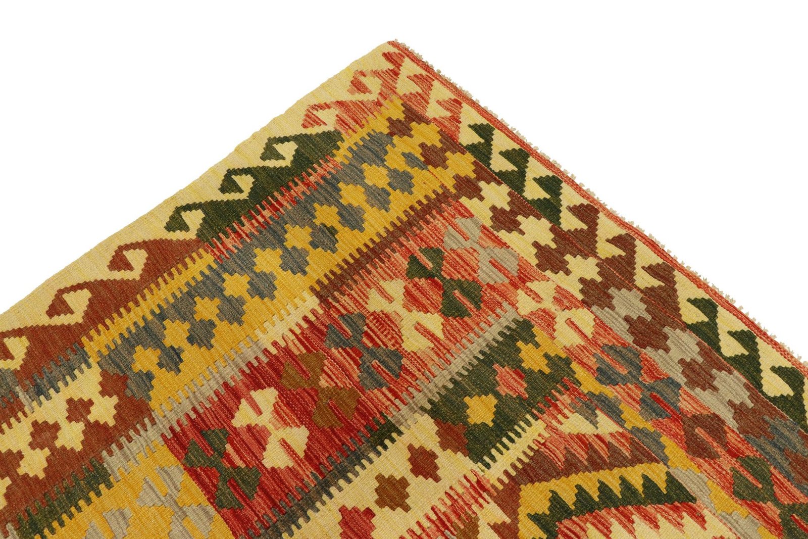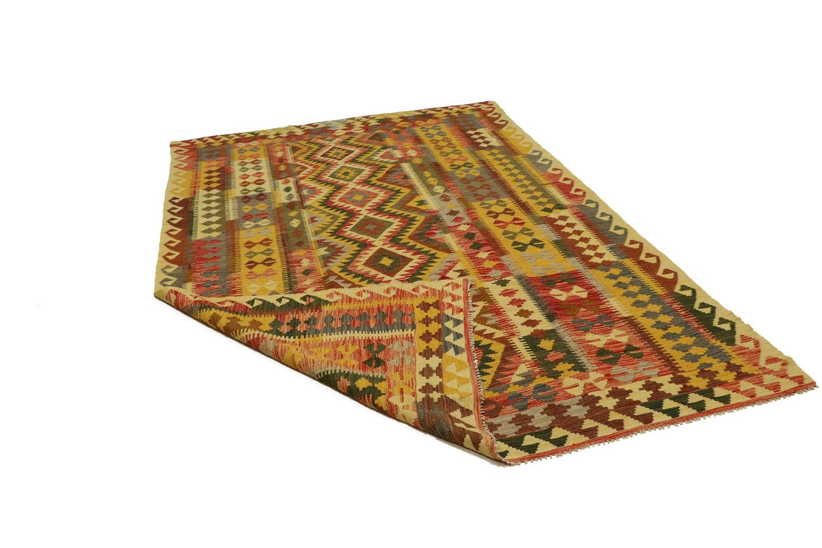 Kilim rugs differ significantly from hand-knotted rugs in that they are woven by hand and do not have a high wool pile. This often makes them flatter and rougher, which explains their lower cost of production. They are lighter and can be used on both sides, which increases their versatility. Originally from Persia, kilims are now also widely produced in Afghanistan. They are known for their simple, linear patterns, which are created using a special weaving technique.