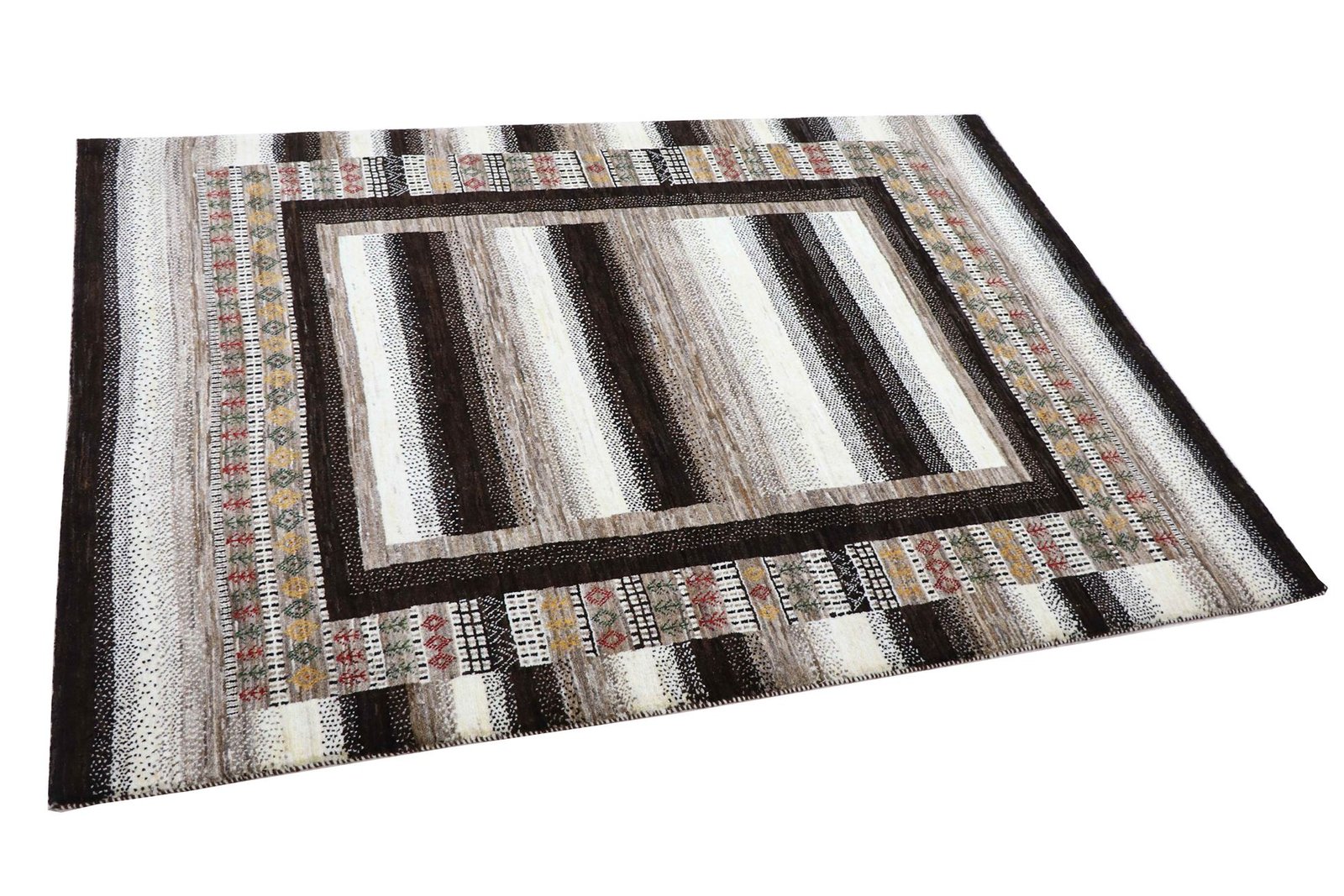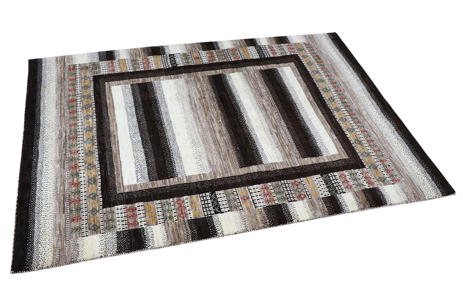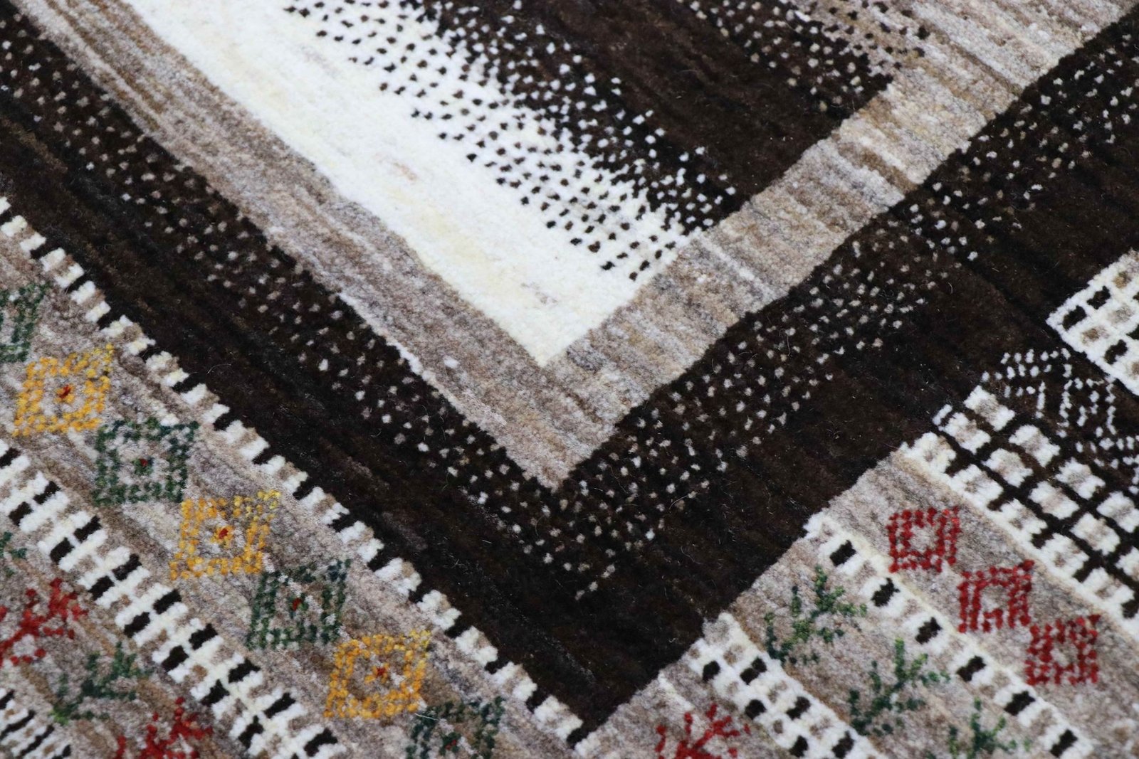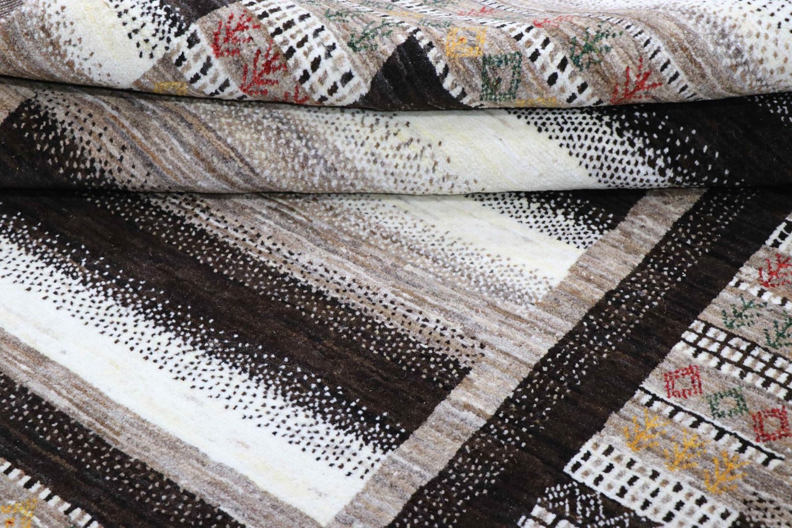 Loom Lori carpets are hand-woven in India on a wide loom. The term “Gabbeh” means “raw” in Farsi and refers to a simple, rustic carpet. They have become increasingly popular since the early 1990s as they offer a more relaxed, folk-inspired alternative to the Persian carpets typically associated with traditional interior design. Gabbeh carpets are characterised by a thick, luxurious pile, a wide variety of colours and bold, geometric patterns. The patterns can be either abstract or representational, often depicting animals or people. Gabbeh rugs are usually made from wool, but some are also made from cotton or other materials. They range in size from small mats to large rugs and can be used in any room of the house.