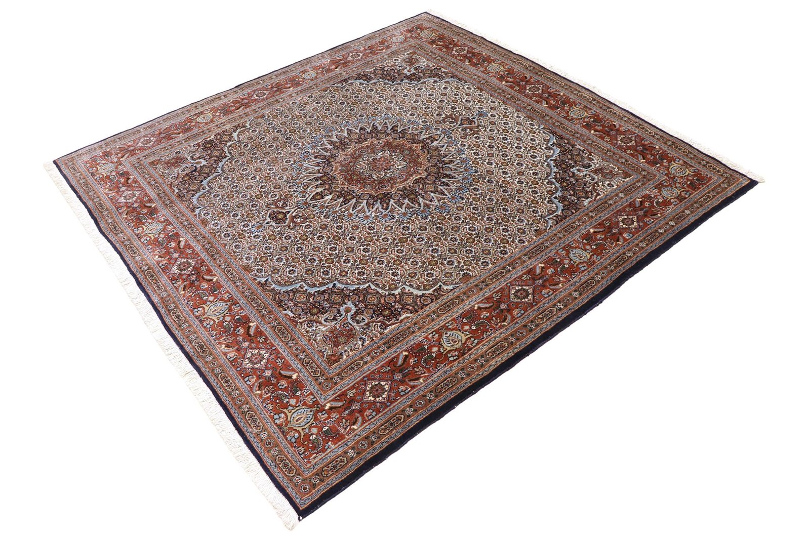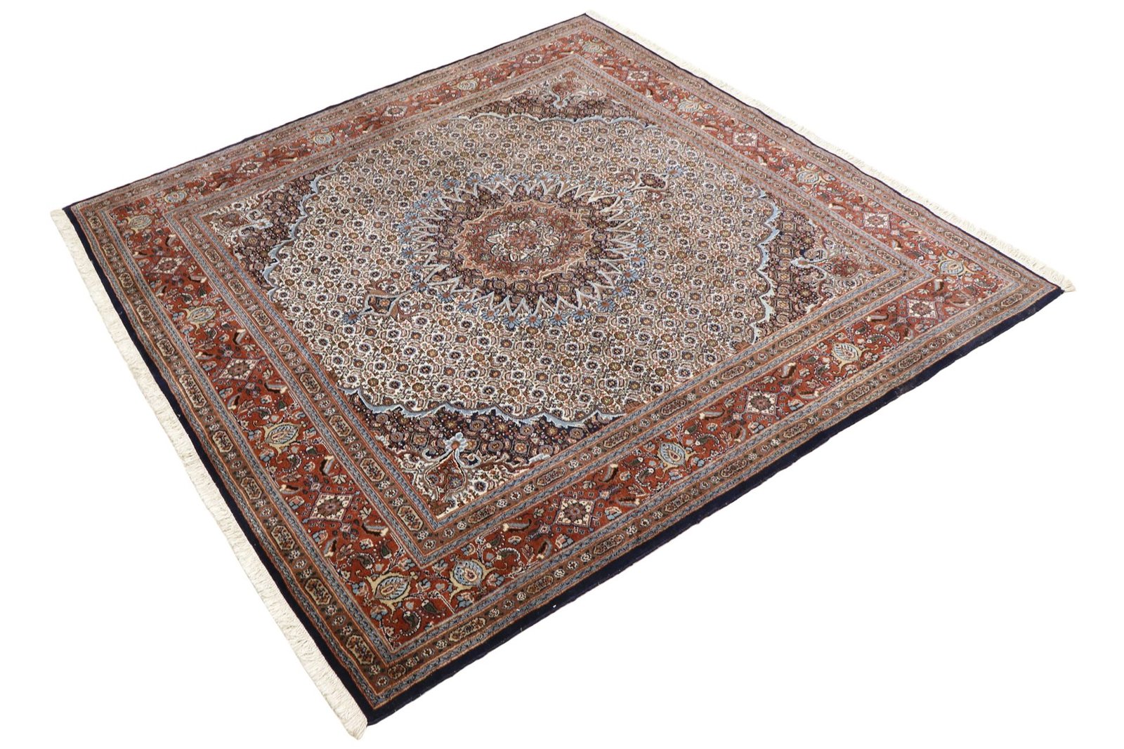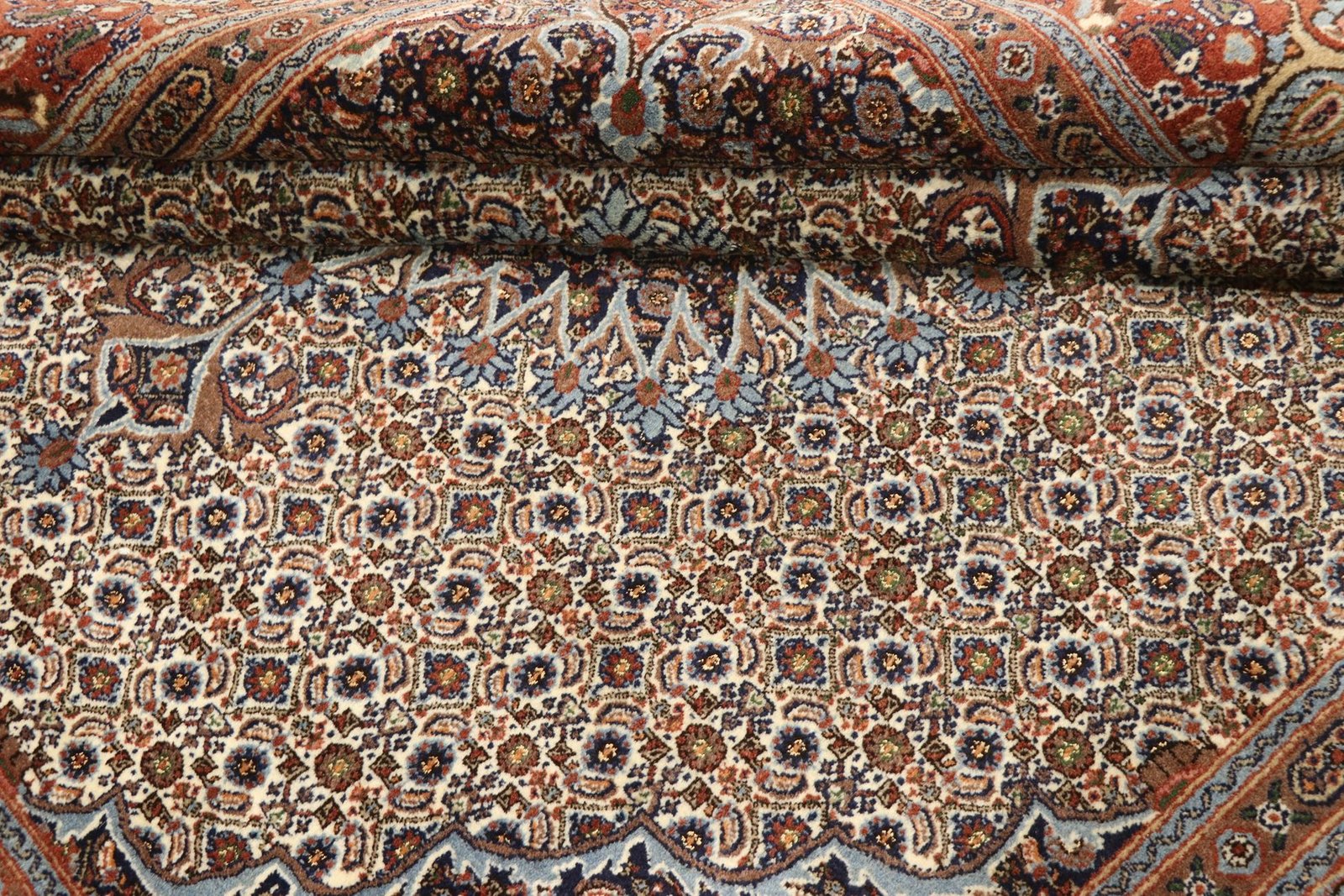 Moud is a well-known oriental carpet, famous for its small patterns and harmonious shades of white and blue. It is traditionally knotted with silk, which gives it a special elegance. Classic oriental carpets are hand-knotted unique pieces whose typical patterns are passed down from generation to generation. The region of origin influences the manufacturing method, the material and the motifs of the carpet. These traditions are particularly reflected in high-quality Persian carpets, which are named after their city of origin. These hand-knotted works of art are characterised by first-class materials, high knot density, unique colour harmonies and traditional designs. Whether made of precious silk or soft sheep’s wool, the Moud carpet adds a special touch to any room and sets stylish accents.