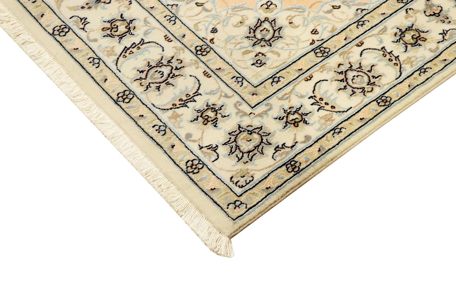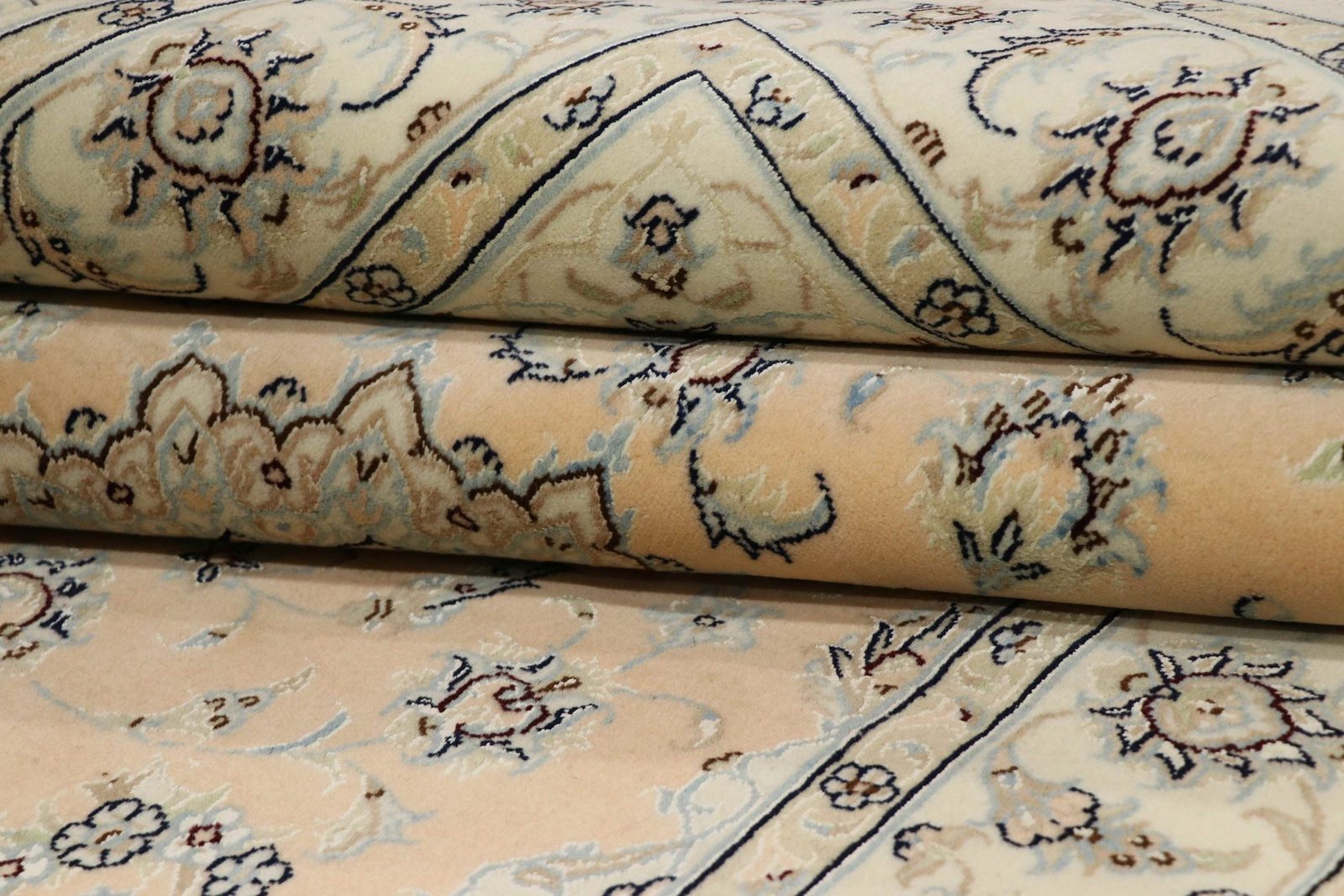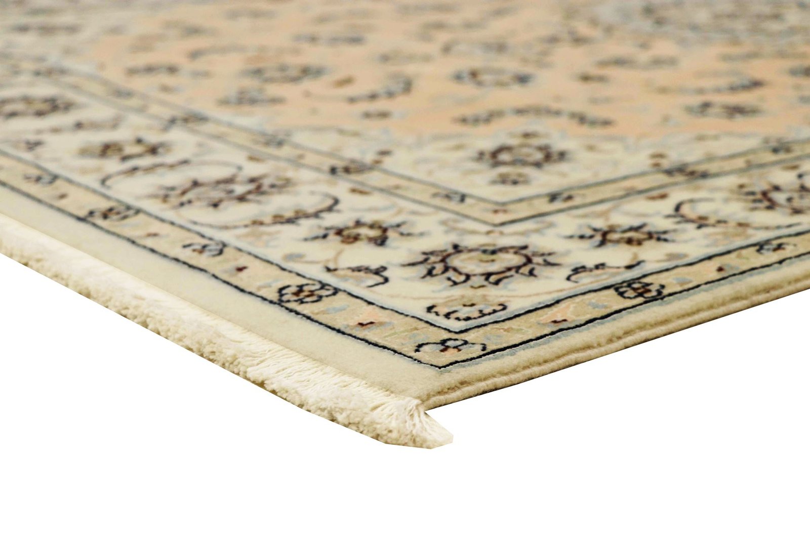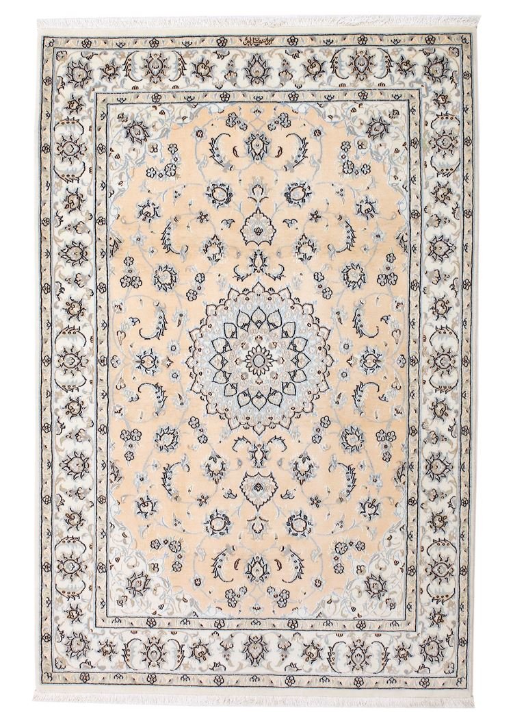 Nain is a picturesque town in southern Persia, famous for its exquisite carpets. These carpets, often in white and light blue with silk, are known for their fine quality and soothing aesthetics. Nain has a long tradition of excellent master weavers who are famous for producing high-quality oriental carpets. Classic oriental carpets are hand-knotted, unique pieces that have retained their characteristic patterns through centuries-old traditions. The manufacturing method, material and motifs are strongly influenced by the region of origin, which is particularly true of fine Persian carpets. These works of art are characterised by first-class materials, high knot density and harmonious colours, lending every room a special touch.