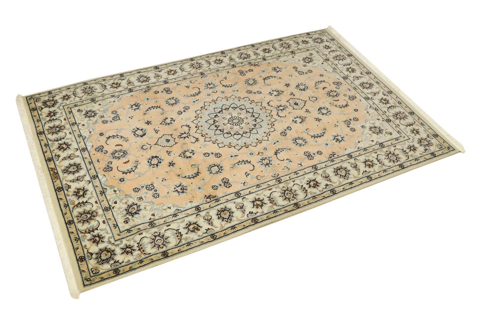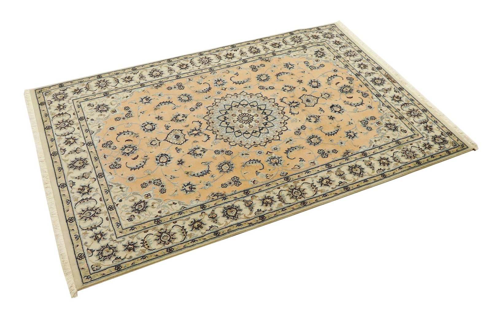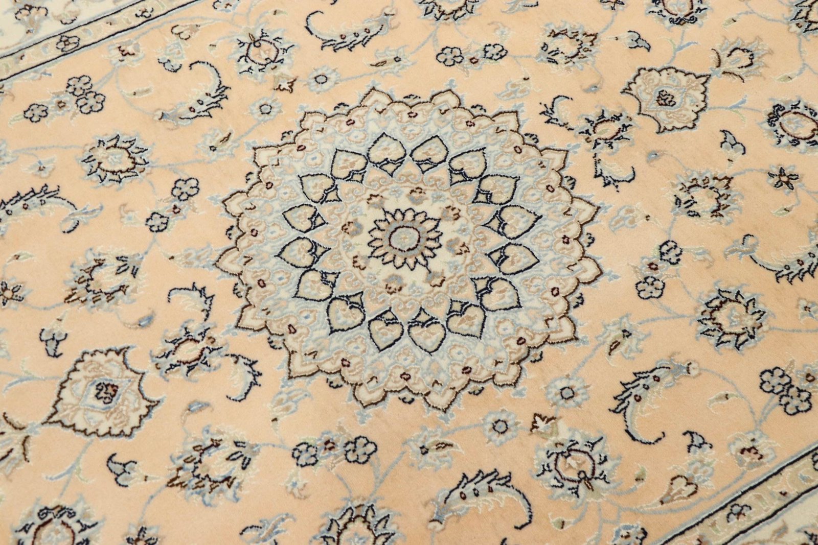 Nain is a picturesque town in southern Persia, famous for its exquisite carpets. These carpets, often in white and light blue with silk, are known for their fine quality and soothing aesthetics. Nain has a long tradition of excellent master weavers who are famous for producing high-quality oriental carpets. Classic oriental carpets are hand-knotted, unique pieces that have retained their characteristic patterns through centuries-old traditions. The manufacturing method, material and motifs are strongly influenced by the region of origin, which is particularly true of fine Persian carpets. These works of art are characterised by first-class materials, high knot density and harmonious colours, lending every room a special touch.