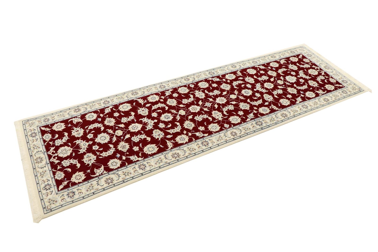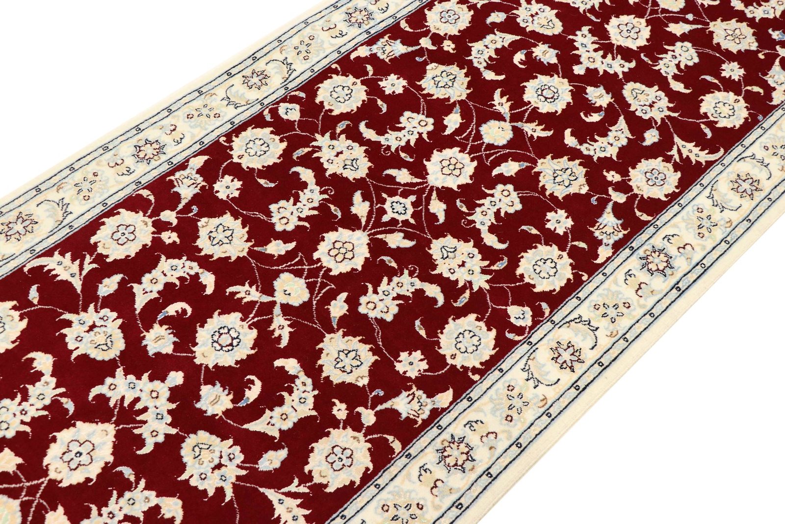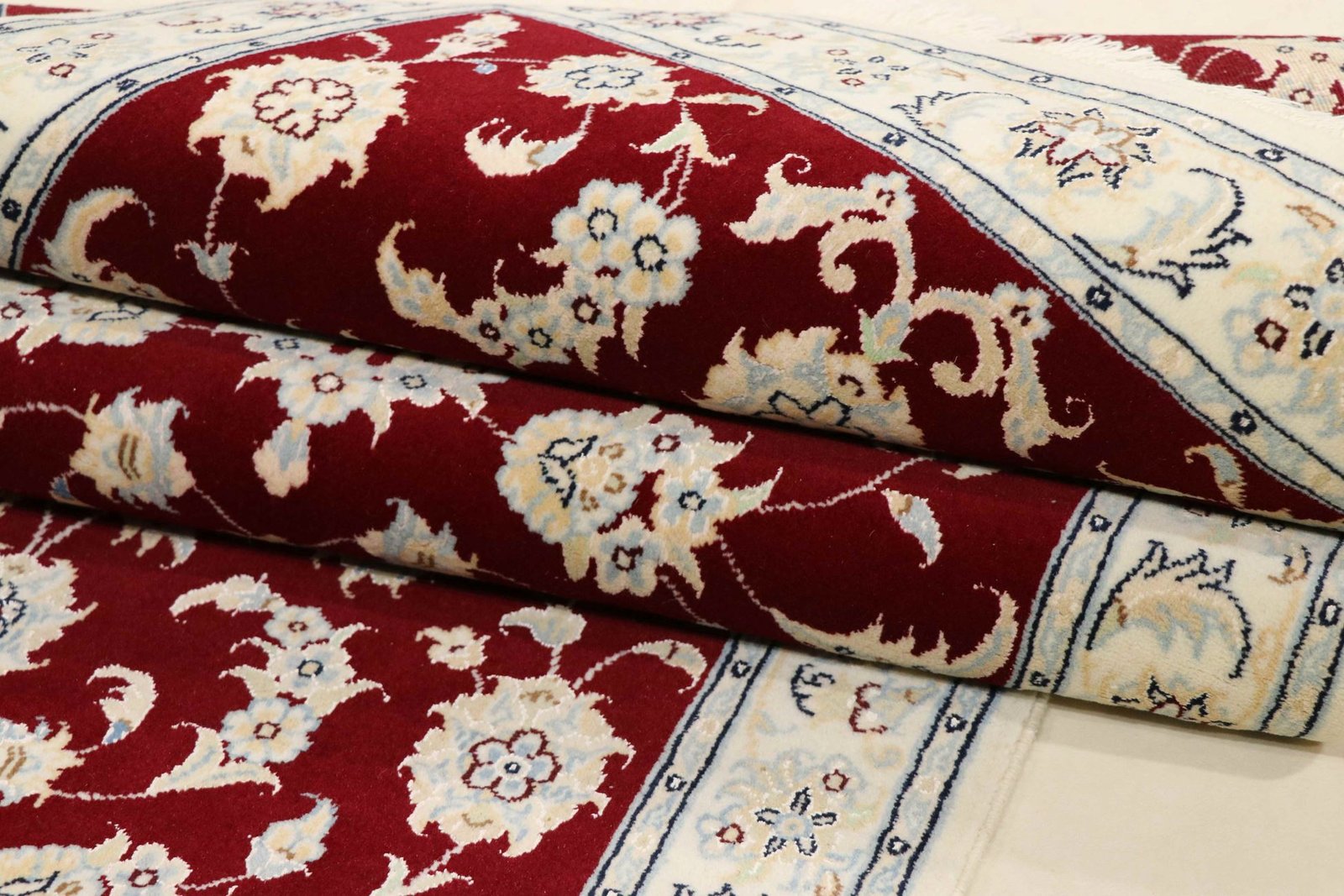 Nain, a picturesque town in southern Persia, is famous for its exquisite carpets. Carpets from Nain are known for their fine quality and typical designs, which are often in white and light blue and contain silk. The town has a long tradition of carpet weaving, and its masters are renowned for their exceptional craftsmanship. Classic oriental carpets from Nain are hand-knotted, unique pieces that captivate with their attention to detail and unique patterns. These carpets reflect their origins and tradition and are valued for their first-class materials, high knot density and harmonious colours. Whether made of precious silk or soft wool, a Nain carpet adds a special, luxurious touch to any room and embodies the tradition of Persian carpet art.