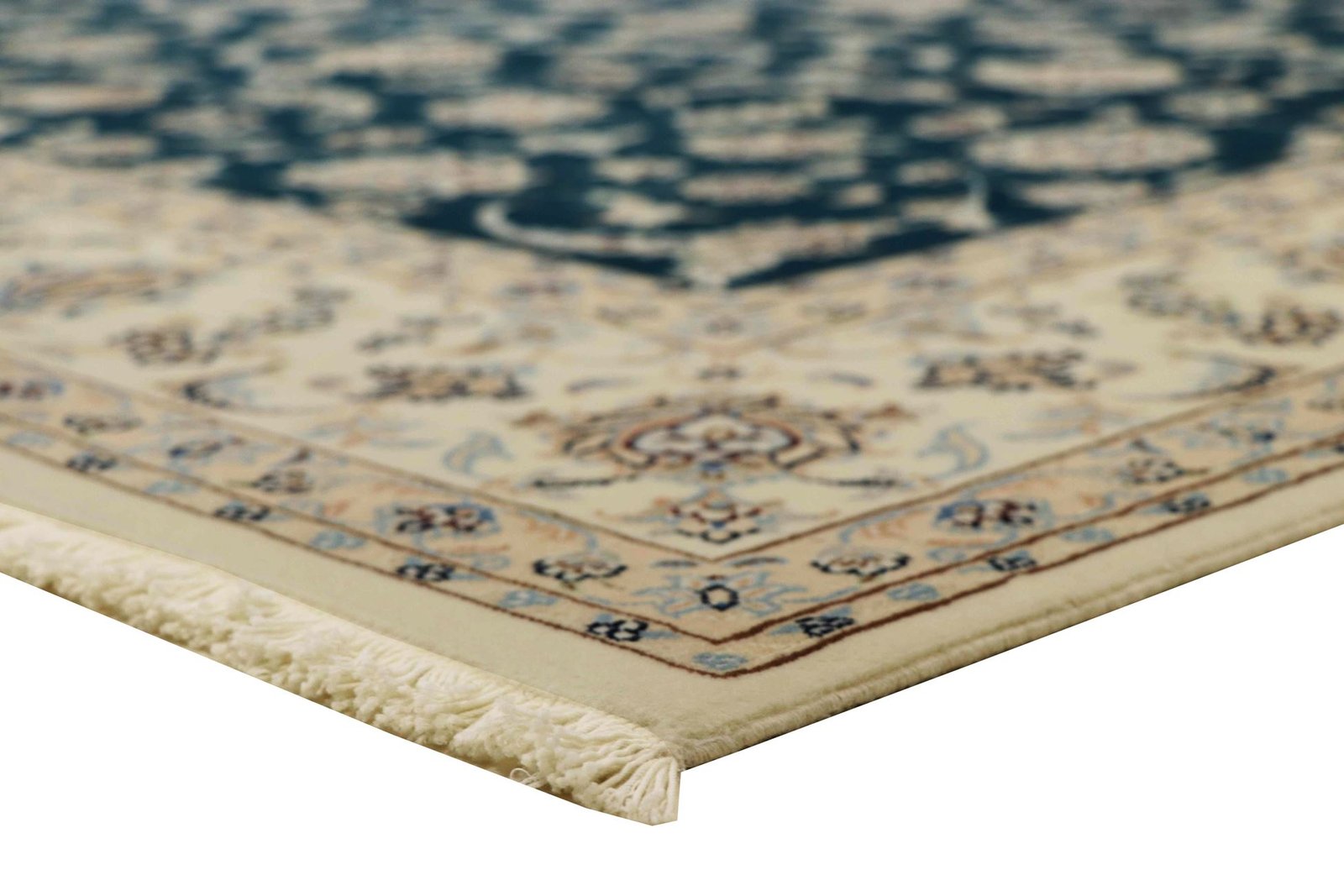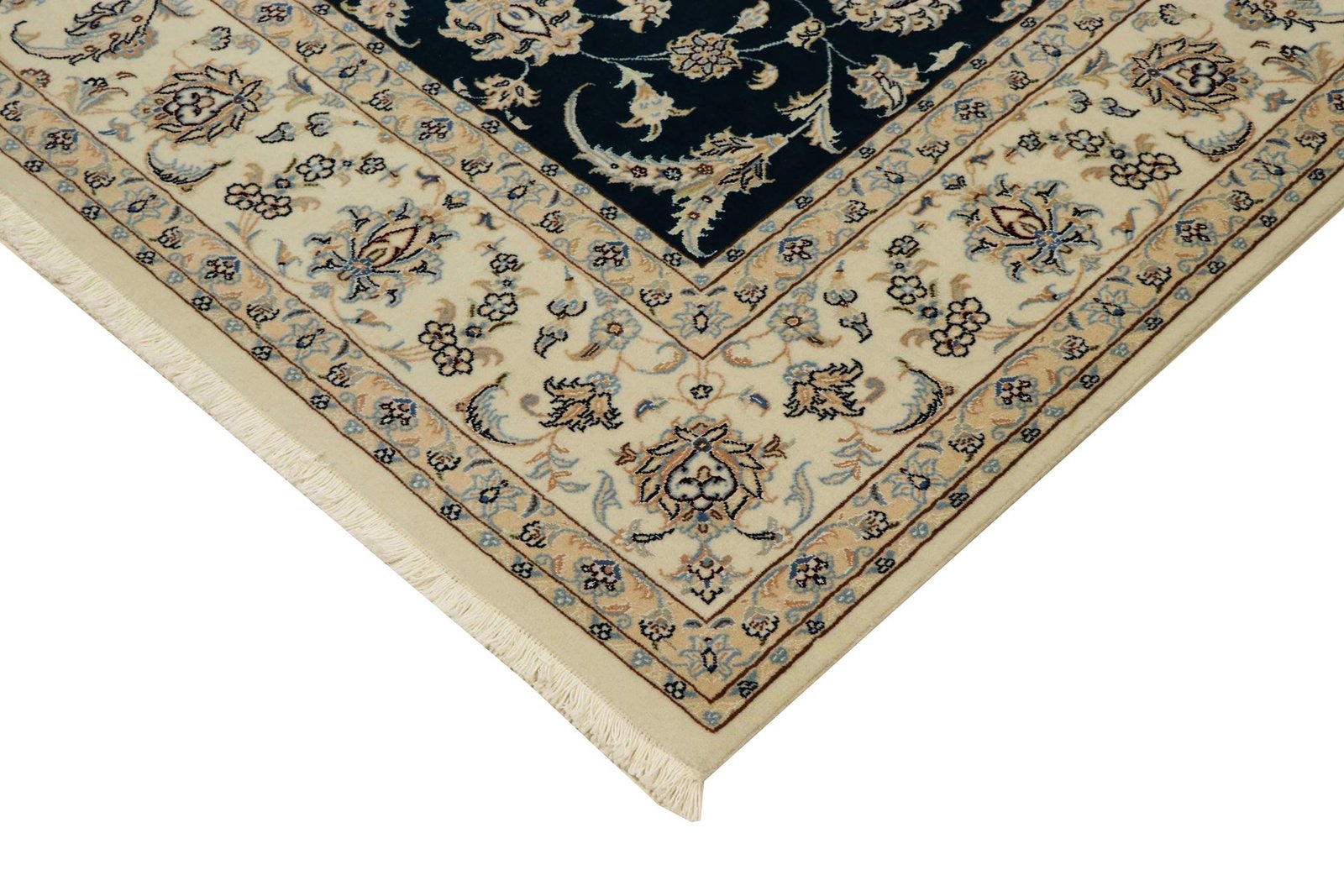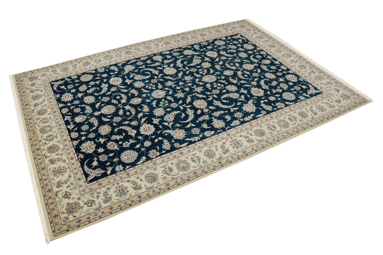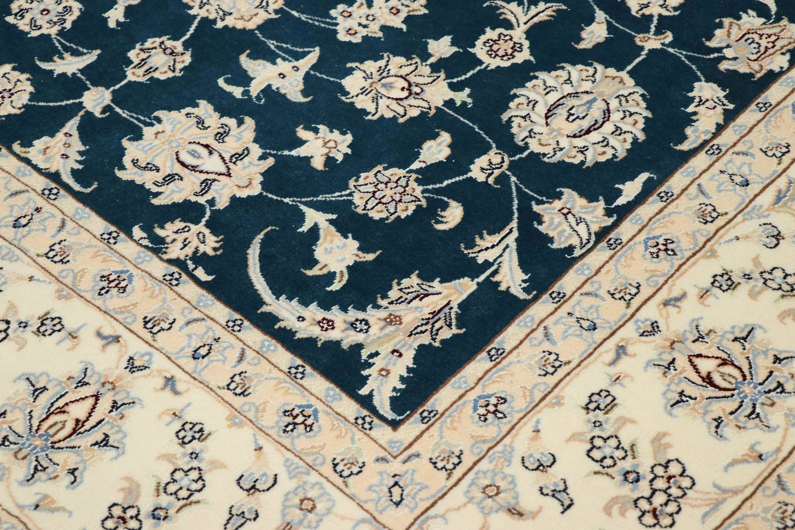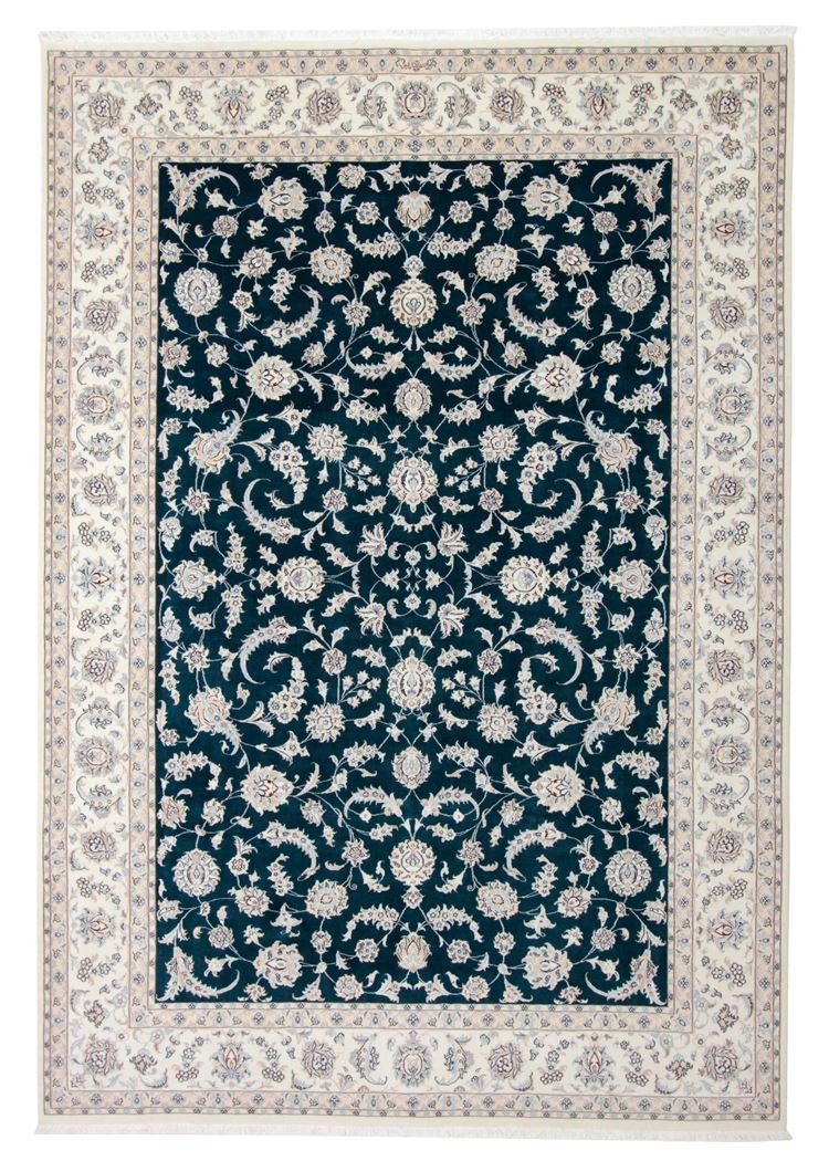 Nain, a charming city in southern Persia, is famous for its exquisite carpets, which captivate with their high quality and fine workmanship. Carpets from Nain are known for their elegant colour scheme in white and light blue and the use of the finest silk. The city has a long tradition of masterful weavers who are valued for the delicacy and beauty of their oriental carpets. Classic oriental carpets from Nain are hand-knotted, unique pieces whose patterns are passed down from generation to generation. These carpets are characterised by first-class materials, high knot density, unique colour harmonies and traditional designs. Whether made from precious silk or soft cork wool, an oriental carpet from Nain adds a special, elegant touch to any room.