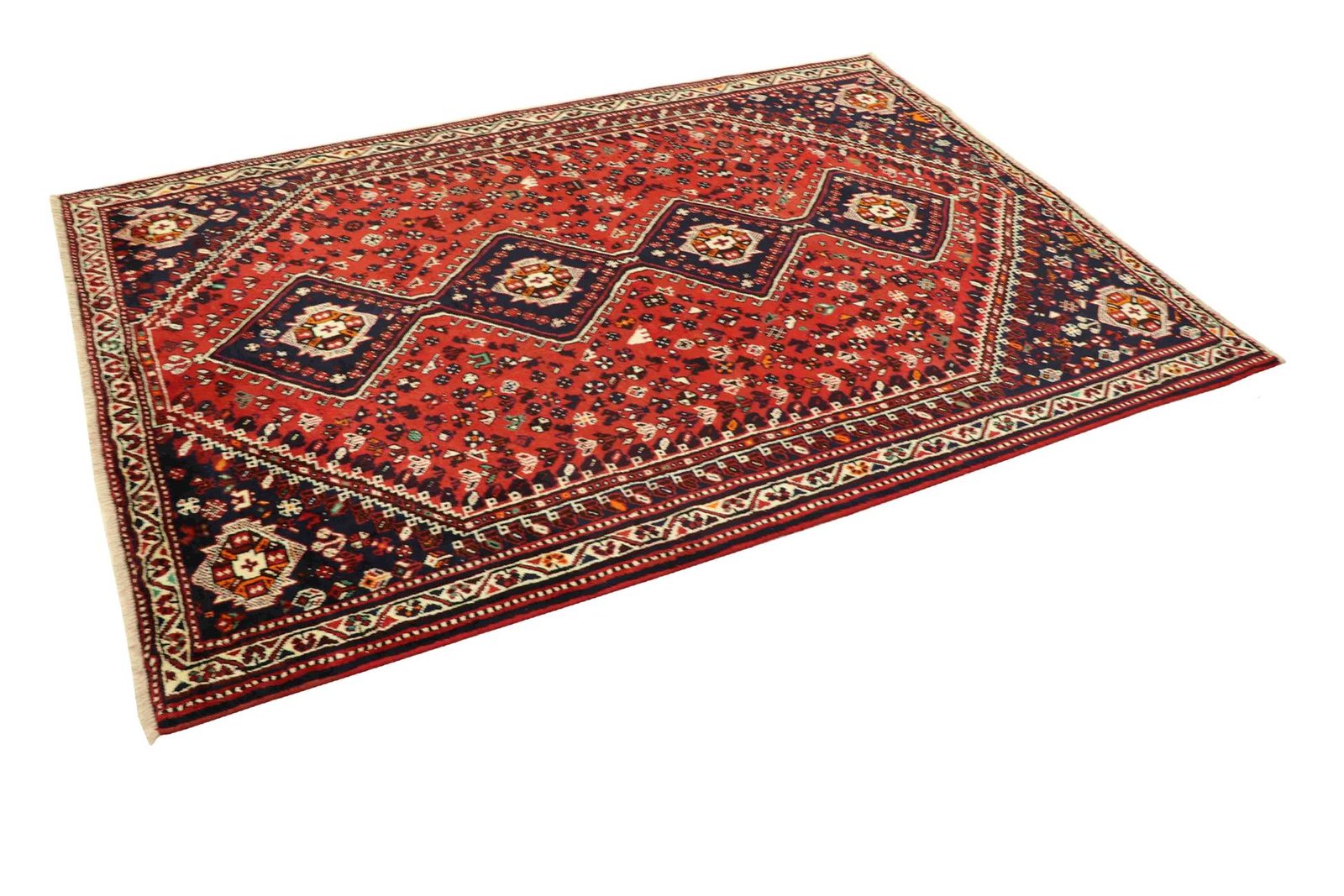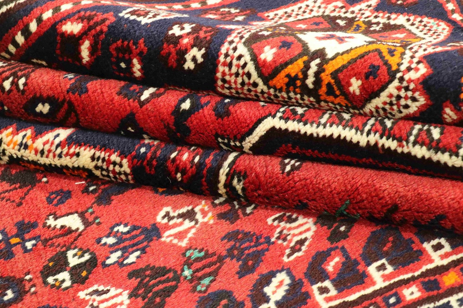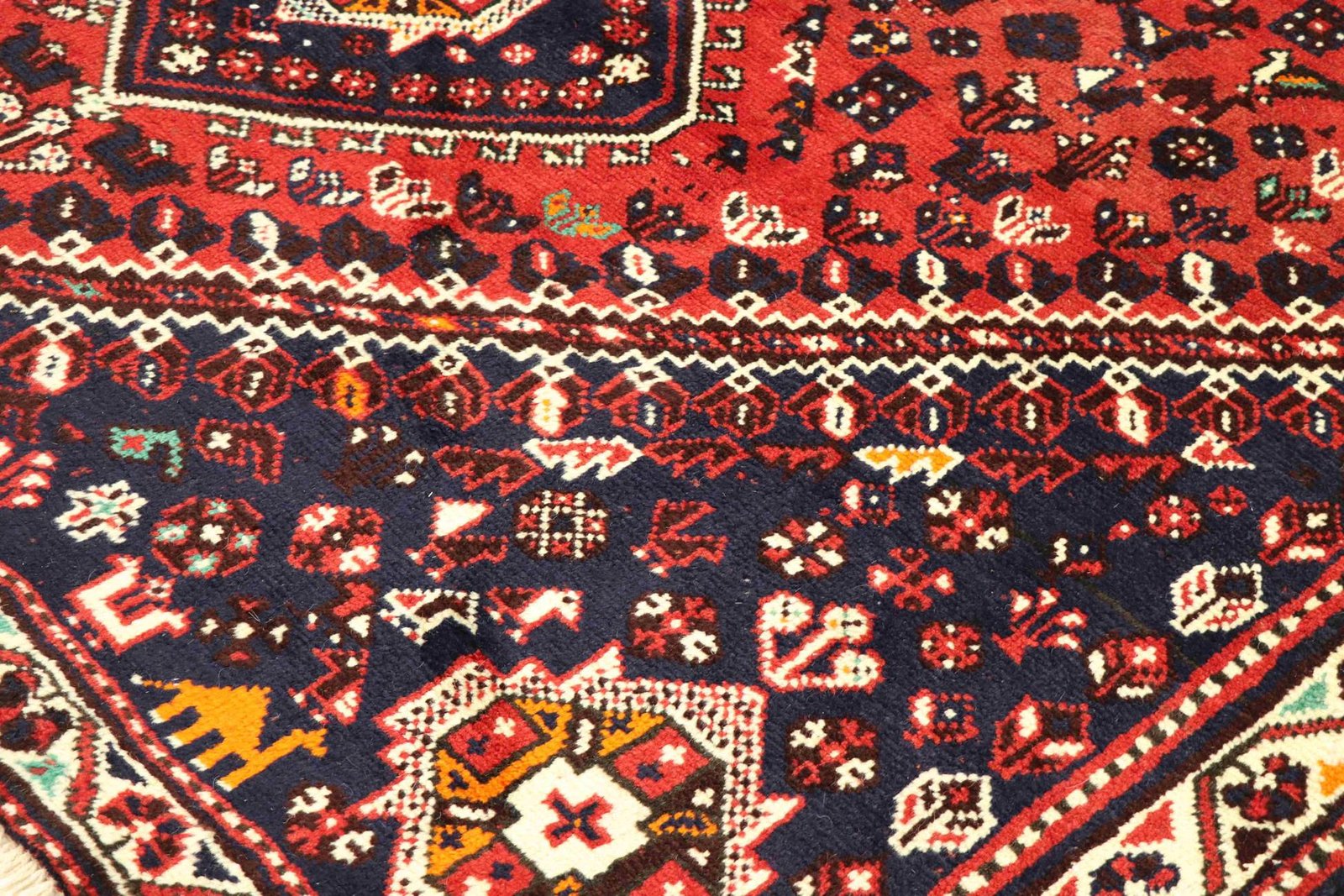 This carpet belongs to the village and nomadic carpets from Iran. It is woven by hand in small towns and villages as well as by nomads in the open air using traditional methods. Carpets such as those from Shiraz and Ghashghai are created without a template and entirely from memory. They are known for their linear and geometric patterns. The cultural and traditional origins of these carpets give them a unique character that reflects ancient Persia. Each carpet is an expression of centuries-old craftsmanship and cultural identity, lending a special historical touch to any room.