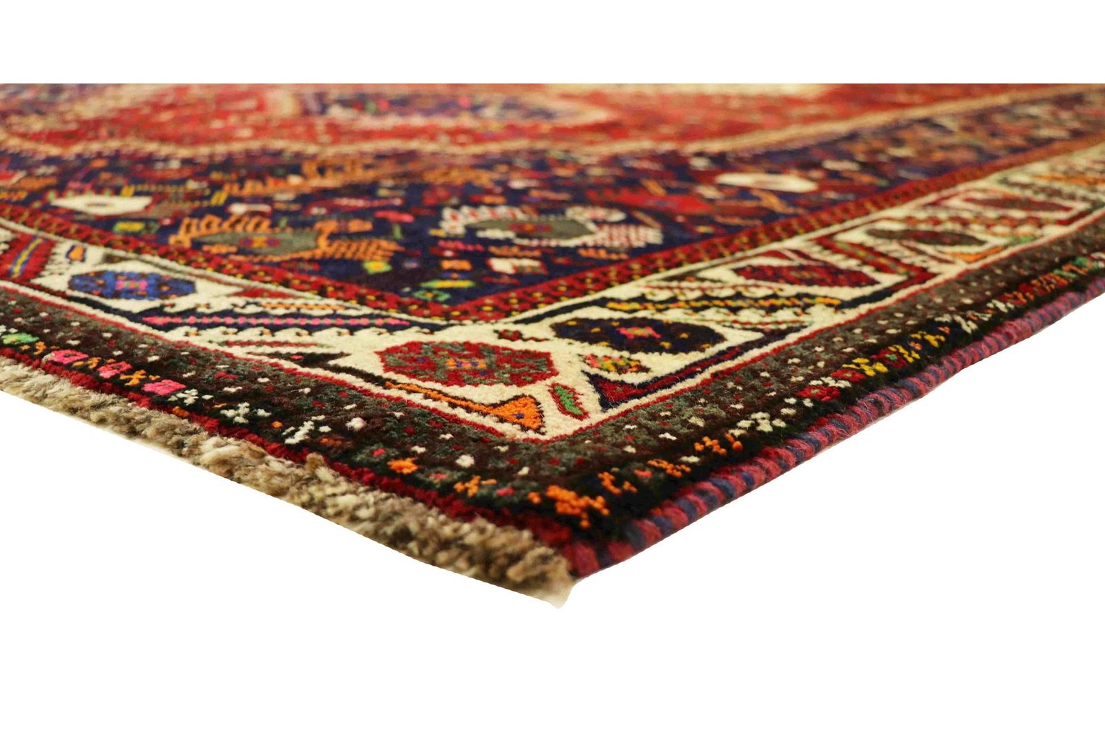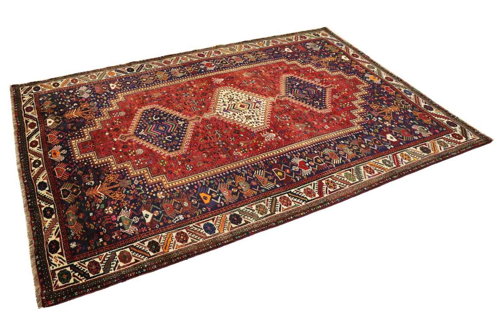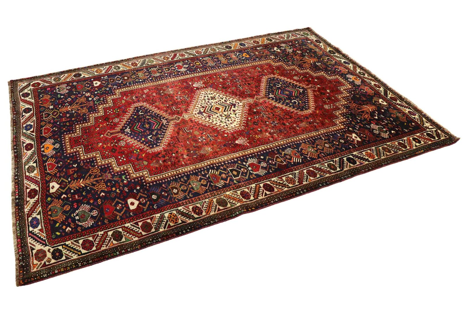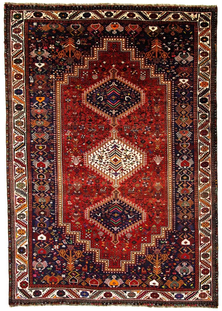 This carpet is one of the traditional village and nomadic carpets from Iran. In small towns and villages, as well as by nomads in the open air, carpets such as those from Shiraz and Ghashghai are made according to ancient craftsmanship. These carpets are knotted directly from the mind without a template, and are characterised by straight lines and geometric patterns. Their manufacturing method and cultural heritage give them a unique character that embodies ancient Persia. Thanks to this traditional manufacturing method and authentic design, these carpets bring not only aesthetic beauty but also a piece of history and cultural depth to any room.