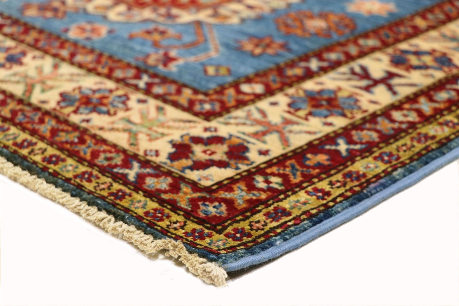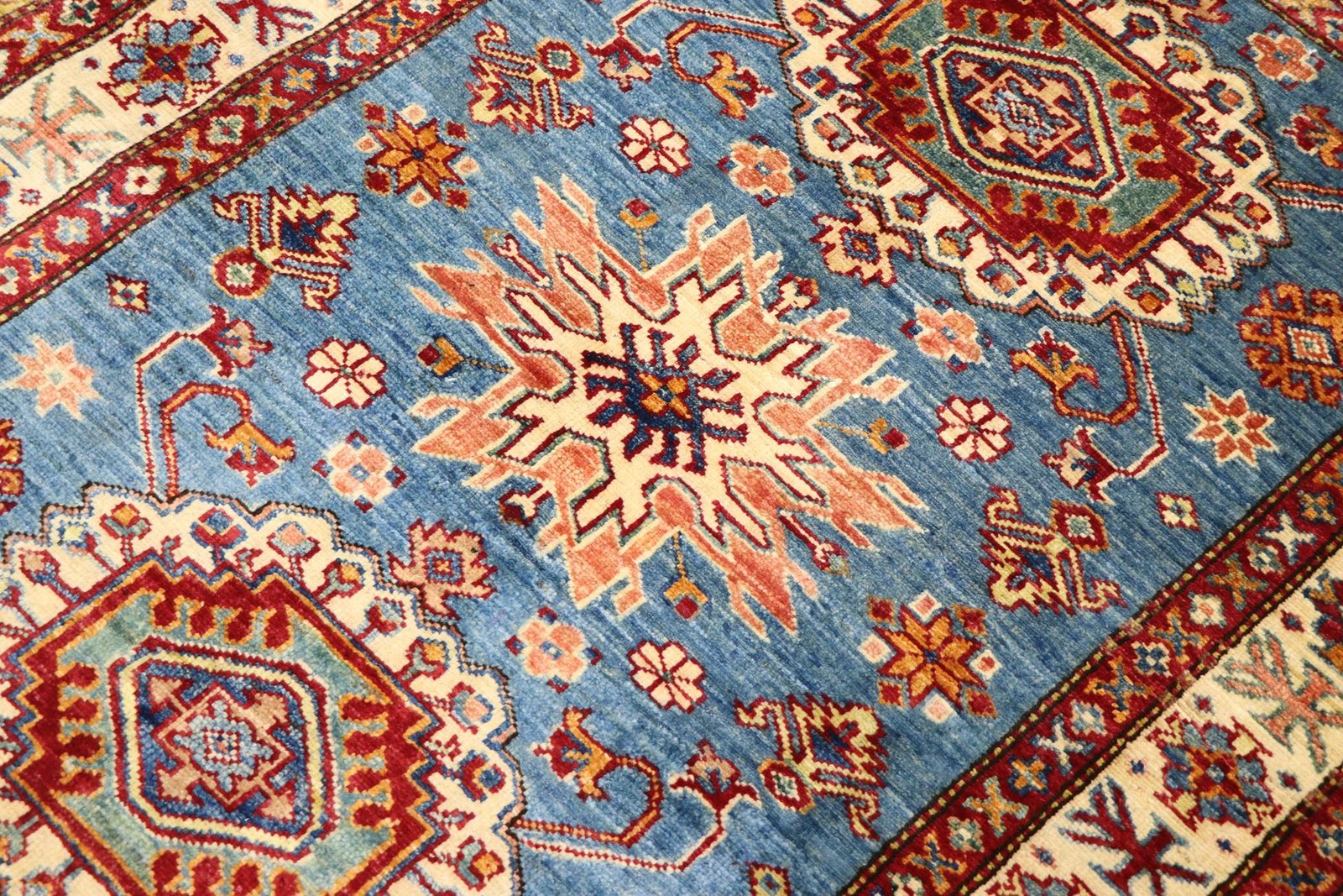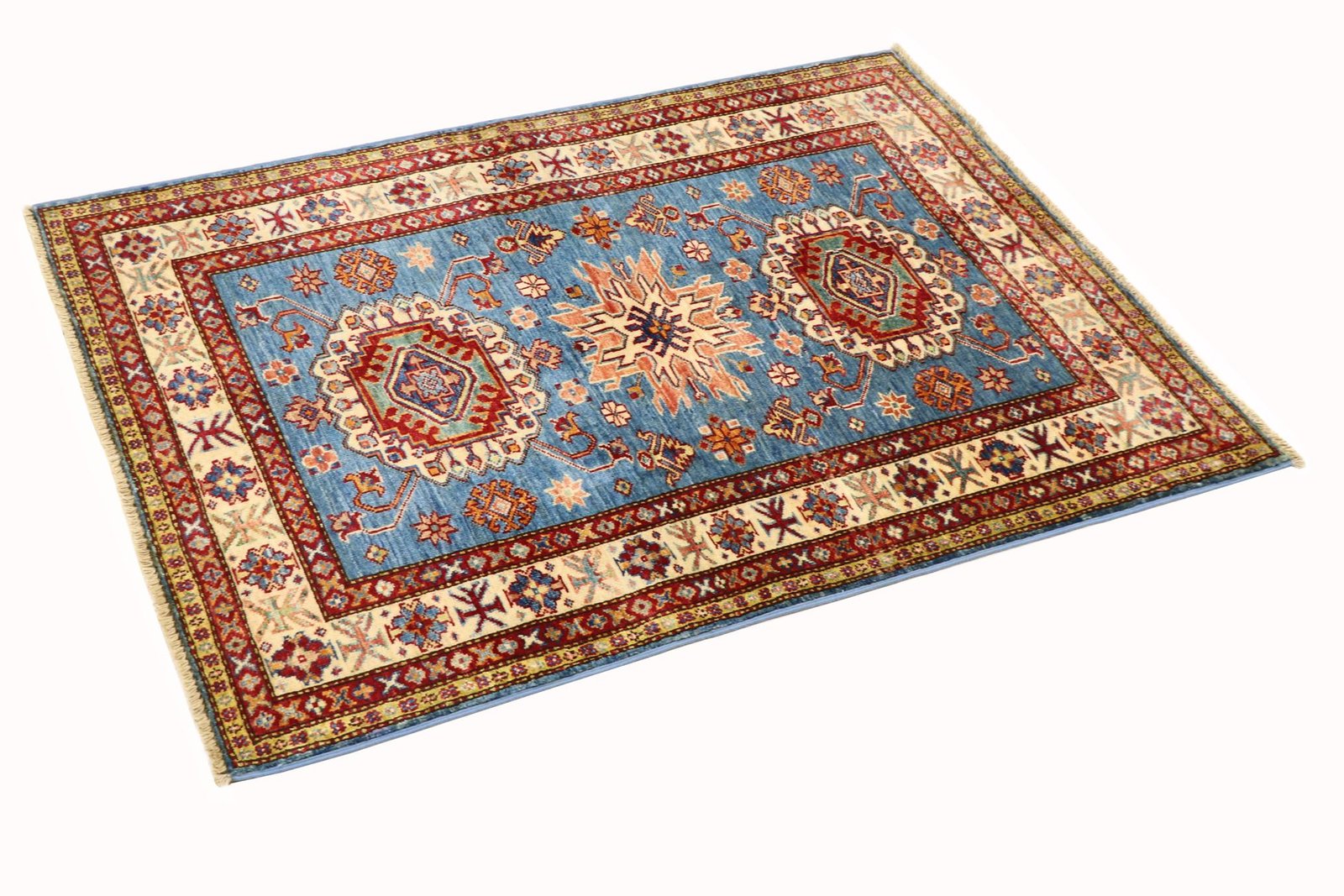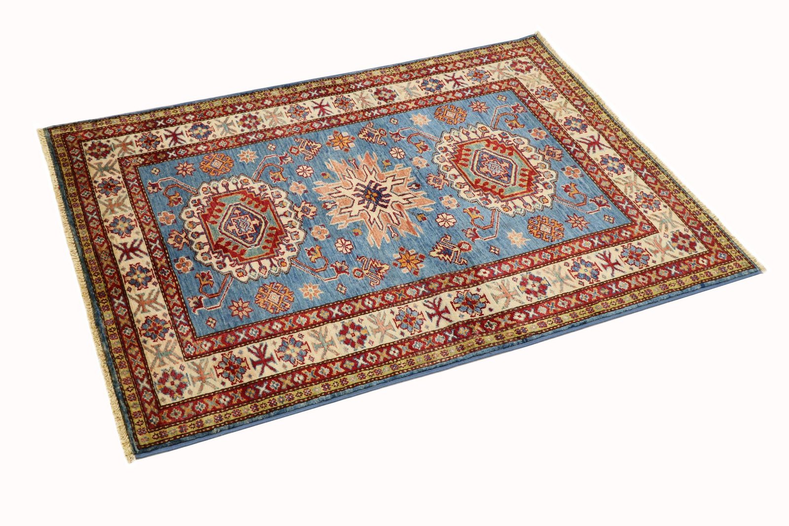 This hand-knotted Kazak embodies the traditional art of Caucasian carpets. With its robust structure and vibrant colours, it reflects the centuries-old culture of the Caucasus. The carpets from this region are known for their fascinating, simple patterns and impressive variety of colours. Among Oriental carpets, this Kazak is particularly sought after, both in the Orient and in Europe. Its simple patchwork and deliberate use of colour accents make it ideal for combining with modern interior design trends. The timeless beauty and traditional craftsmanship make this carpet a coveted piece for stylish interiors.