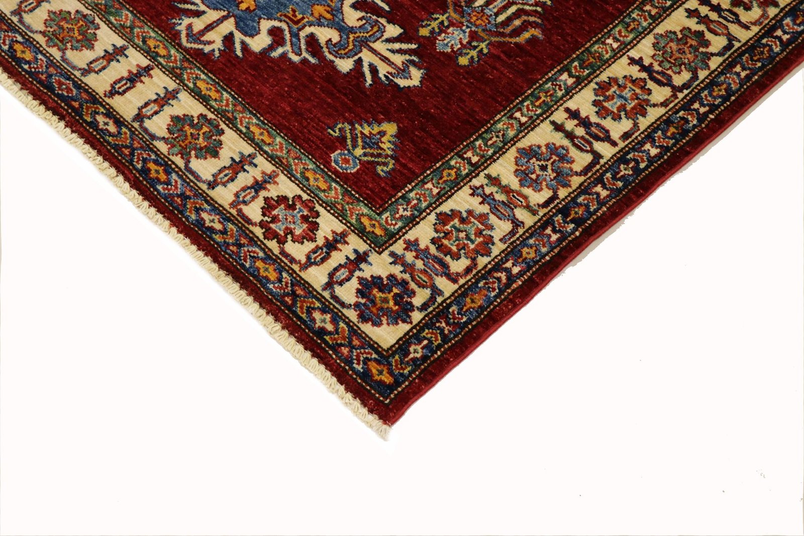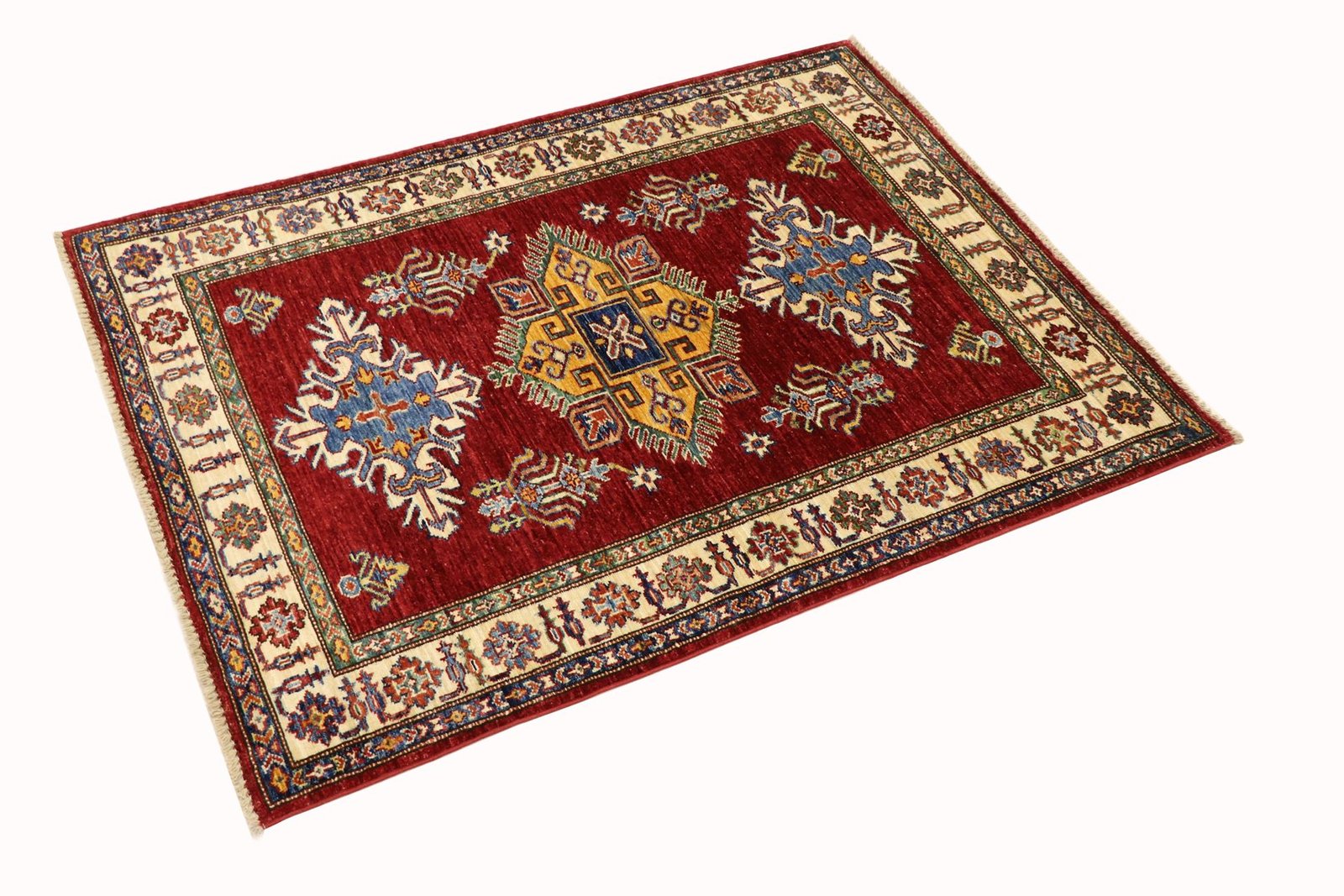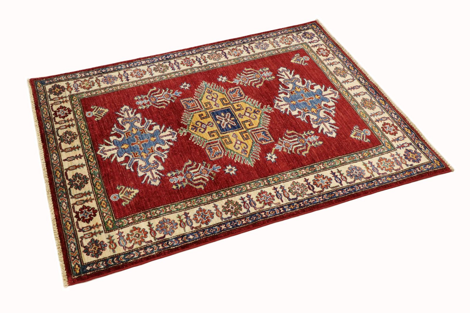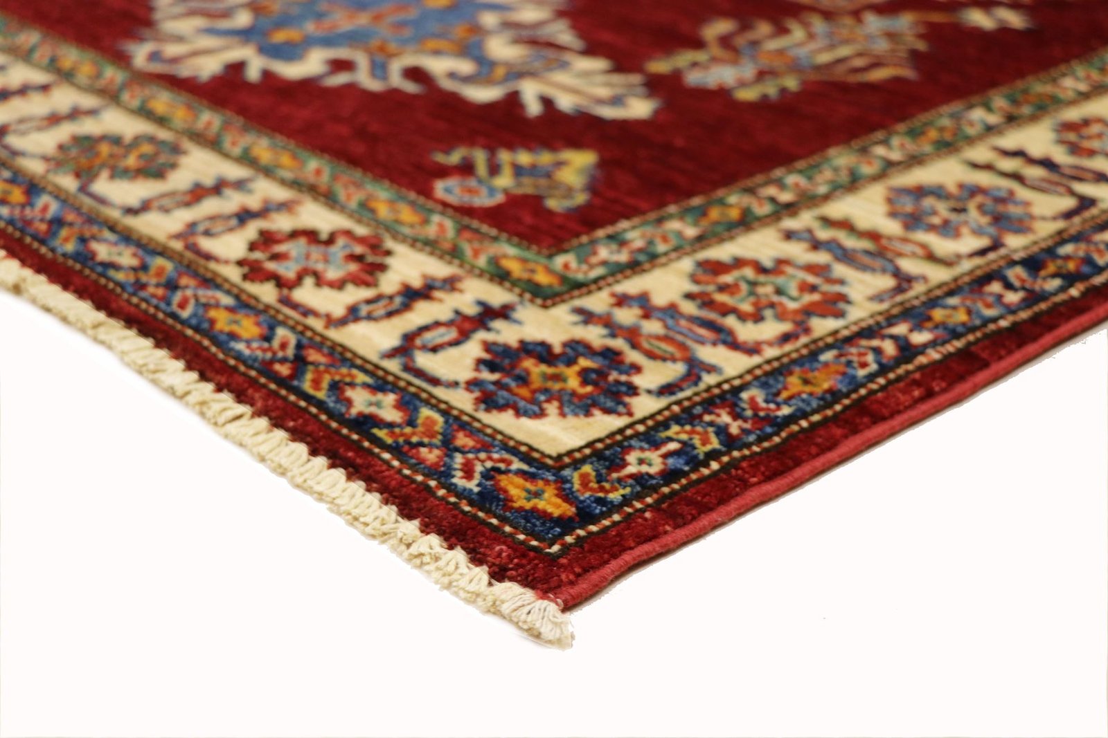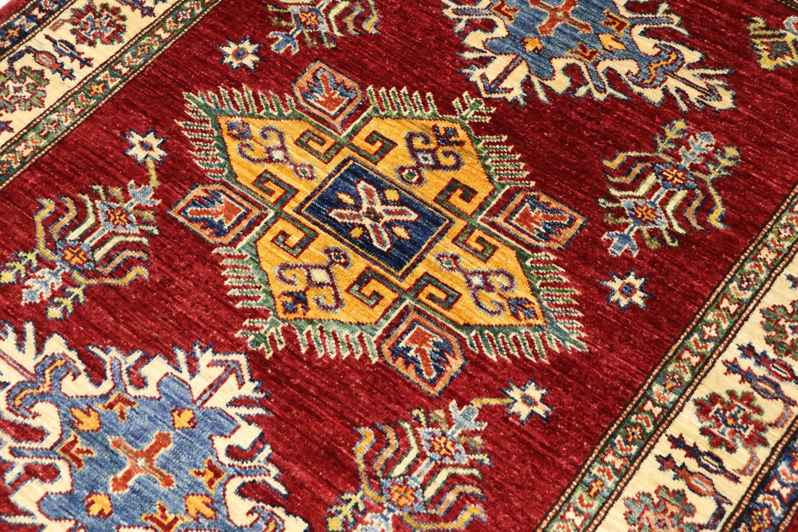 This hand-knotted Caucasian-style Kazak rug impresses with its high durability and vibrant colours. It embodies the centuries-old tradition of Caucasian rug knotting and features an impressive blend of simple shapes and vibrant colours. Among Oriental rugs, this Kazak is particularly sought after, both in the Orient and in Europe. The skilful combination of simplicity and colour accents makes it perfect for modern interiors. Its design and quality allow it to be integrated into a variety of living styles and contribute to cultural authenticity and aesthetic elegance.