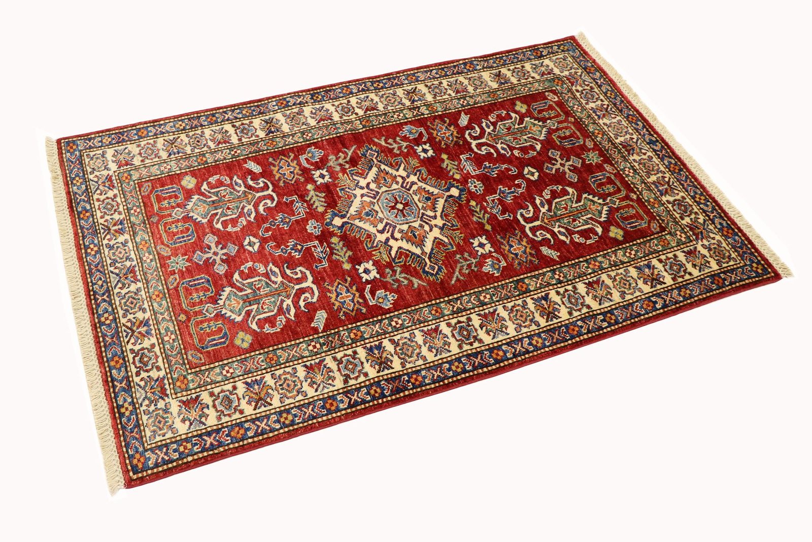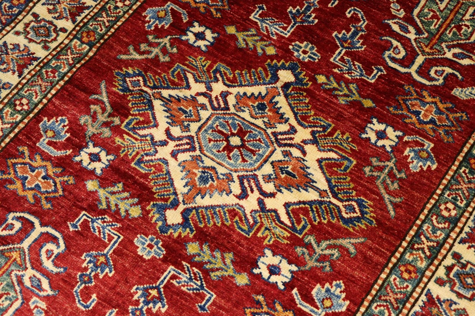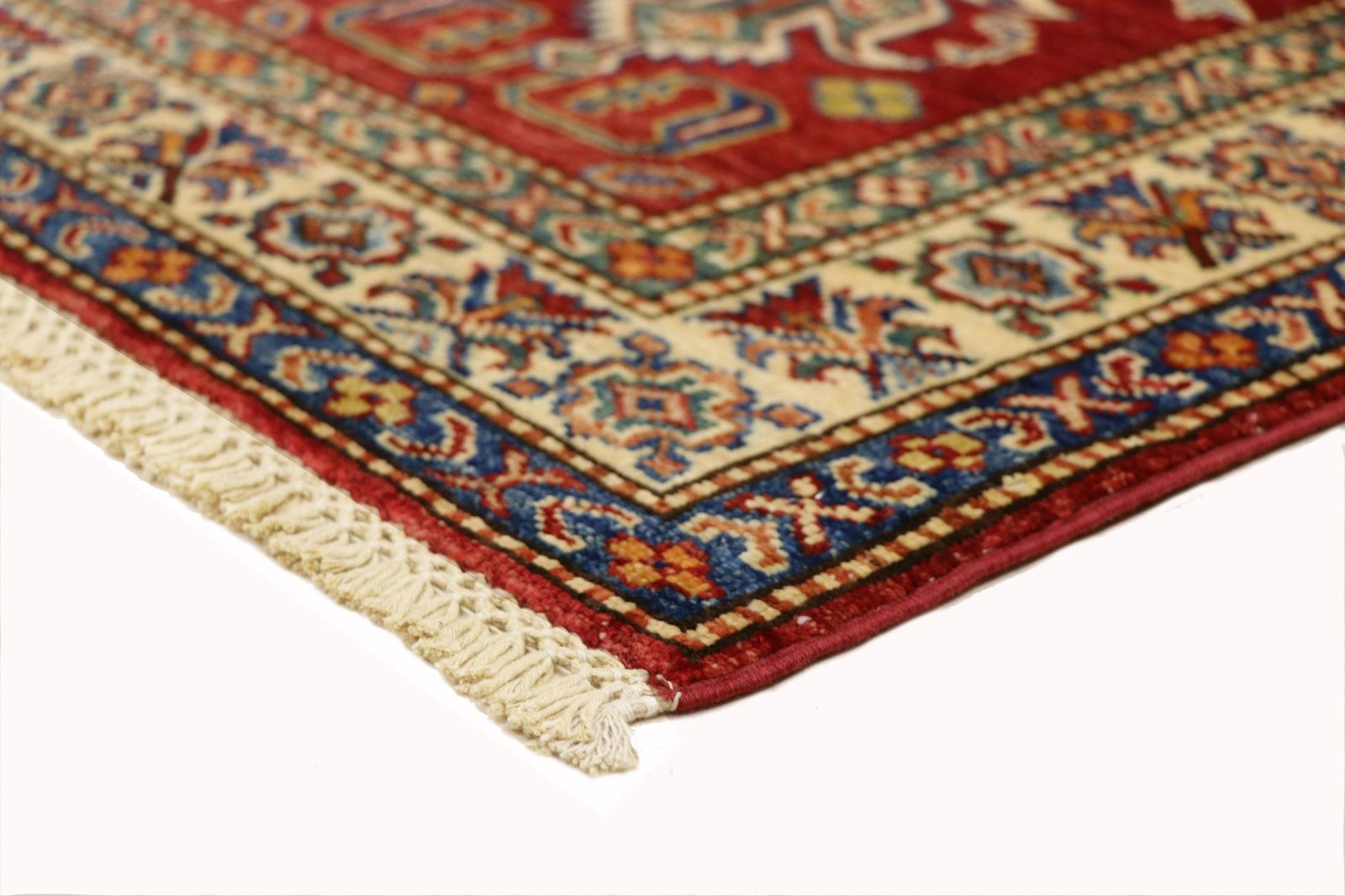 This hand-knotted Kazak, made in the classic style of Caucasian carpets, impresses with its robustness and vibrant colours. It is an impressive representation of the traditional culture of the Caucasus, known for its craftsmanship in carpet weaving. The carpets are characterised by charmingly simple shapes and intense colours that have been preserved for centuries. Among Oriental carpets, this Kazak is particularly sought after, both in the Orient and in Europe. Its simple patchwork and deliberate colour accents make it particularly versatile and ideal for combining with current interior design styles. Its authentic charm and harmonious blend of tradition and modernity make it a timeless gem for any home.