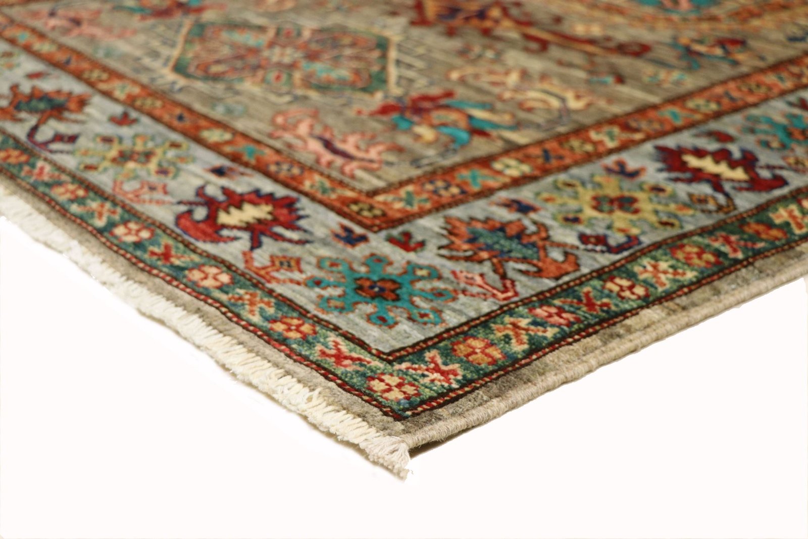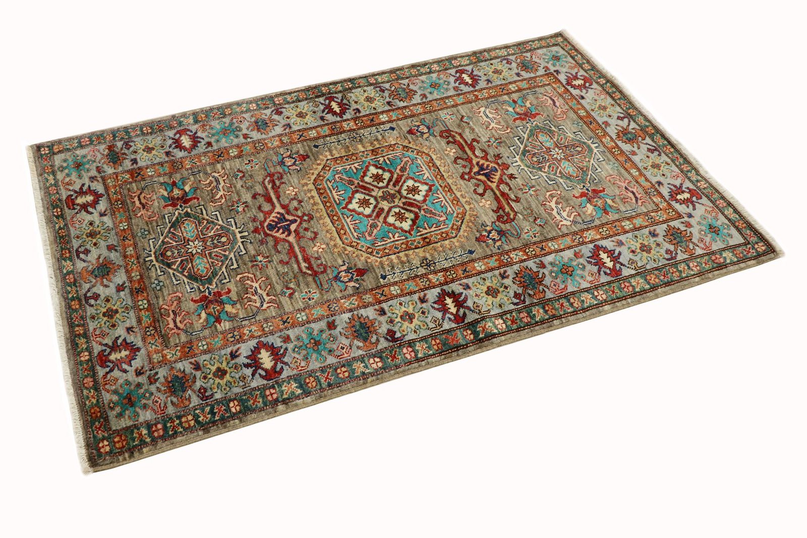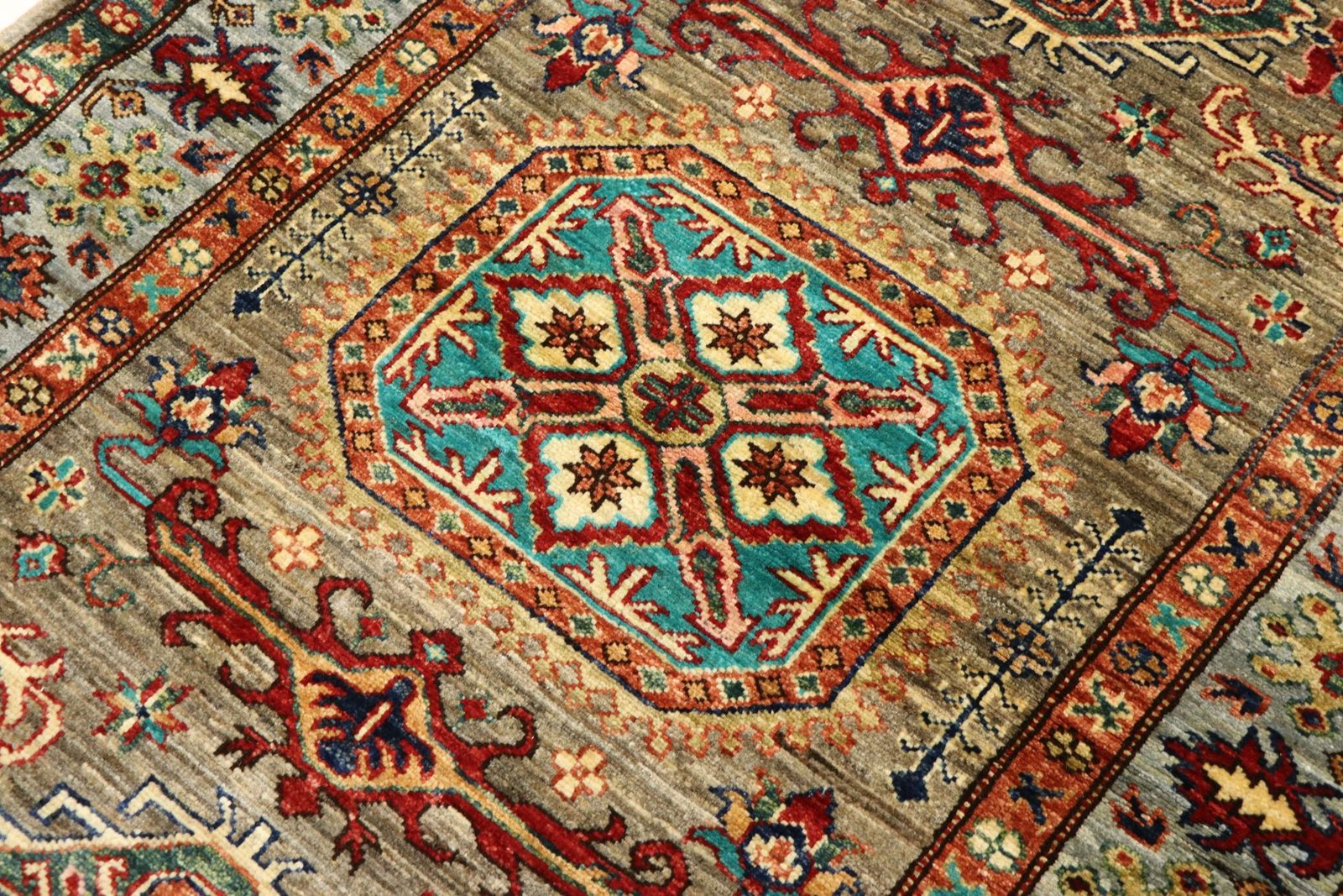 This hand-knotted Kazak carpet, made in the traditional Caucasian style, impresses with its exceptional robustness and vibrant colours. It embodies the centuries-old art of carpet weaving in the Caucasus region, which is characterised by simple but impressive designs. Among Oriental carpets, this Kazak is one of the most sought-after both in the Orient and in Europe. Particularly noteworthy are the skilful patchwork and harmonious colour accents, which make the carpet a perfect companion to current interior design trends. Its stylish, simple design fits seamlessly into modern and classic interiors, and the vibrant colours bring cultural depth to any room design.