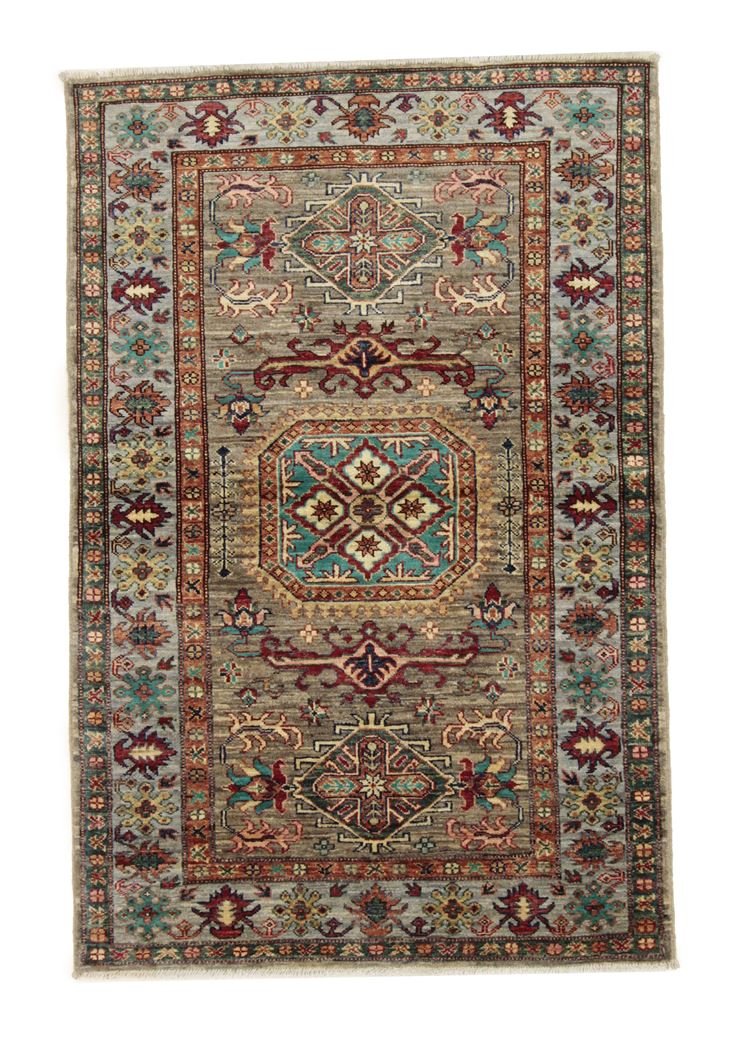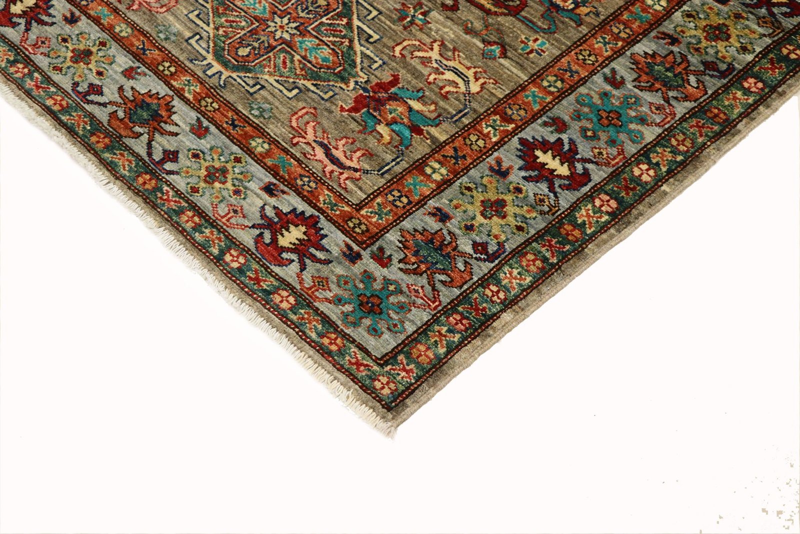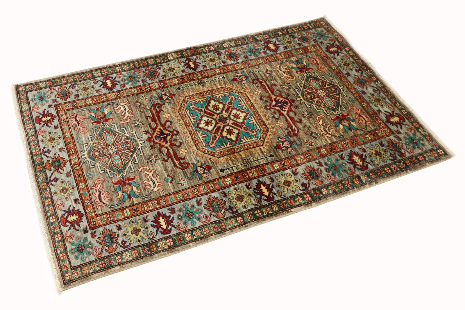 This hand-knotted Kazak carpet, made in the traditional Caucasian style, impresses with its exceptional robustness and vibrant colours. It embodies the centuries-old art of carpet weaving in the Caucasus region, which is characterised by simple but impressive designs. Among Oriental carpets, this Kazak is one of the most sought-after both in the Orient and in Europe. Particularly noteworthy are the skilful patchwork and harmonious colour accents, which make the carpet a perfect companion to current interior design trends. Its stylish, simple design fits seamlessly into modern and classic interiors, and the vibrant colours bring cultural depth to any room design.