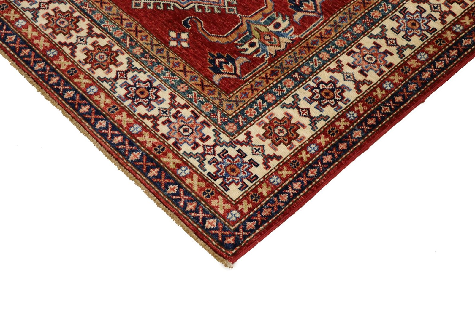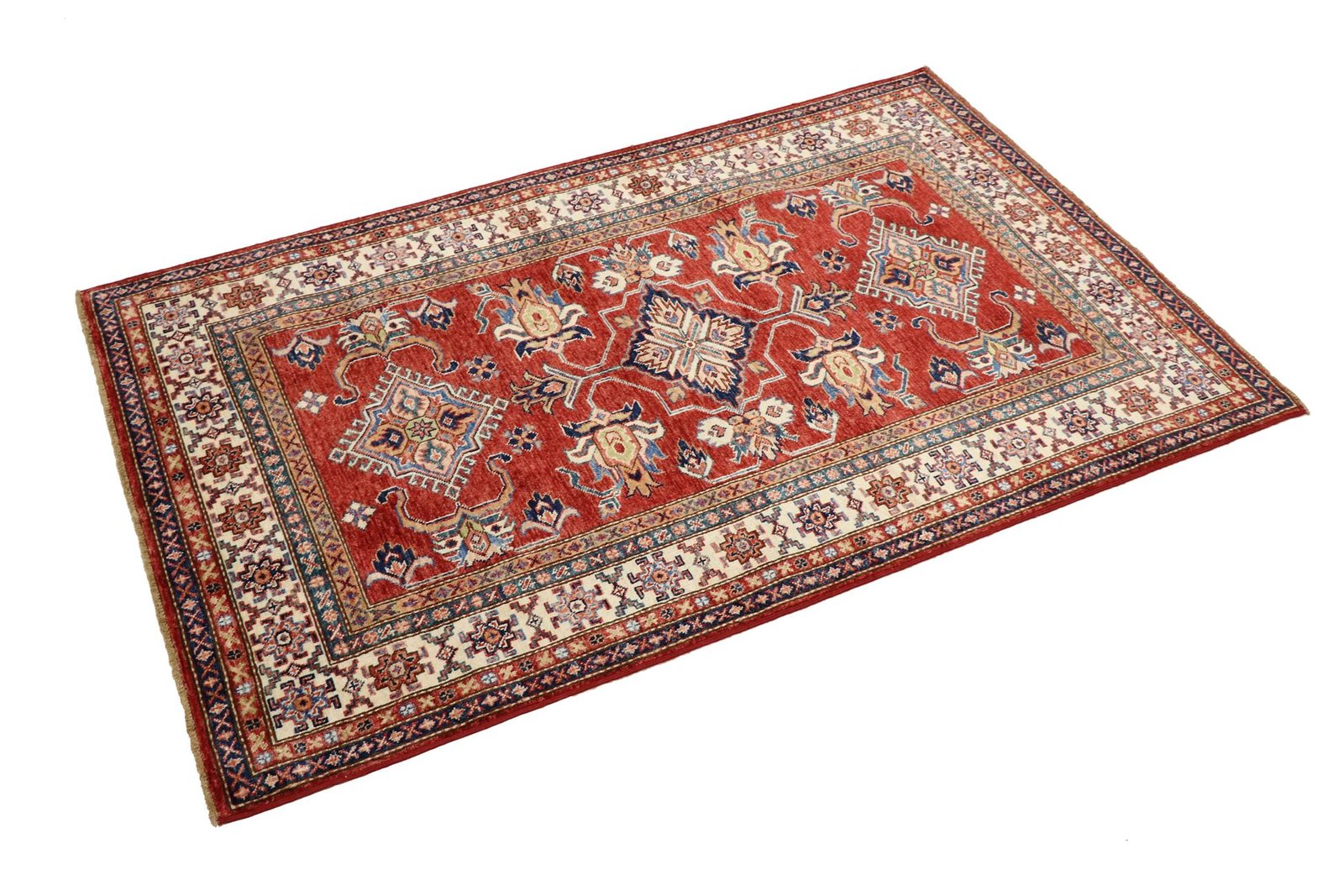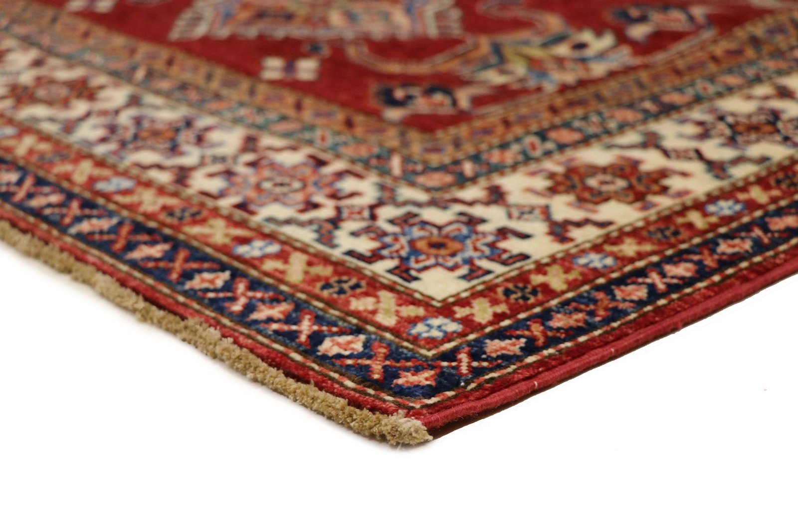 This hand-knotted Kazak rug, made in the traditional style of Caucasian rugs, impresses with its exceptional robustness and vibrant colours. It reflects the rich culture of the Caucasus, which is known for its centuries-old mastery of the art of rug knotting. The simple but appealing patterns and intense colours of this carpet are an expression of this cultural tradition. Among Oriental carpets, this Kazak is particularly sought after, both in the Orient and in Europe. The simple patchwork technique and the deliberate use of colour accents make it particularly versatile and adaptable to current trends and preferences in interior design. It is a perfect addition to both modern and classic interiors.