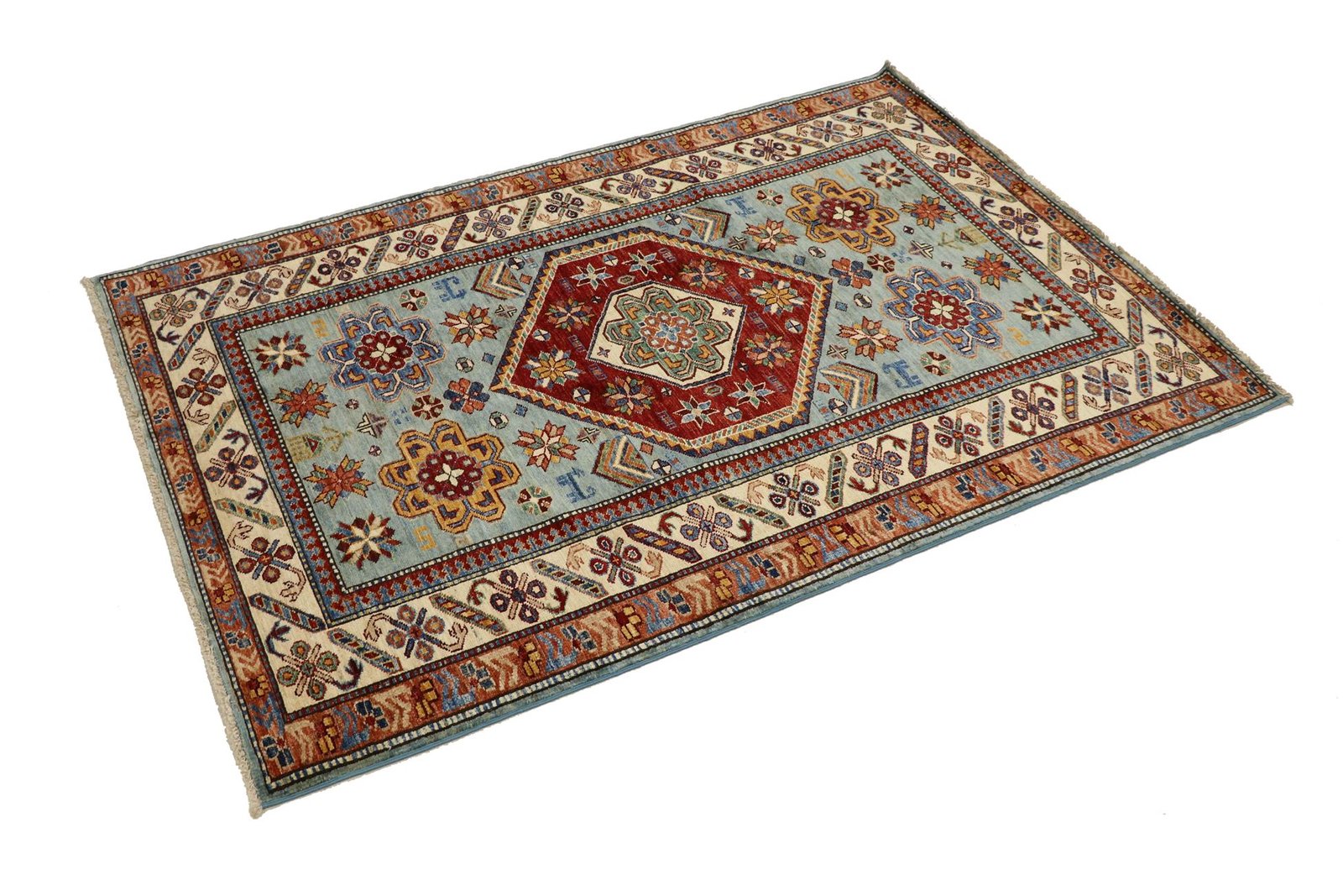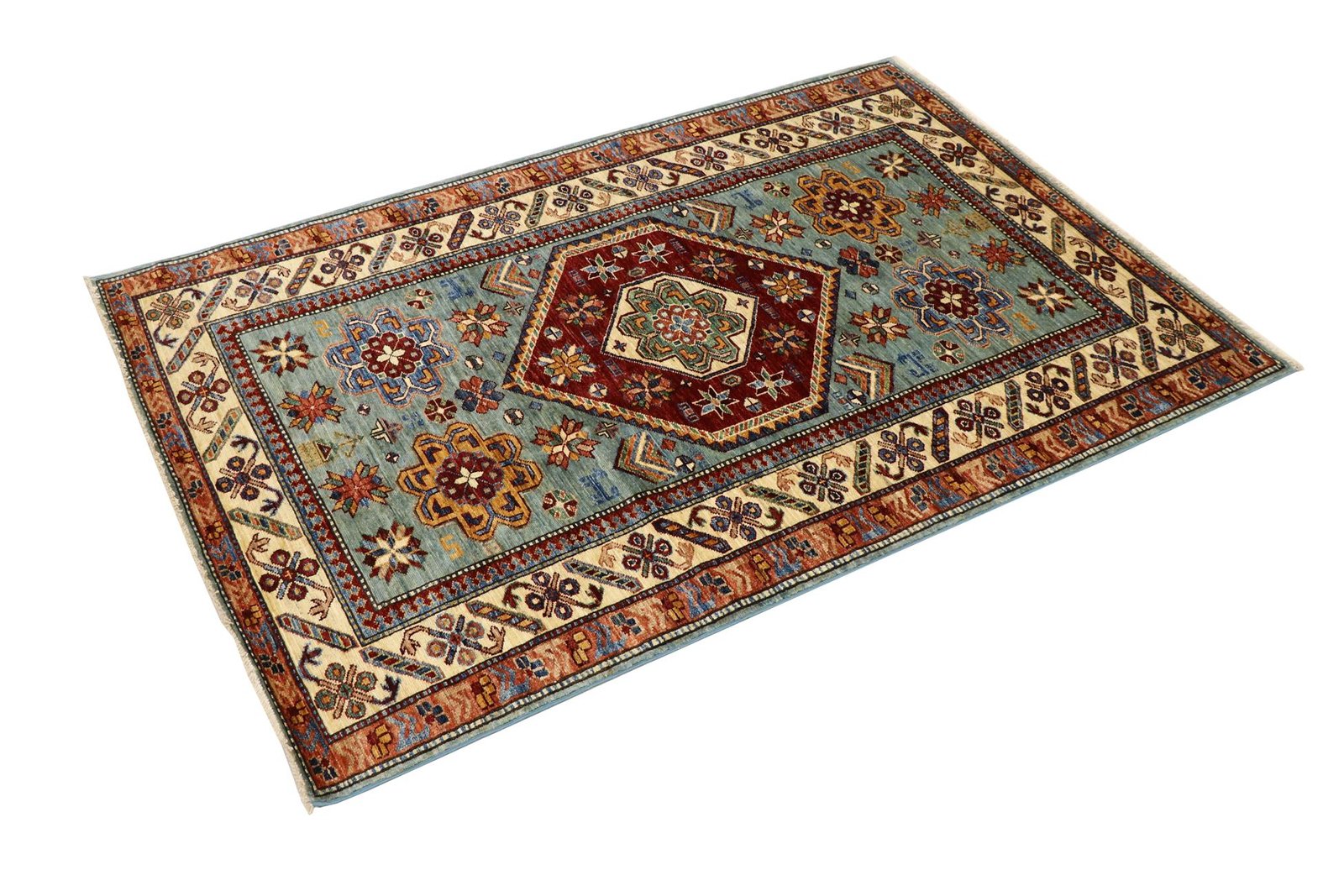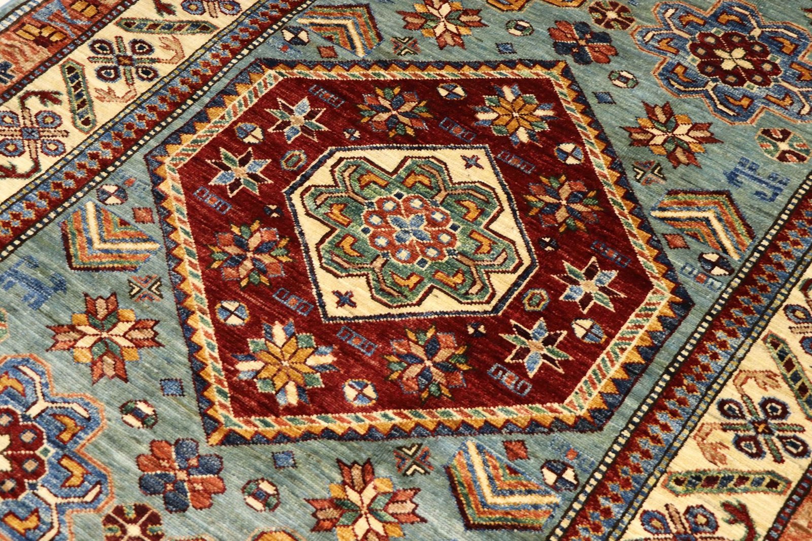 This hand-knotted Kazak is presented in the traditional style of Caucasian carpets and impresses with its exceptional robustness and vibrant colours. It captures the culture of the Caucasus in a harmonious composition that has been shaped by the artistry of carpet weaving for centuries. This art form combines charmingly simple patterns with impressively vibrant colours and reflects the long tradition of the region. Among Oriental carpets, this Kazak is one of the most sought-after both in the Orient and in Europe. Particularly noteworthy are the simplicity of the weave and the selected colour accents, which make this carpet ideal for combining with current interior design trends and preferences. It blends seamlessly into various living styles and brings cultural charm to modern interiors.