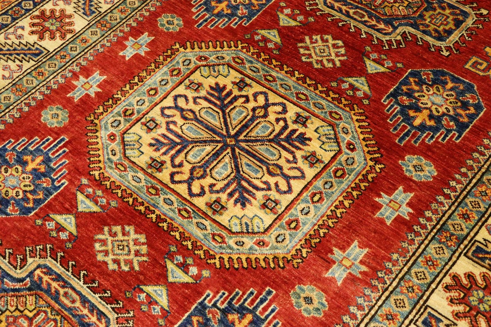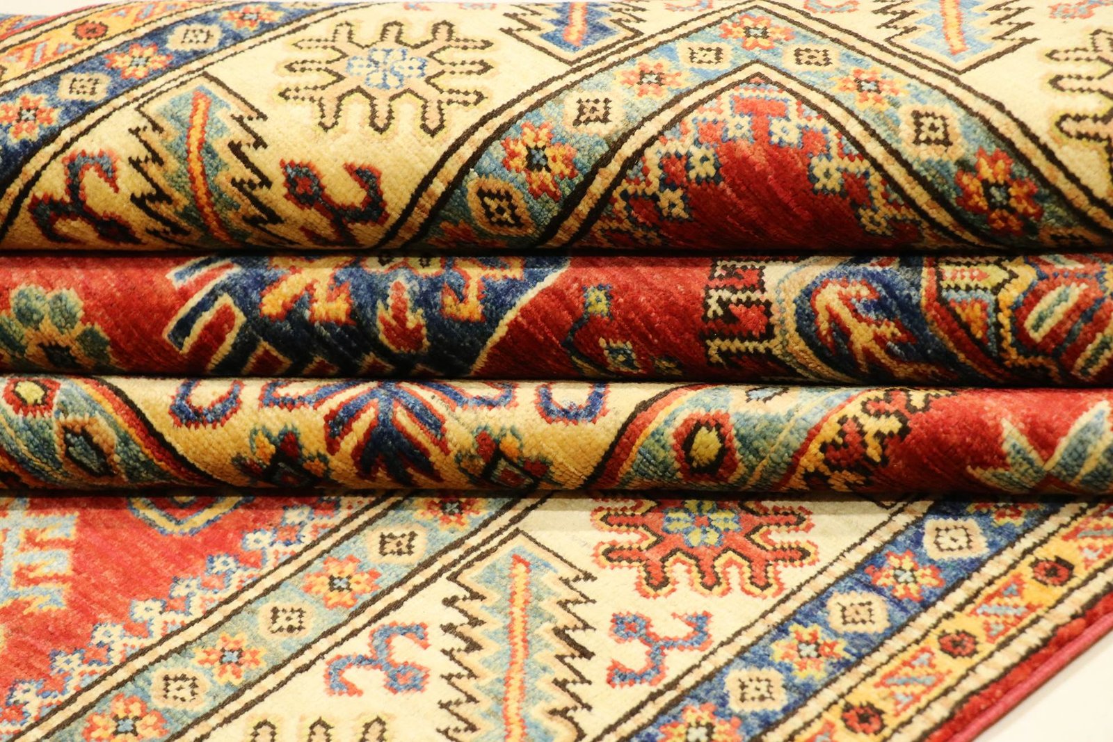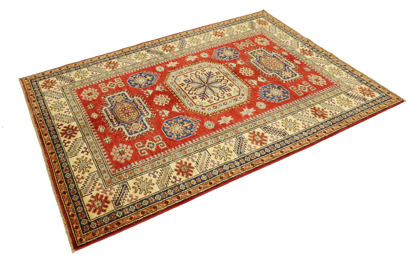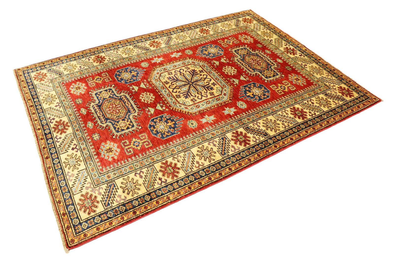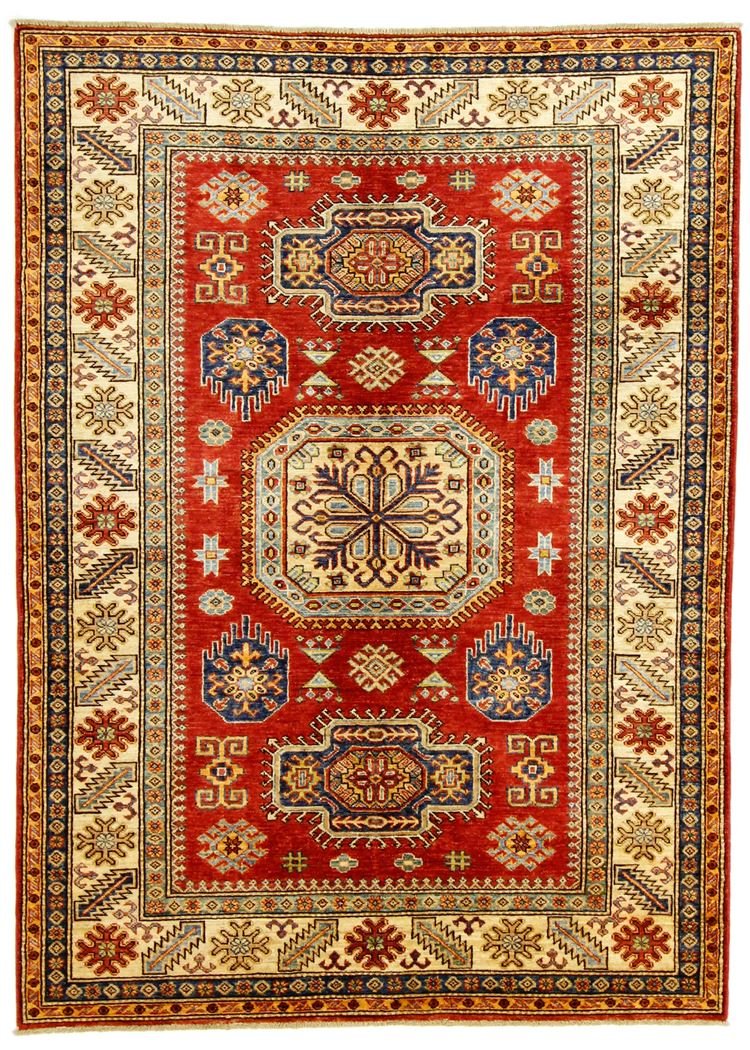 This hand-knotted Kazak carpet is a masterpiece of Caucasian carpet art, captivating with its high durability and vibrant colours. It captures the essence of Caucasian culture in an artistic composition that has preserved the tradition of carpet weaving for centuries. This culture produces simple yet fascinating patterns in vibrant colours. Among Oriental carpets, this Kazak is particularly sought after, both in the Orient and in Europe. Its simple patchwork and deliberate use of colour accents make it particularly adaptable to modern interior design trends and preferences. It combines traditional craftsmanship with contemporary design and is an ideal addition to a variety of interiors seeking a stylish and culturally rich touch.