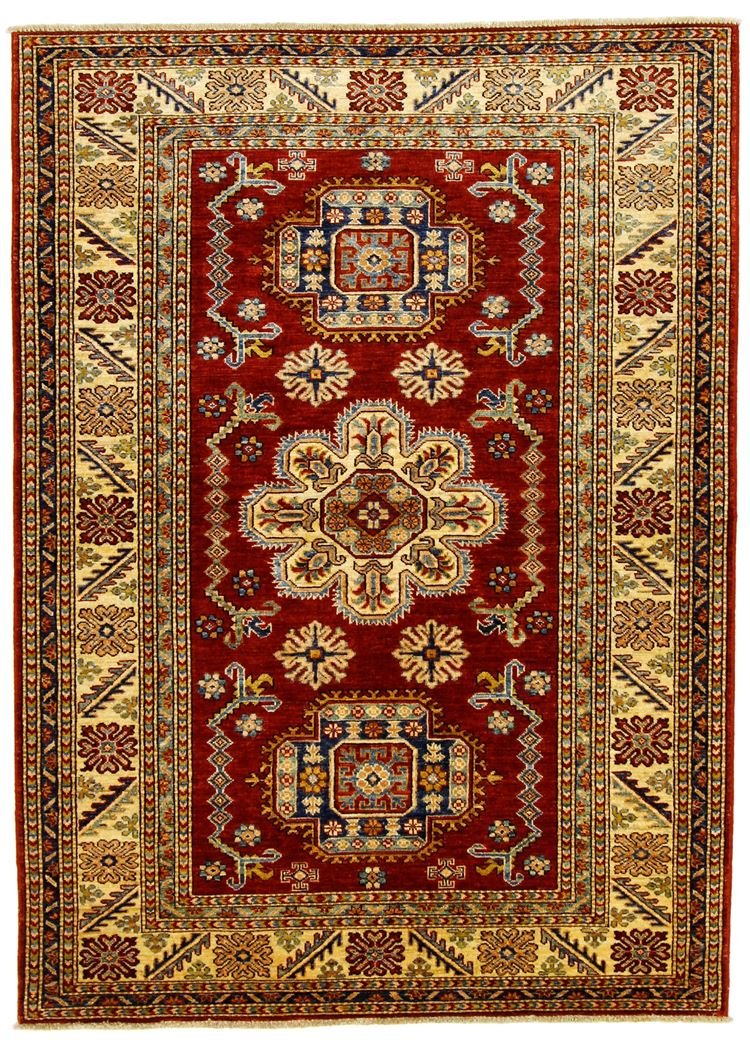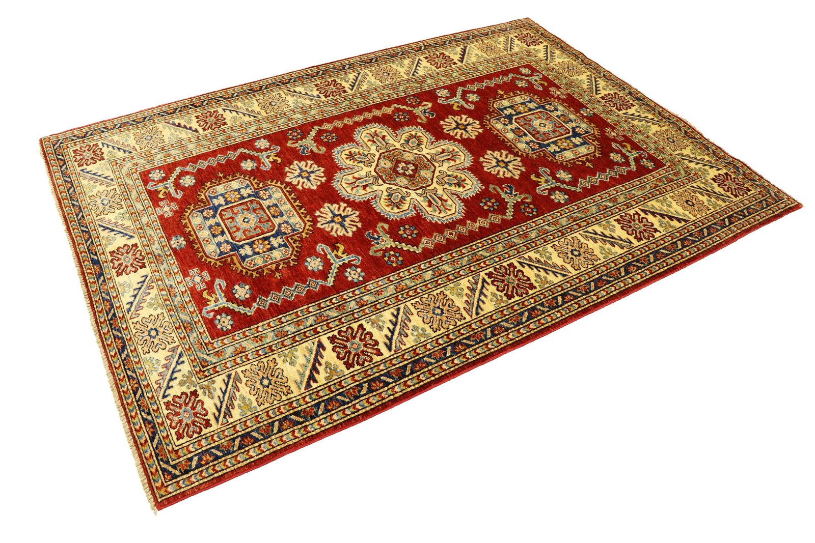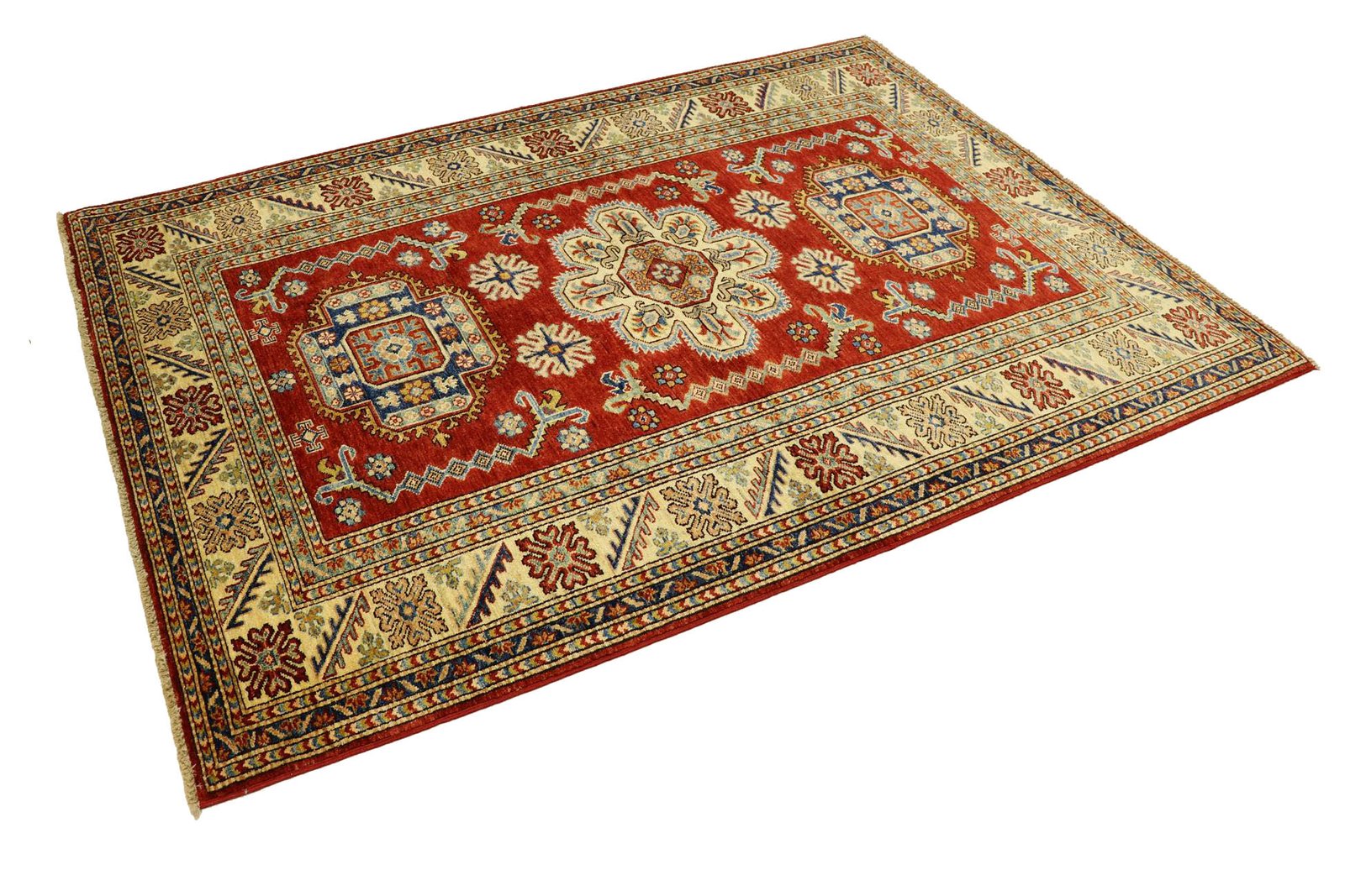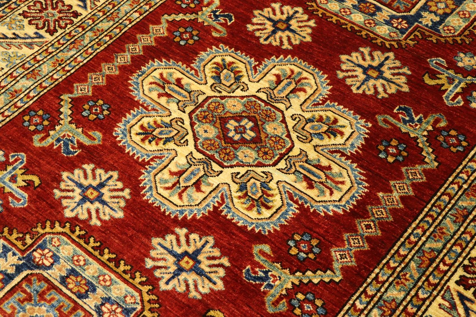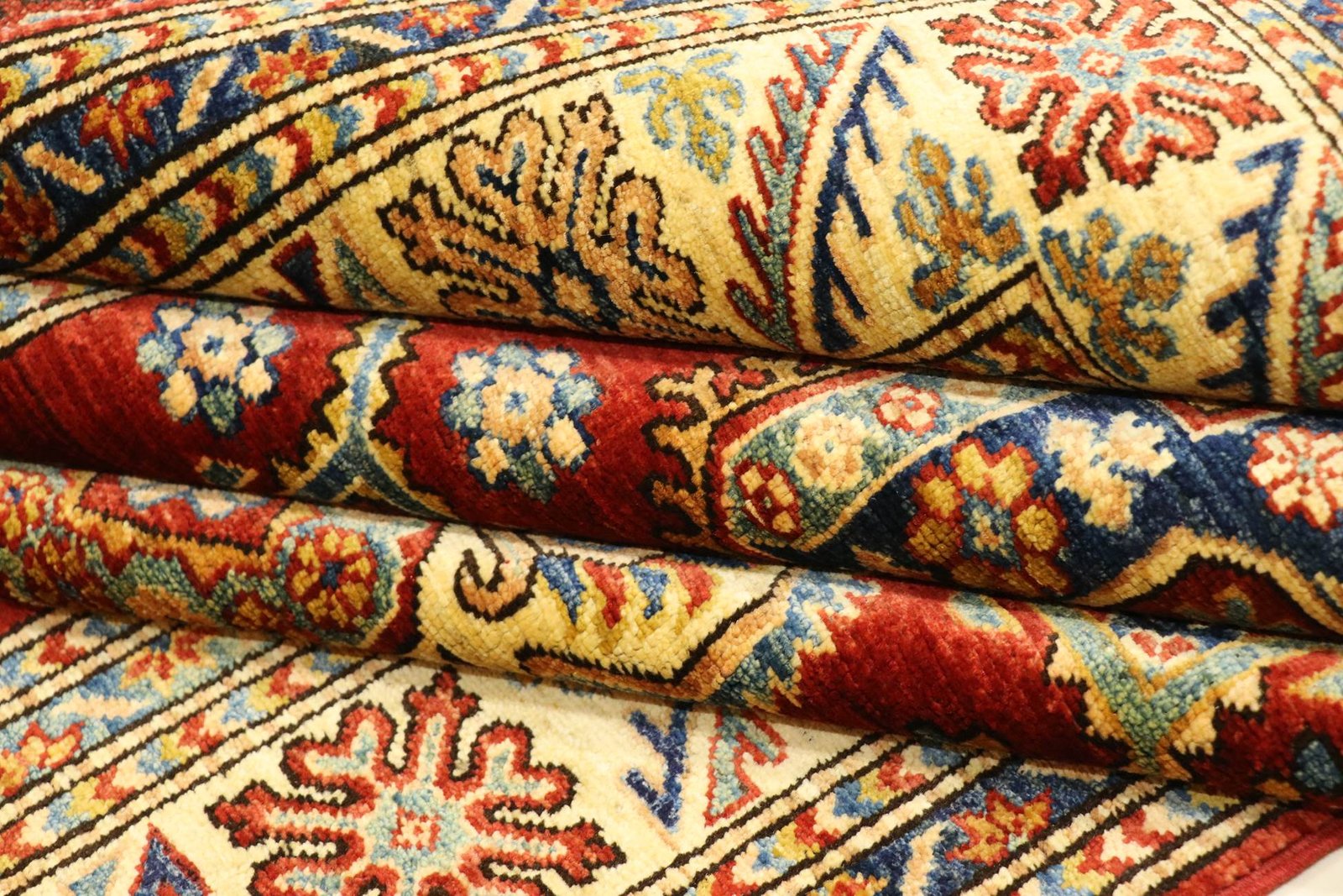 This hand-knotted Kazak rug was made in the traditional style of Caucasian rugs and impresses with its high durability and vibrant colours. It captures the rich culture of the Caucasus in a magnificent composition. This culture, which has mastered the art of carpet weaving for centuries, is characterised by simple but attractive patterns and impressively vibrant colours. Among Oriental carpets, this Kazak is particularly sought after, both in the Orient and in Europe. The simple patchwork and skilfully applied colour accents make this carpet ideal for modern interior design trends and preferences. It combines cultural heritage with contemporary style and is a perfect addition to various interior styles.