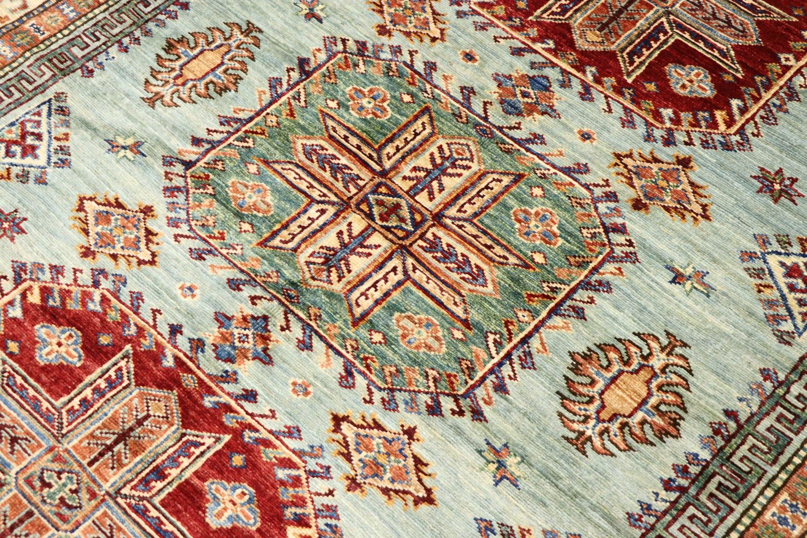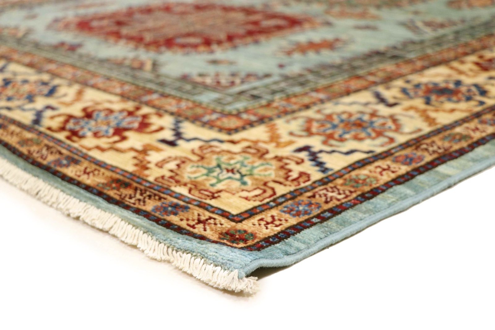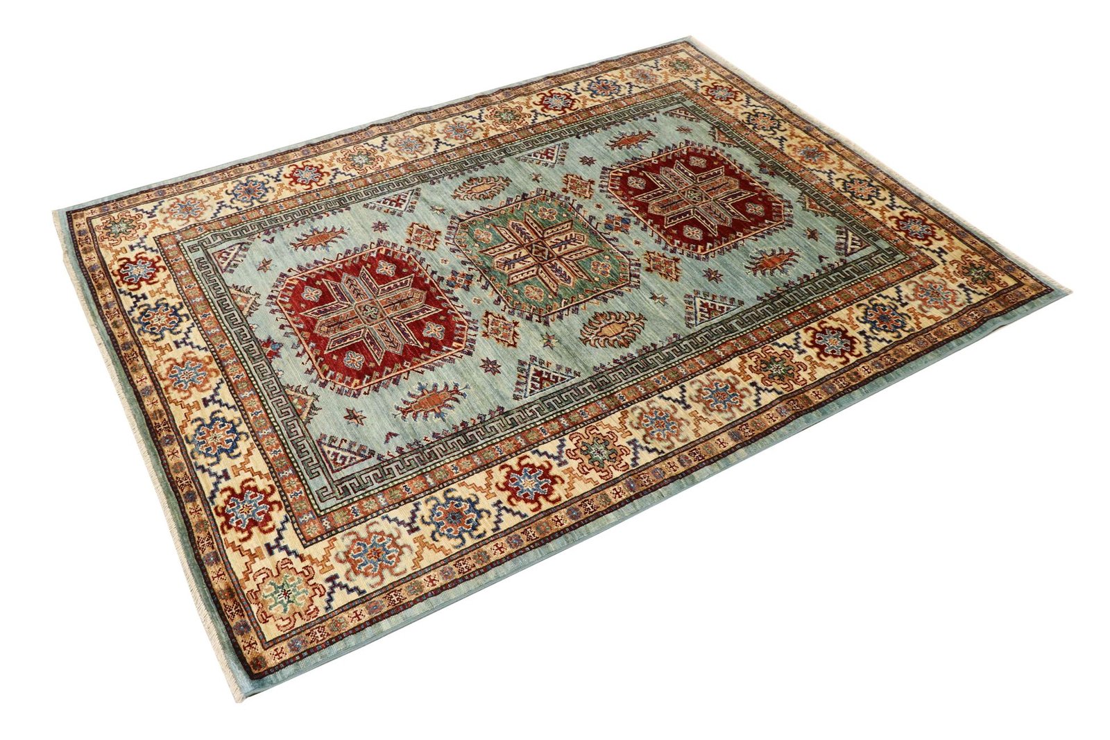 This hand-knotted Kazak carpet, masterfully crafted in the traditional style of Caucasian carpets, impresses with its high durability and vibrant colours. It represents the rich culture of the Caucasus in an enchanting composition that reflects the centuries-old tradition of carpet weaving. This art is known for its simple yet aesthetically pleasing shapes that shine in vibrant colours. Among Oriental carpets, this Kazak is particularly sought after, both in the Orient and in Europe. Its simple patchwork and carefully selected colour accents make it an ideal choice for modern interiors. The carpet combines traditional craftsmanship with contemporary design and can be perfectly integrated into current interior design trends, adding a special touch to any room.