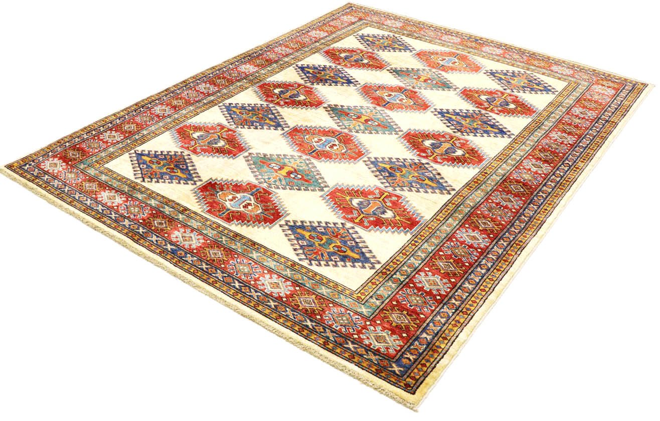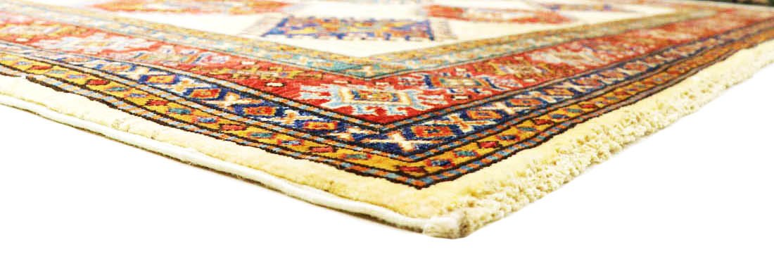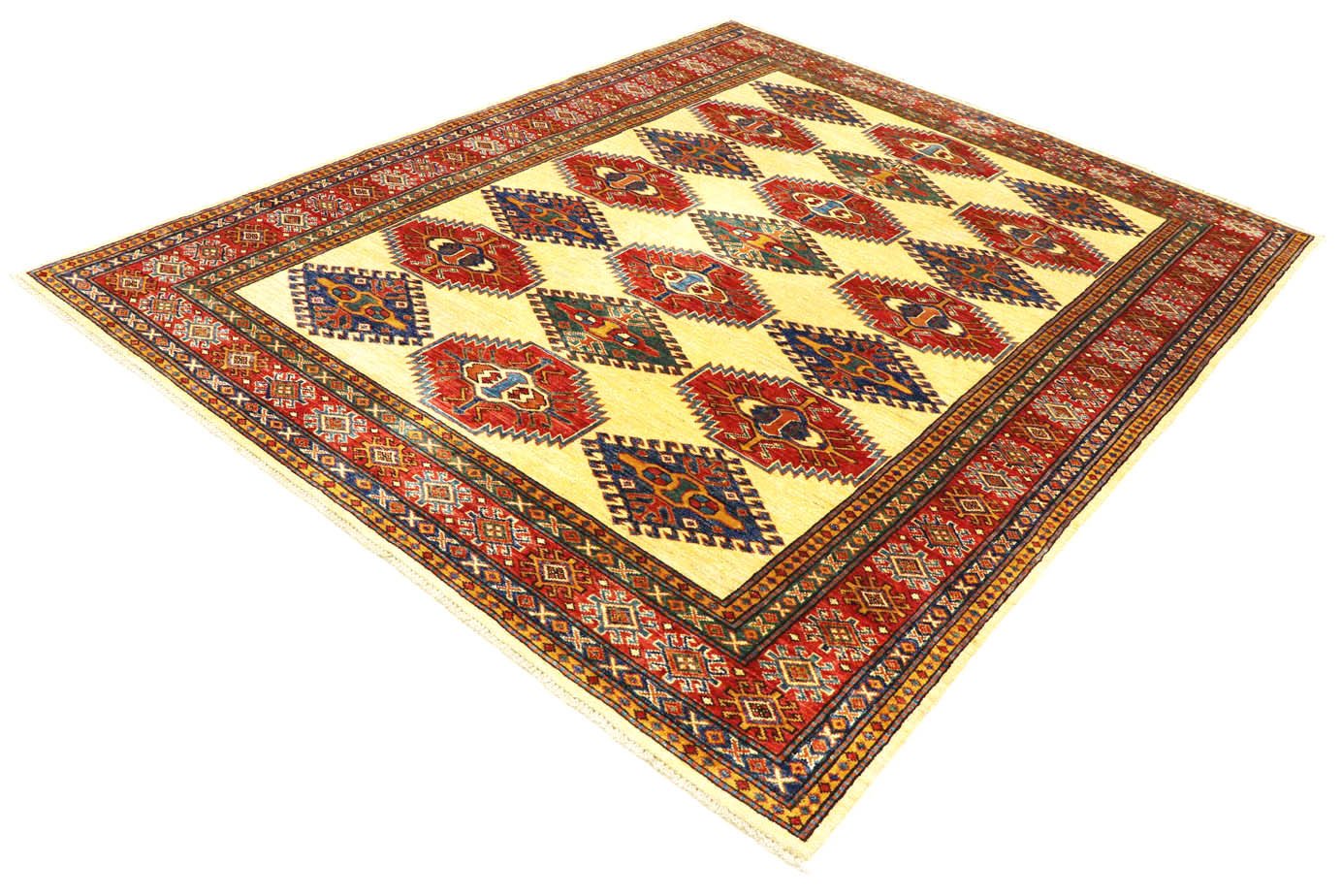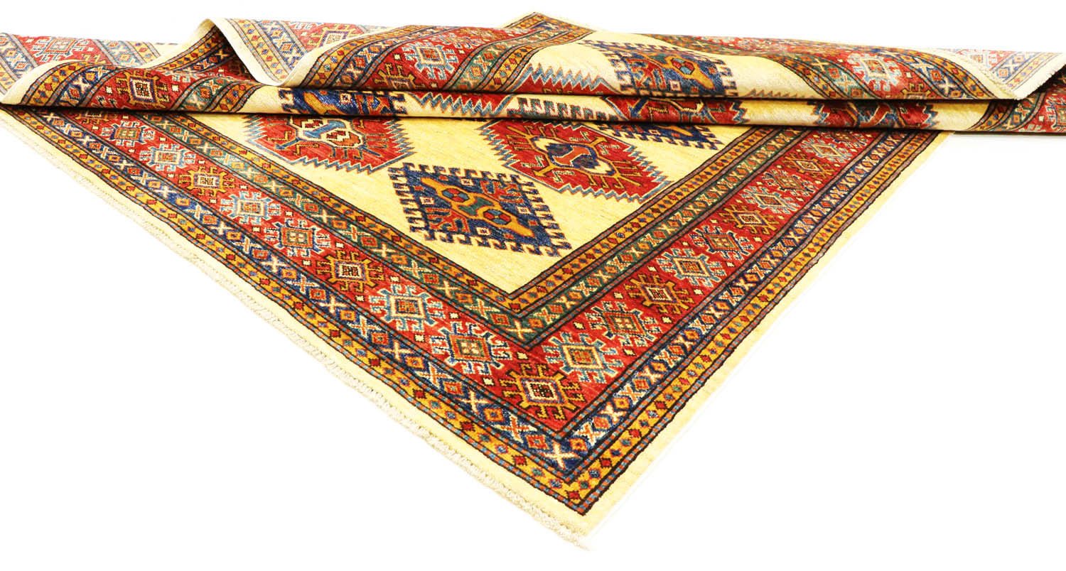 This hand-knotted Kazak, made in the traditional style of Caucasian carpets, impresses with its high durability and vibrant colours. It reflects the rich culture of the Caucasus, which has been known for its art of carpet weaving for centuries. Carpets from this region are characterised by simple yet appealing patterns in bright colours that impressively showcase the cultural heritage. Among Oriental carpets, this Kazak is particularly sought after, both in the Orient and in Europe. Its simple patchwork and skilful use of colour accents make it an ideal choice for modern interiors. These carpets combine traditional craftsmanship with contemporary style, making them perfect for current interior design trends.