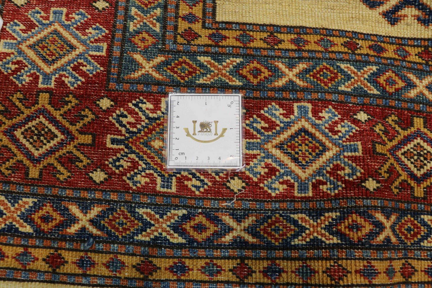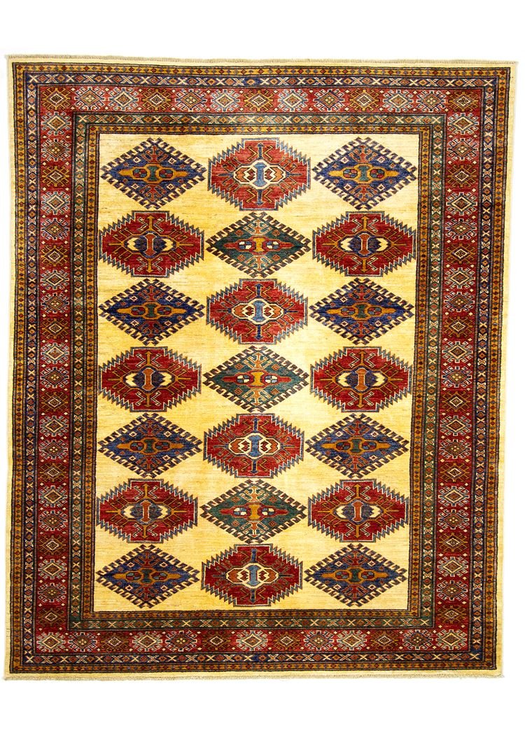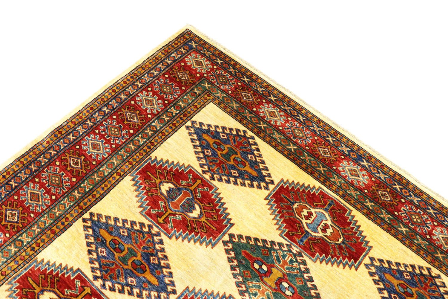 This hand-knotted Kazak, made in the traditional style of Caucasian carpets, impresses with its high durability and vibrant colours. It reflects the rich culture of the Caucasus, which has been known for its art of carpet weaving for centuries. Carpets from this region are characterised by simple yet appealing patterns in bright colours that impressively showcase the cultural heritage. Among Oriental carpets, this Kazak is particularly sought after, both in the Orient and in Europe. Its simple patchwork and skilful use of colour accents make it an ideal choice for modern interiors. These carpets combine traditional craftsmanship with contemporary style, making them perfect for current interior design trends.